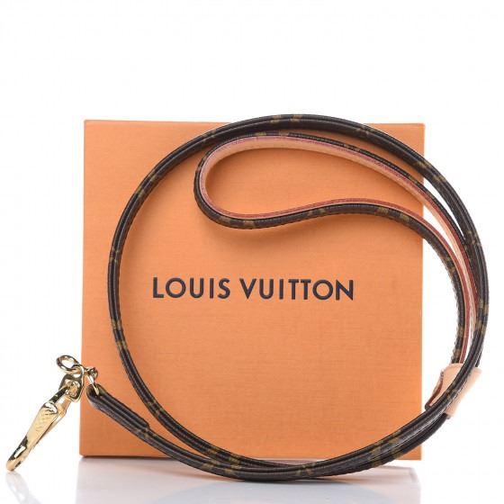 This leash is crafted of traditional Louis Vuitton monogram on toile coated canvas. It features an adjustable grip lined with vachetta cowhide leather and a brass clasp.
