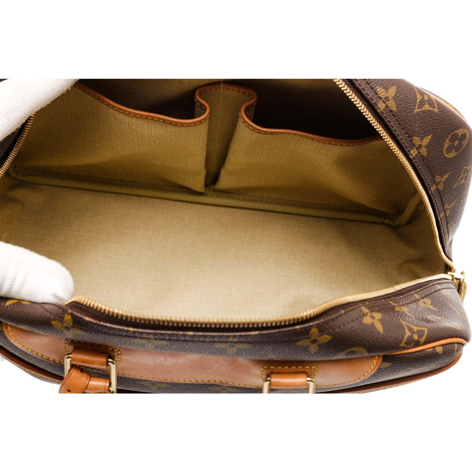 Description: Louis Vuitton Monogram Canvas Leather Deauville Doctor Bag. Brown and tan monogram coated canvas Louis Vuitton Deauville Bag with brass hardware, tan vachetta leather lining, dual rolled handles, single open compartment at exterior front, creme canvas lining, four open pockets at interior wall and two-way zip closures at top.