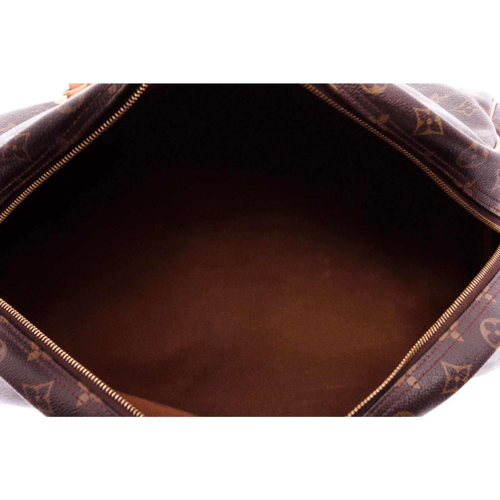 Brown and tan monogram coated canvas Louis Vuitton Montorgueil GM with brass hardware, dual flat shoulder straps, logo placard at front, yellow stitching, tan vachetta leather trim, brown canvas lining, single pocket at interior wall and zip closure at top.