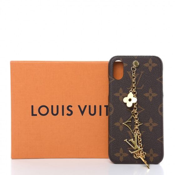 Crafted of monogram coated canvas and features a polished brass chain-link strap with Louis Vuitton monogram charms. The case holds an iPhone X/XS perfectly with a dark brown microfiber interior.