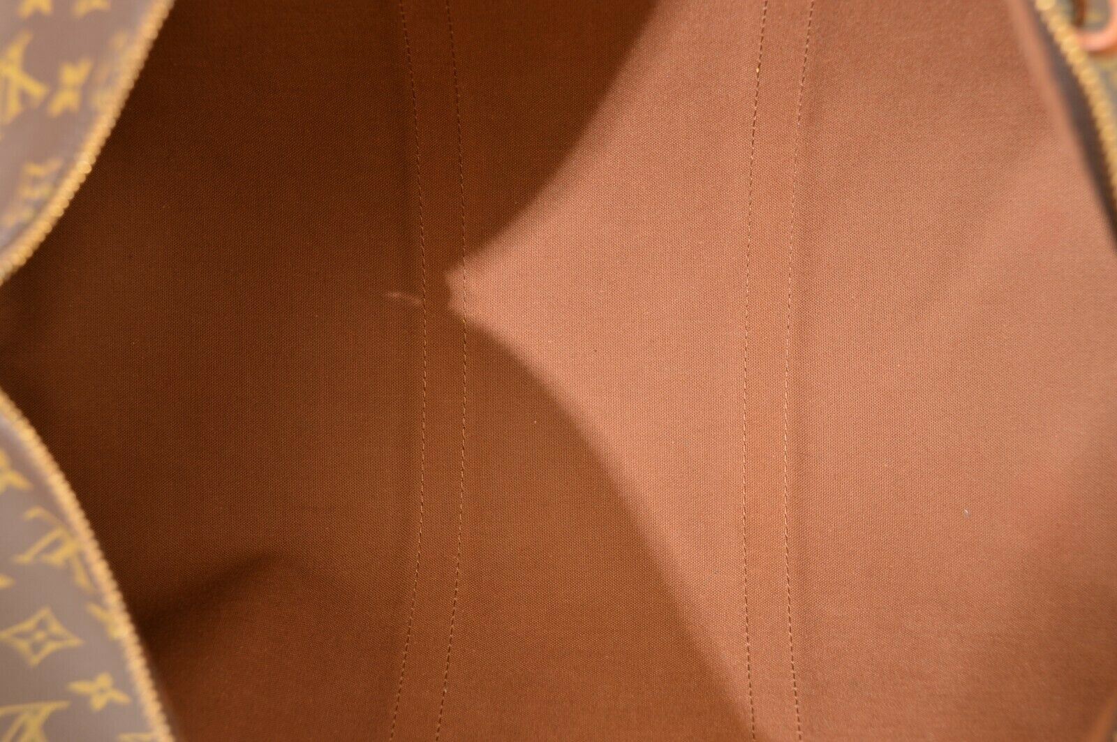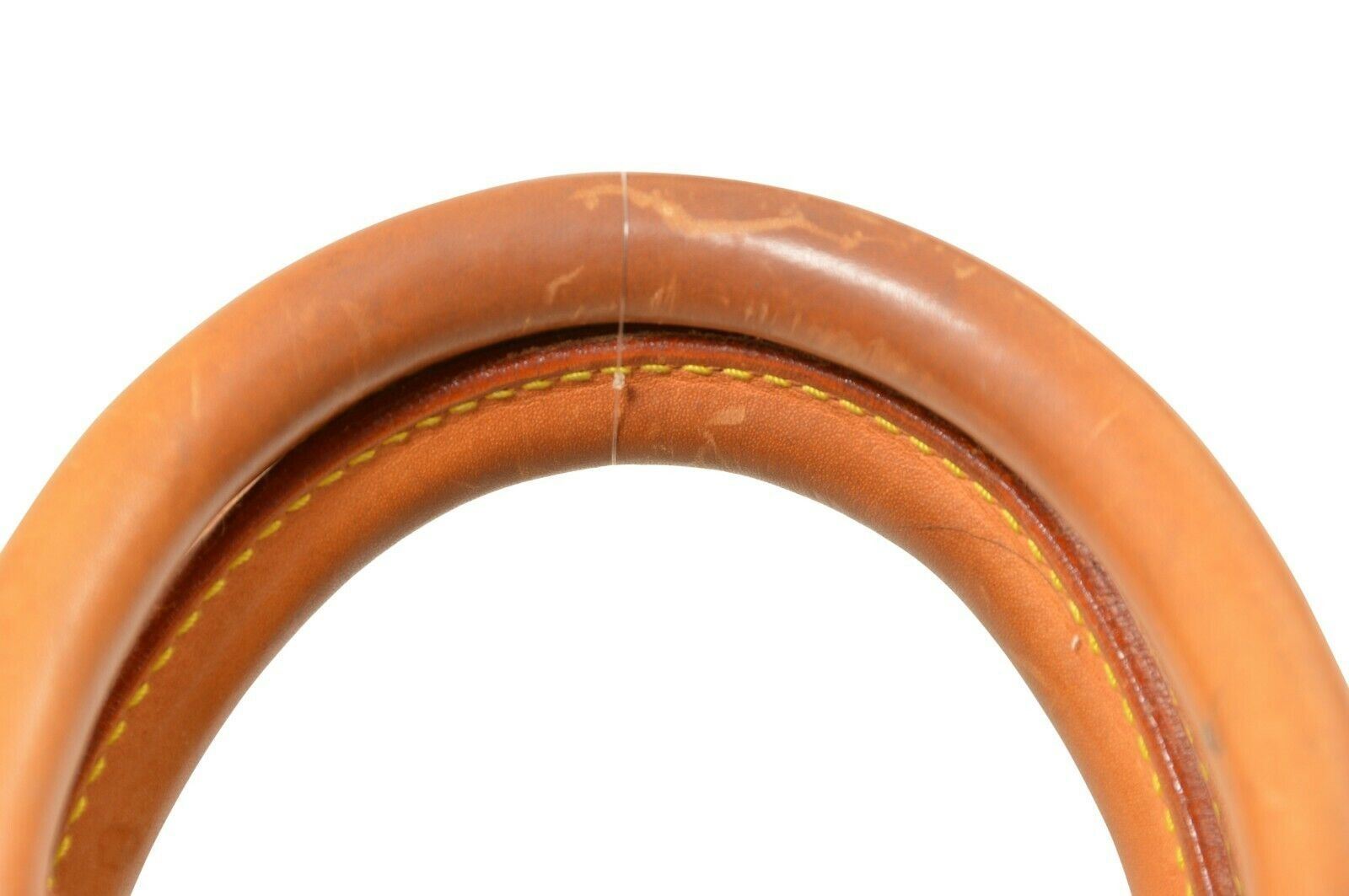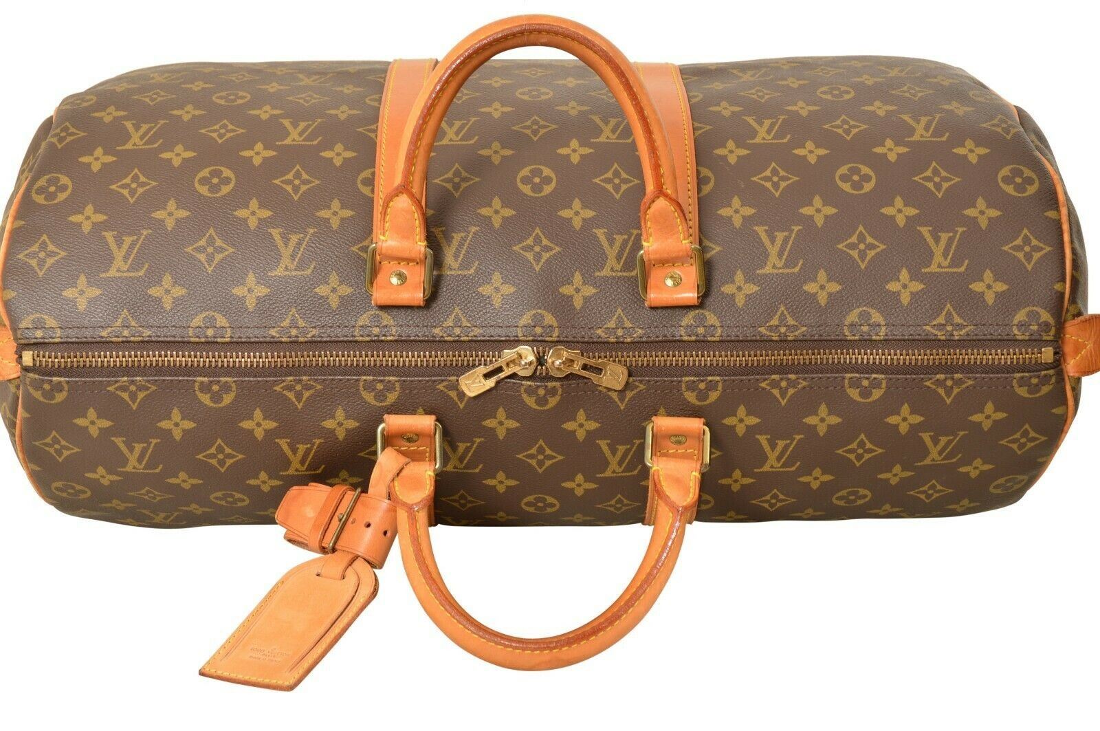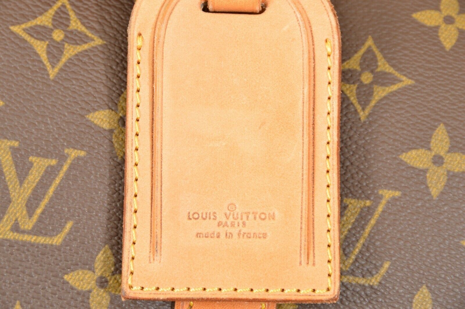 Crafted of signature Louis Vuitton monogram coated canvas. The bag features vachetta leather trim, rolled top handles and brass hardware. The top zippers open to a spacious cocoa brown fabric interior.