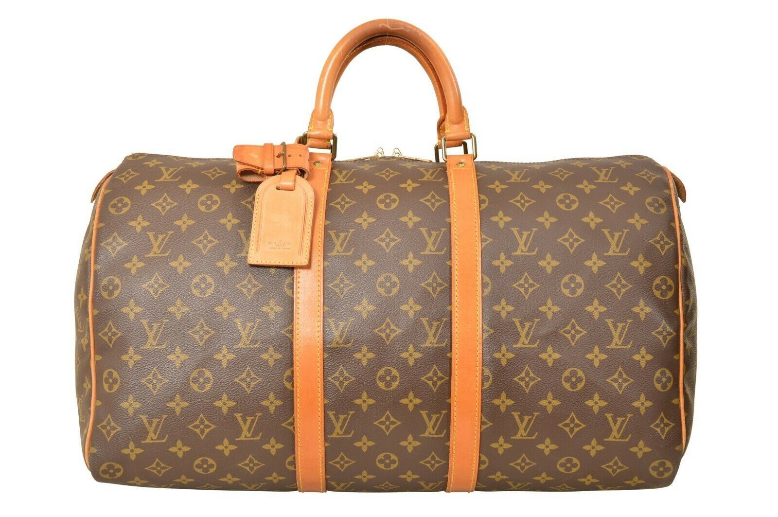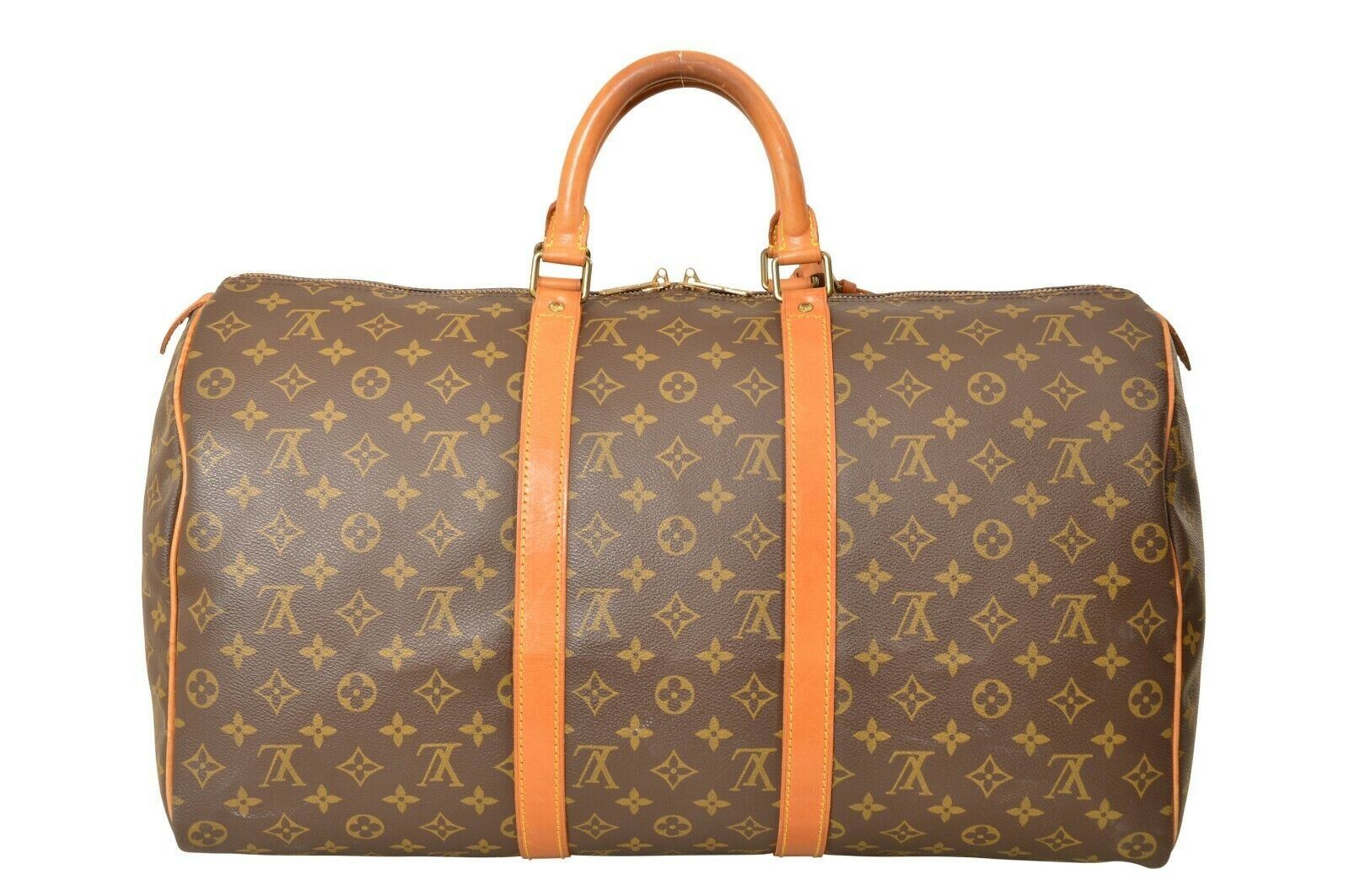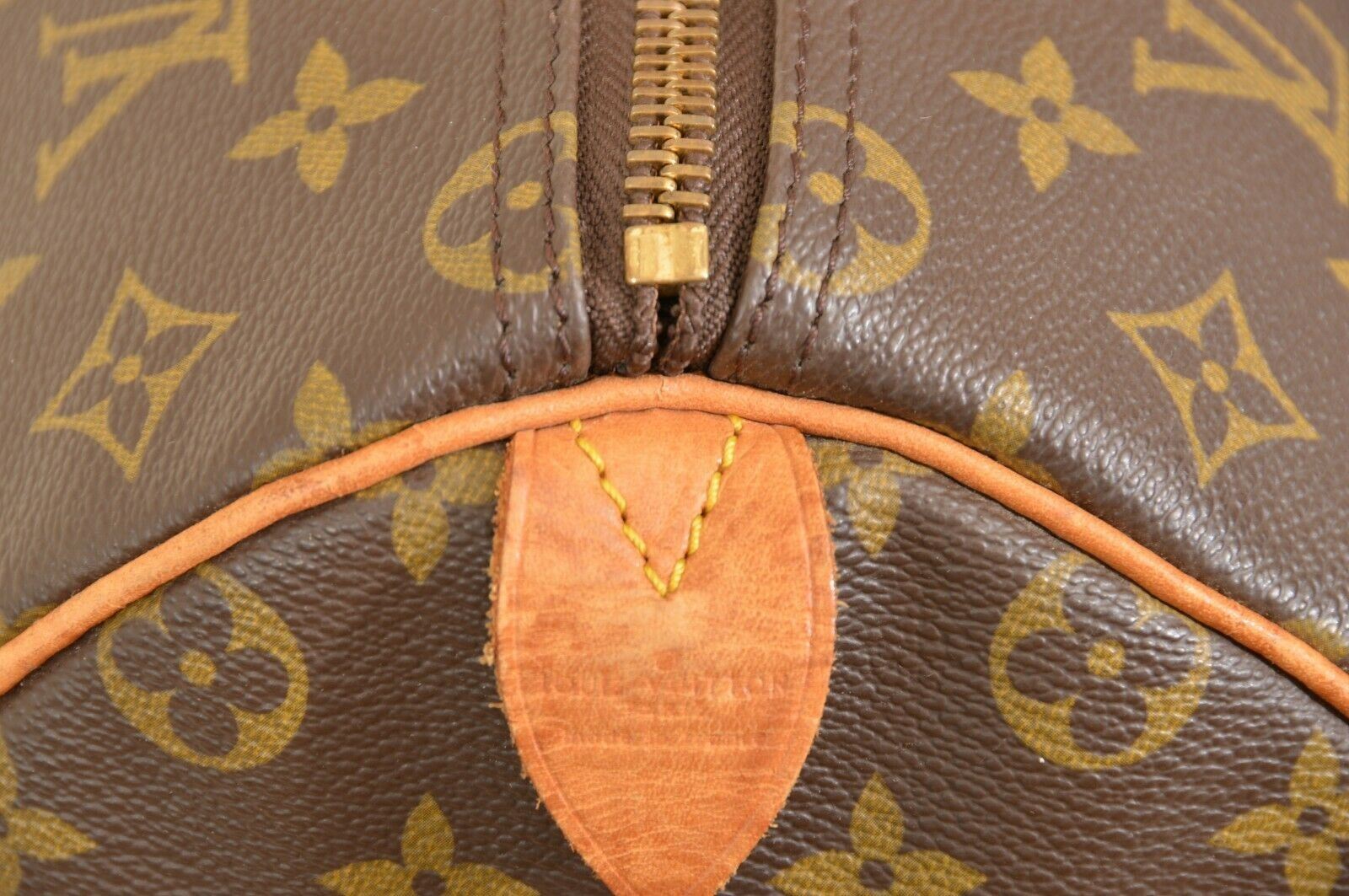 Crafted of signature Louis Vuitton monogram coated canvas. The bag features vachetta leather trim, rolled top handles and brass hardware. The top zippers open to a spacious cocoa brown fabric interior.