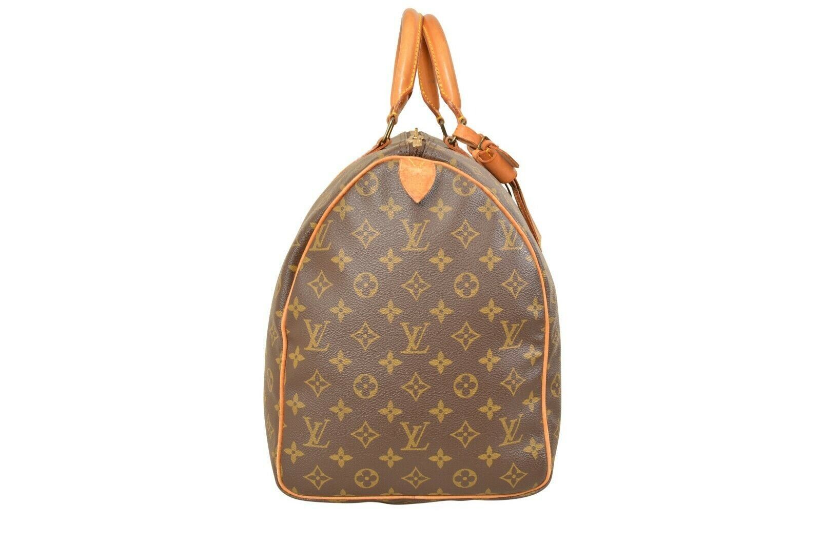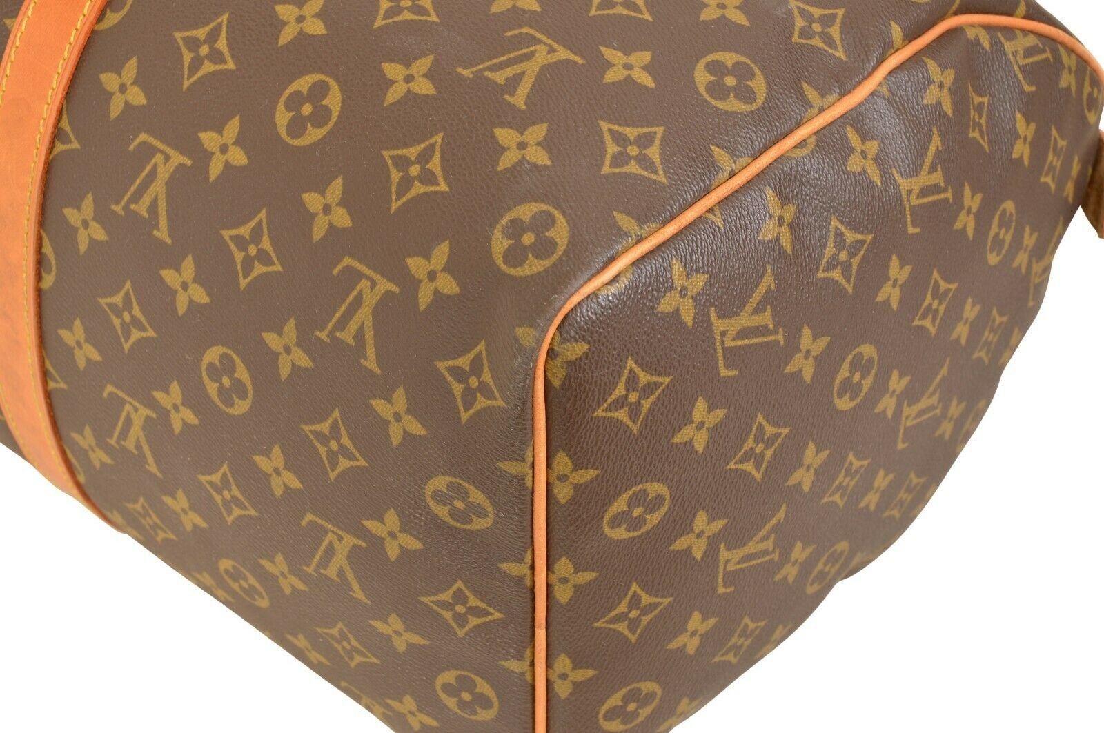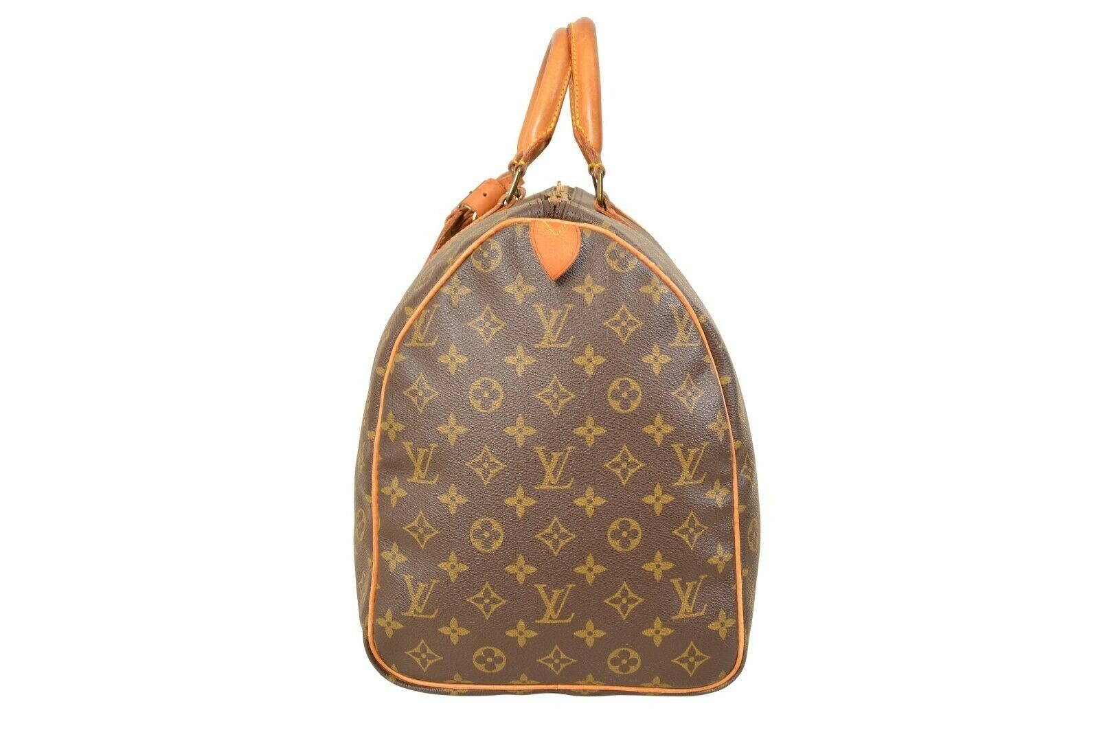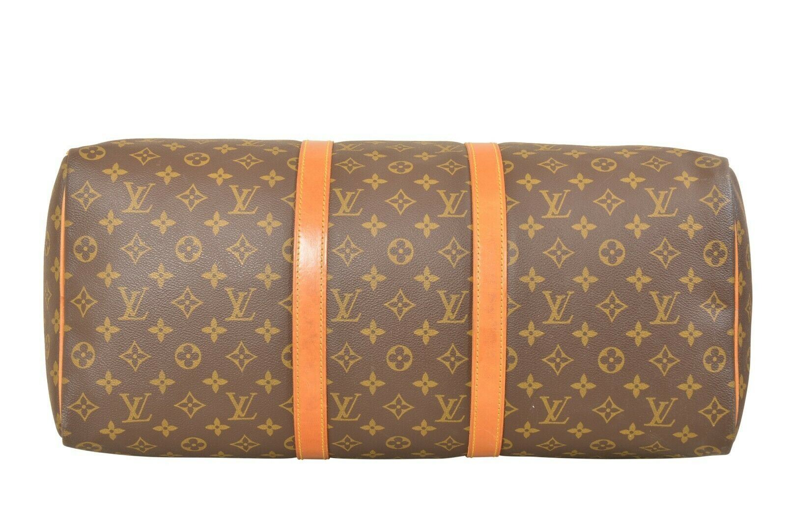 Crafted of signature Louis Vuitton monogram coated canvas. The bag features vachetta leather trim, rolled top handles and brass hardware. The top zippers open to a spacious cocoa brown fabric interior.