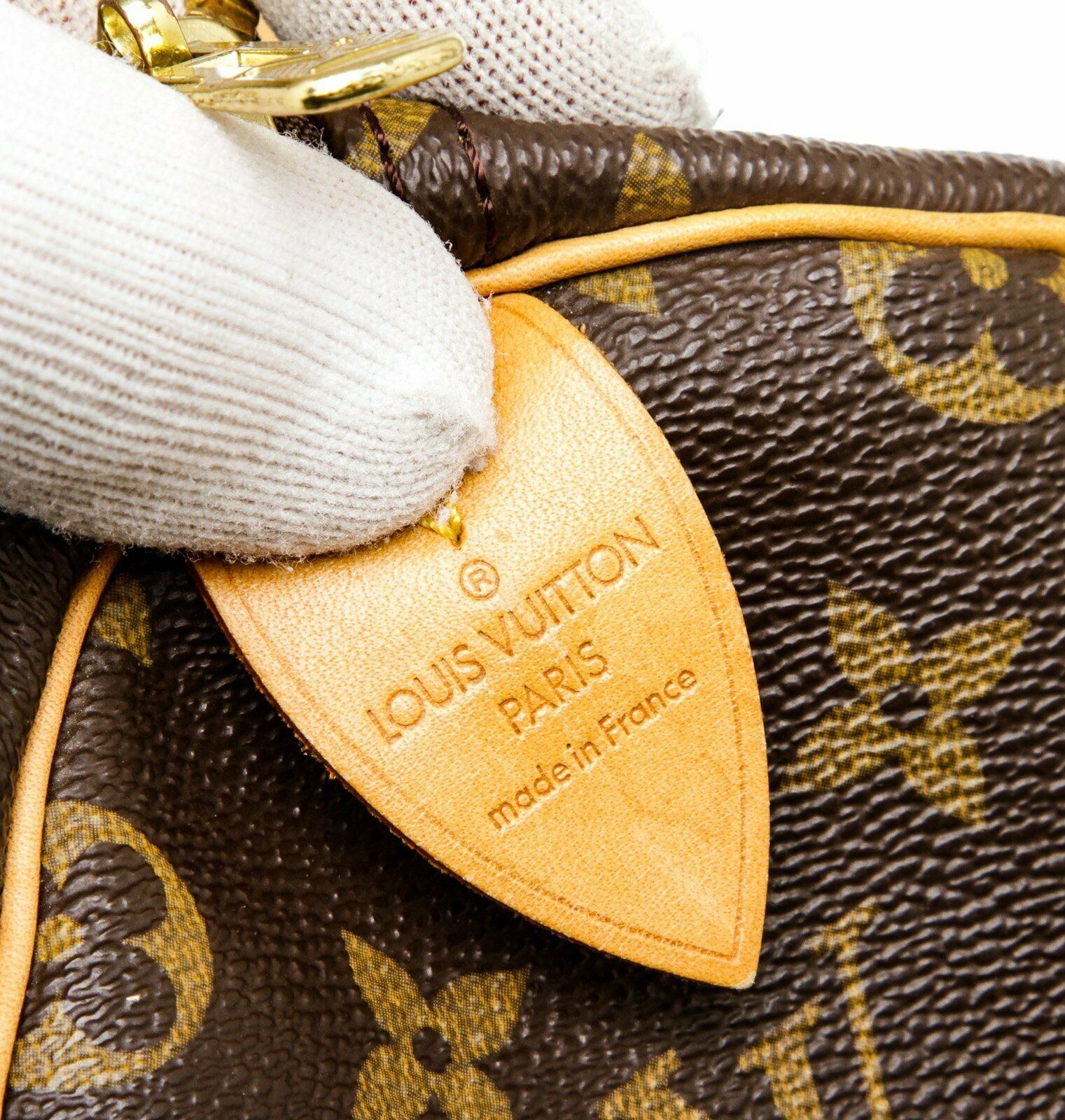 Brown monogram coated canvas Louis Vuitton Keepall 50 cm with brass hardware, tan vachetta leather trim, dual rolled handles, hanging luggage tag, brown canvas lining and zip closure at top.