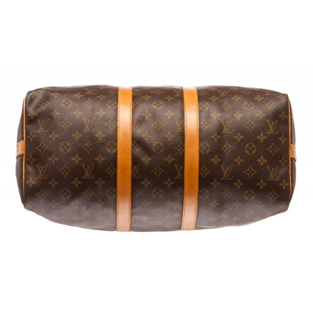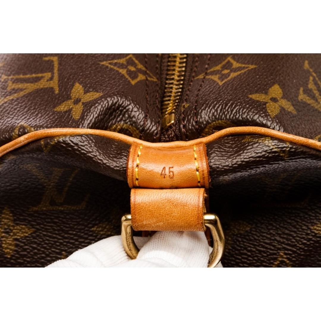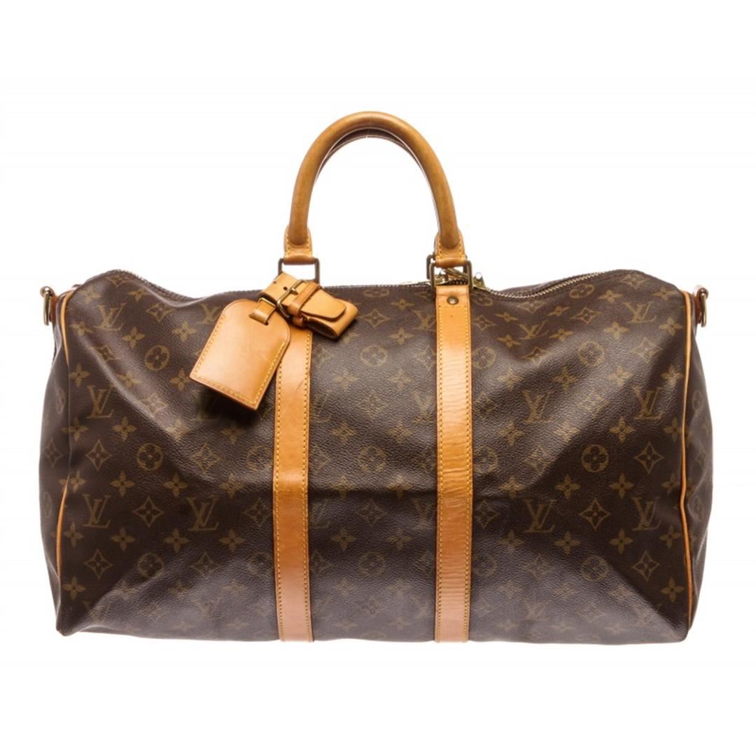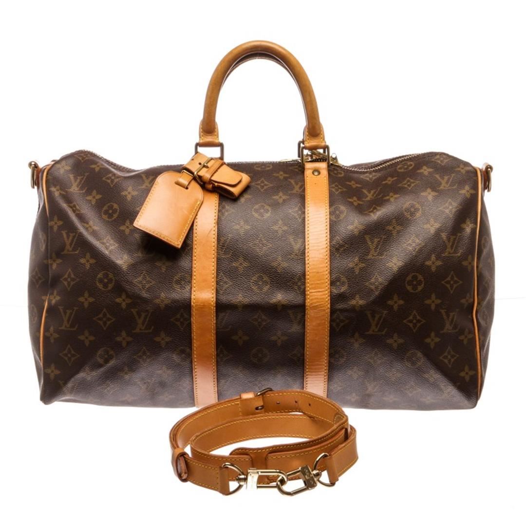 Brown and tan monogram coated canvas Louis Vuitton Keepall Bandoulière 45 with brass hardware, tan vachetta leather trim, dual rolled top handles, detachable adjustable shoulder strap, brown canvas lining and two-way zip closure at top.