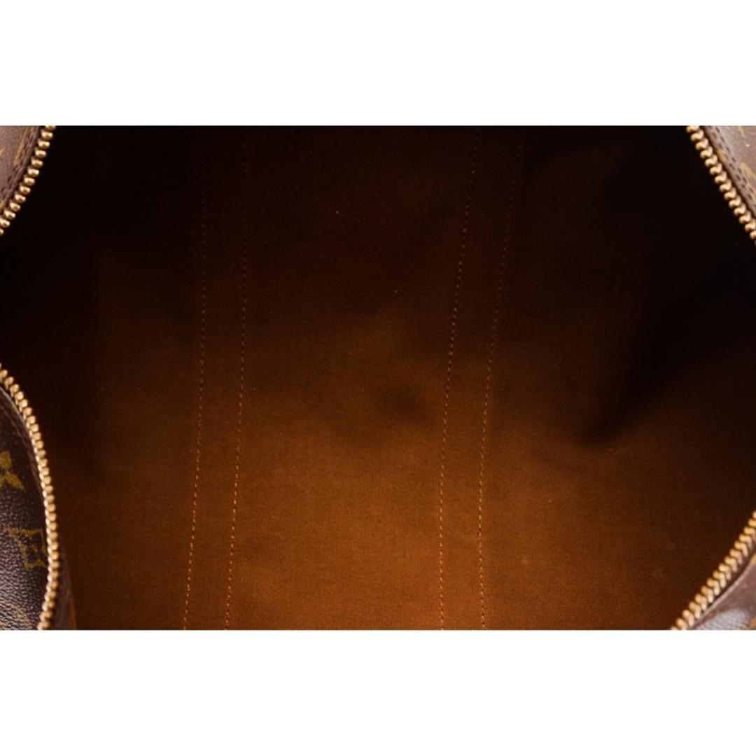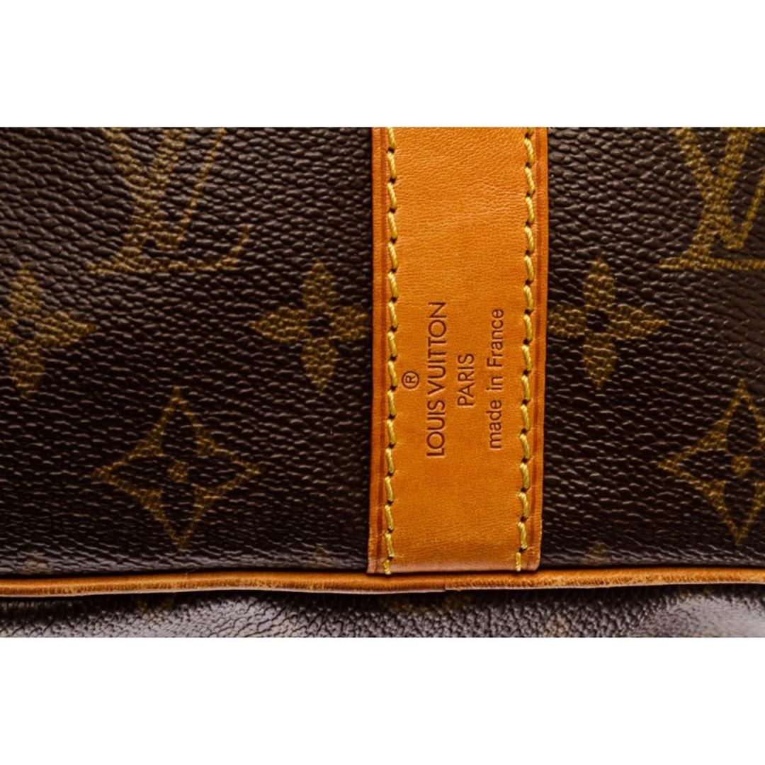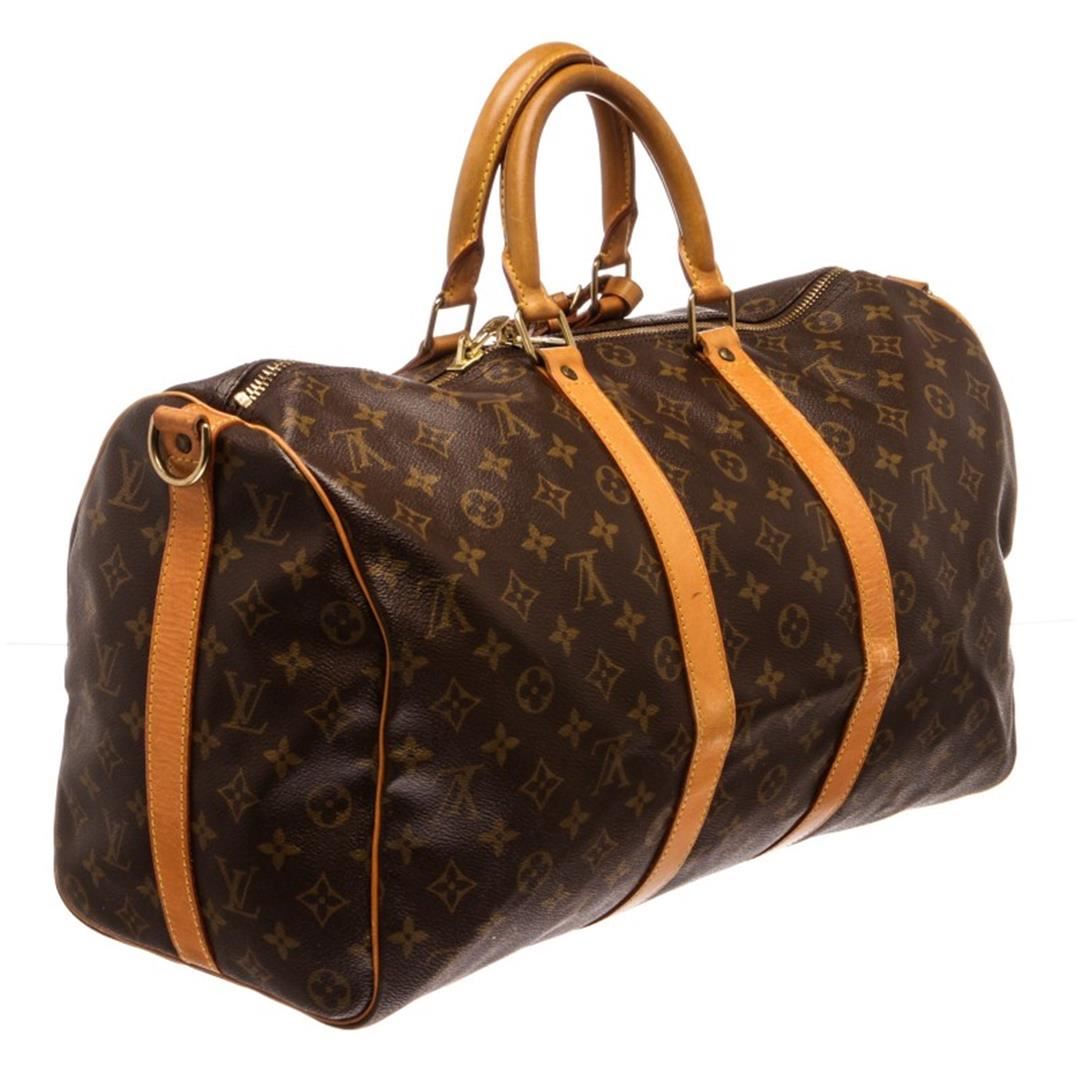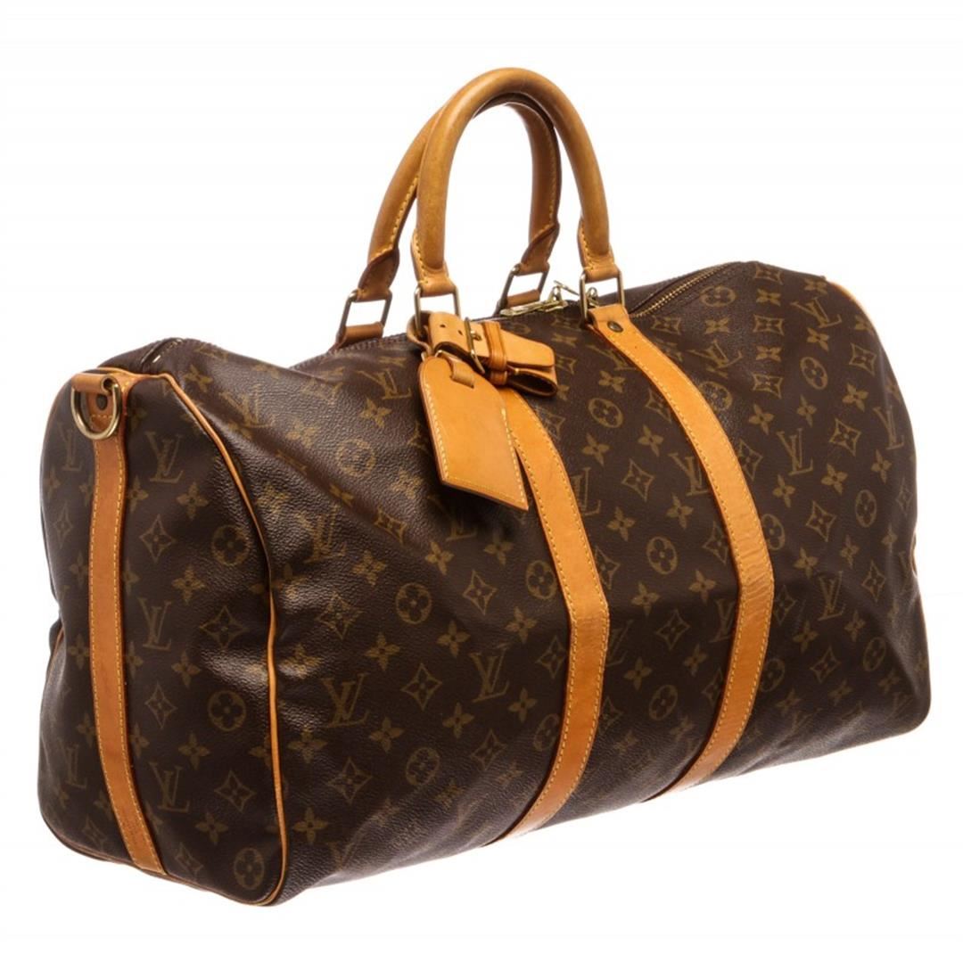 Brown and tan monogram coated canvas Louis Vuitton Keepall Bandoulière 45 with brass hardware, tan vachetta leather trim, dual rolled top handles, detachable adjustable shoulder strap, brown canvas lining and two-way zip closure at top.
