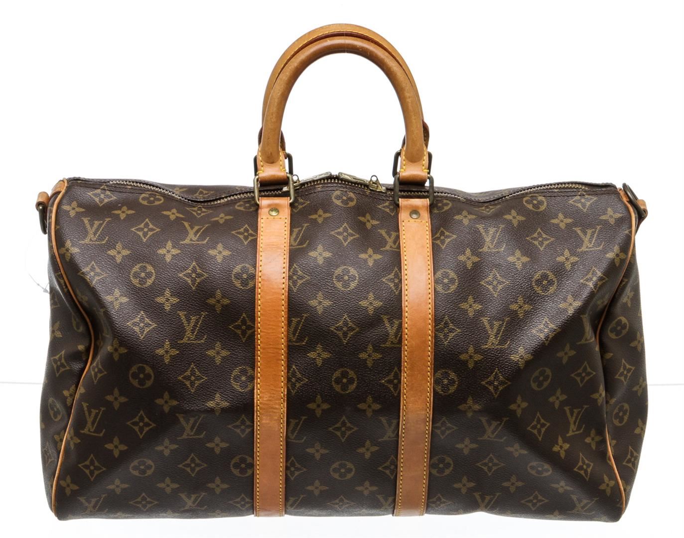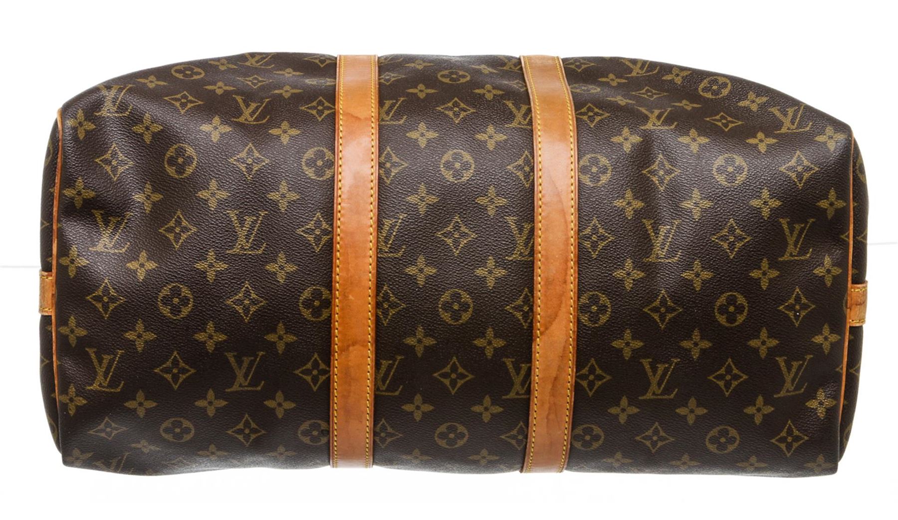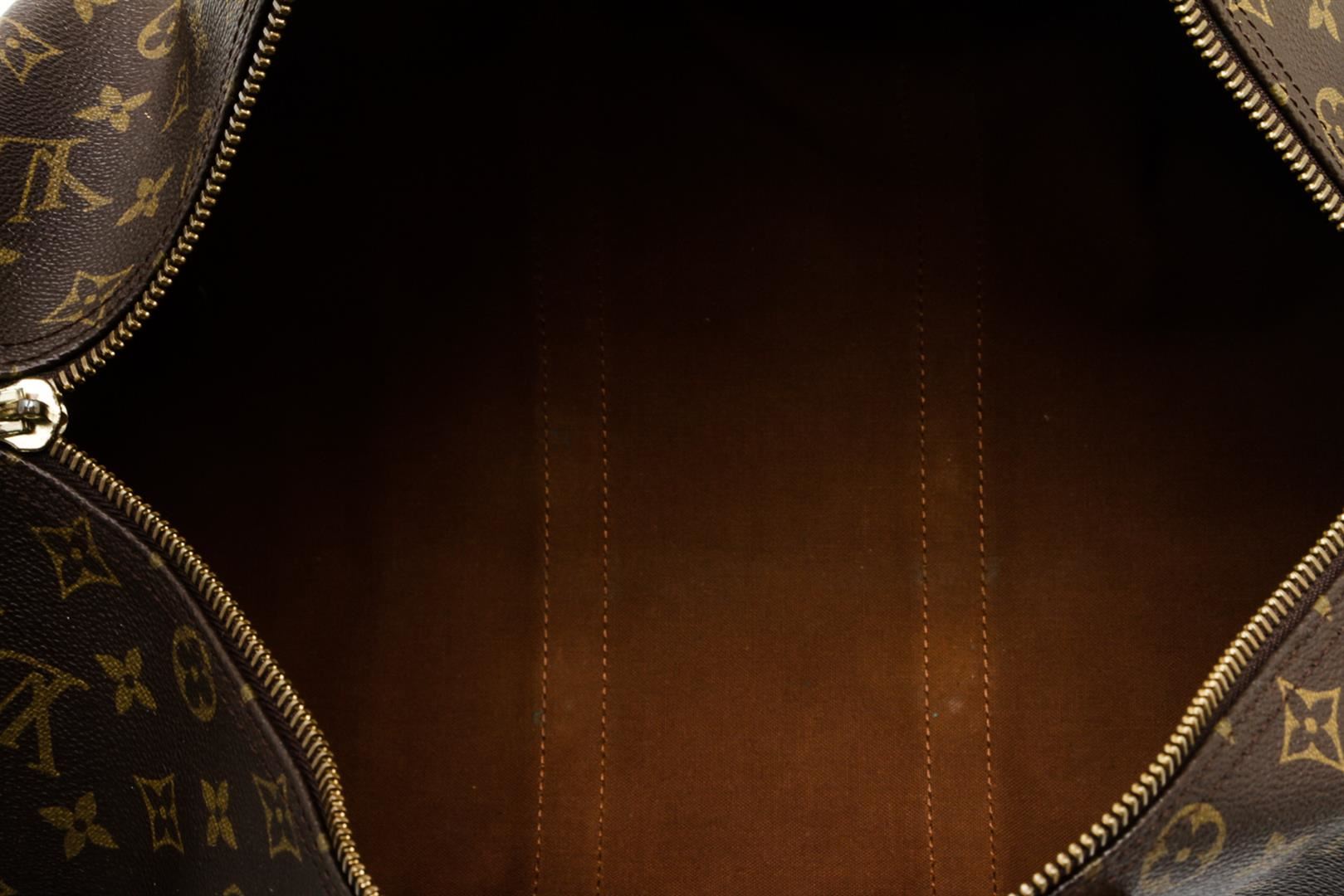 One Louis Vuitton Monogram Keepall Bandouliere 45 cm Duffle Bag. Brown and tan monogram coated canvas Louis Vuitton Keepall Bandouliere with brass hardware, tan vachetta leather trim, dual rolled top handle, brown canvas lining and two-way zip closure at top. Detachable shoulder strap NOT included.