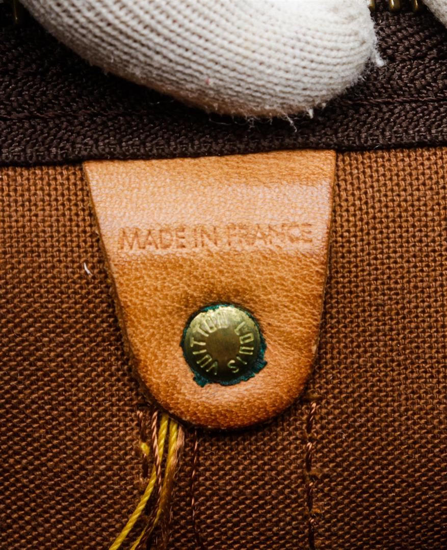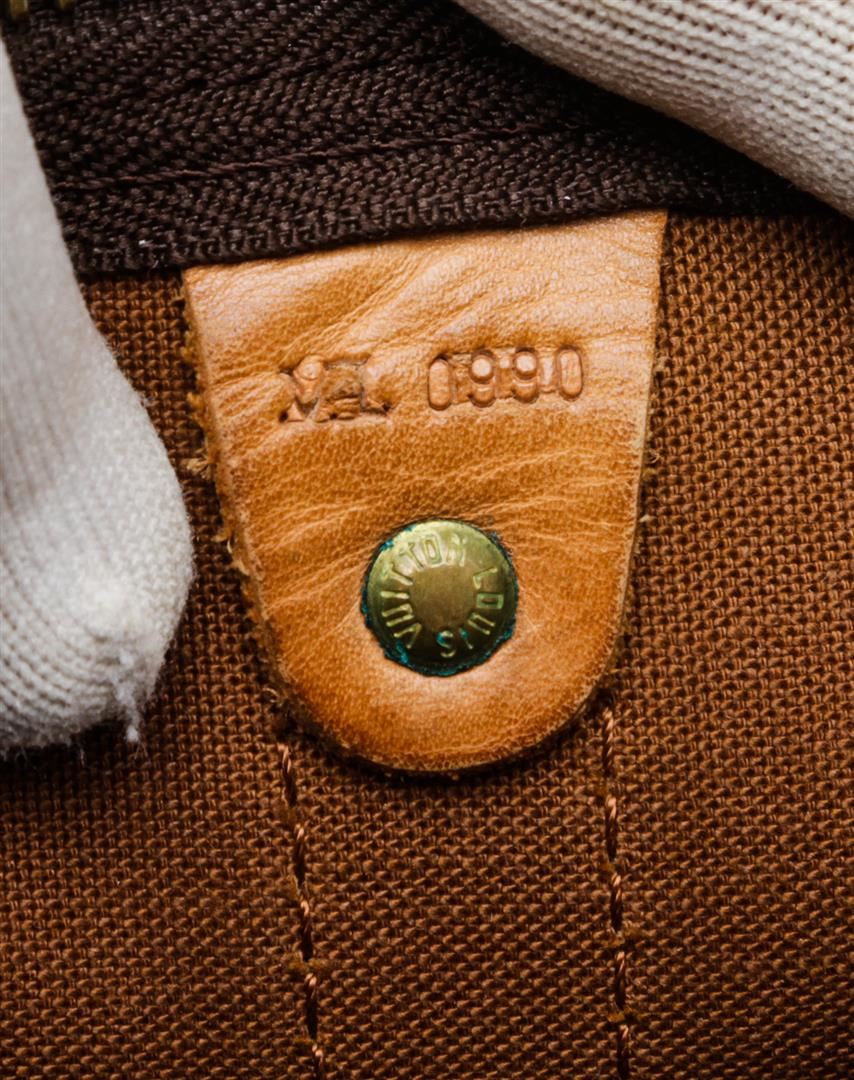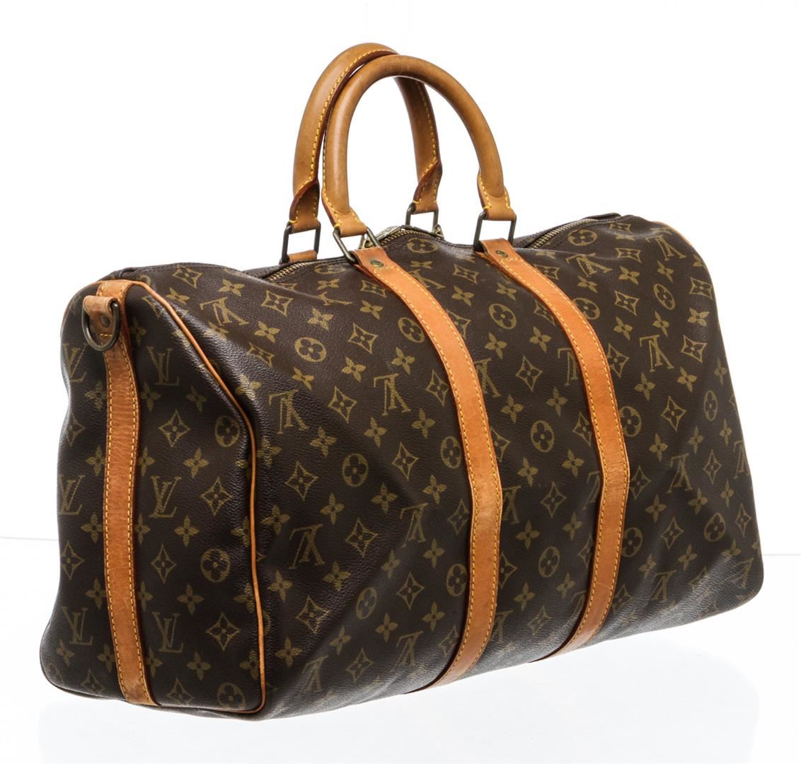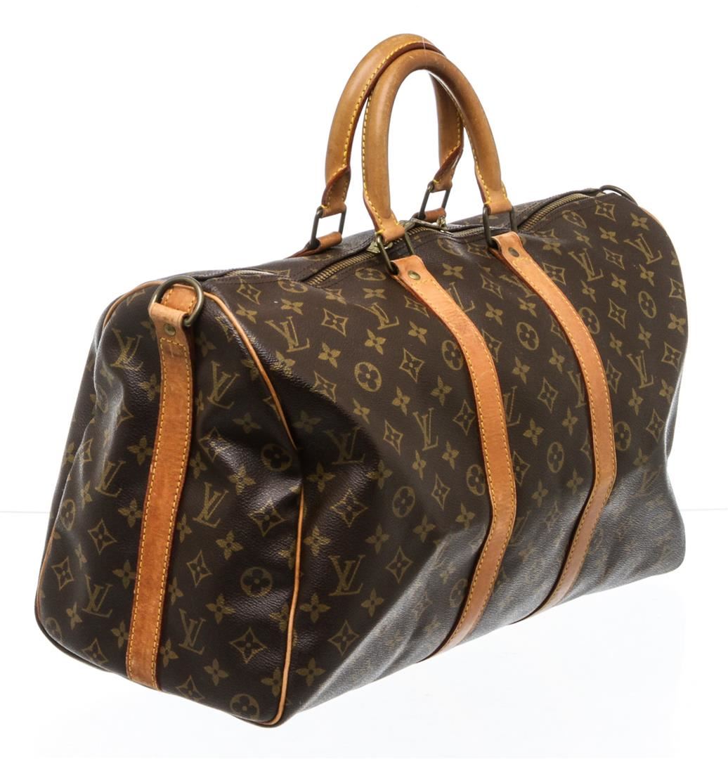One Louis Vuitton Monogram Keepall Bandouliere 45 cm Duffle Bag. Brown and tan monogram coated canvas Louis Vuitton Keepall Bandouliere with brass hardware, tan vachetta leather trim, dual rolled top handle, brown canvas lining and two-way zip closure at top. Detachable shoulder strap NOT included.