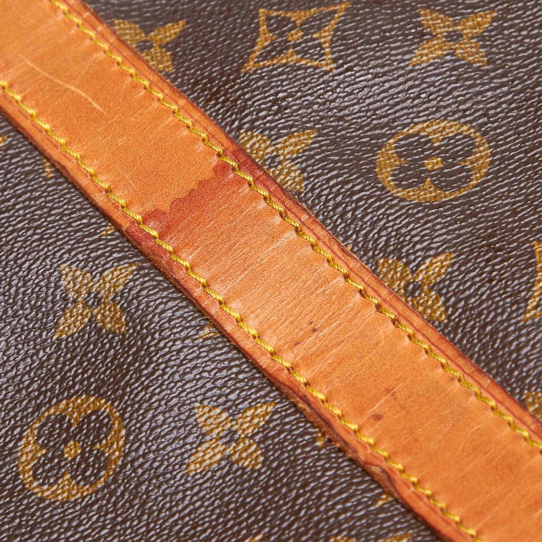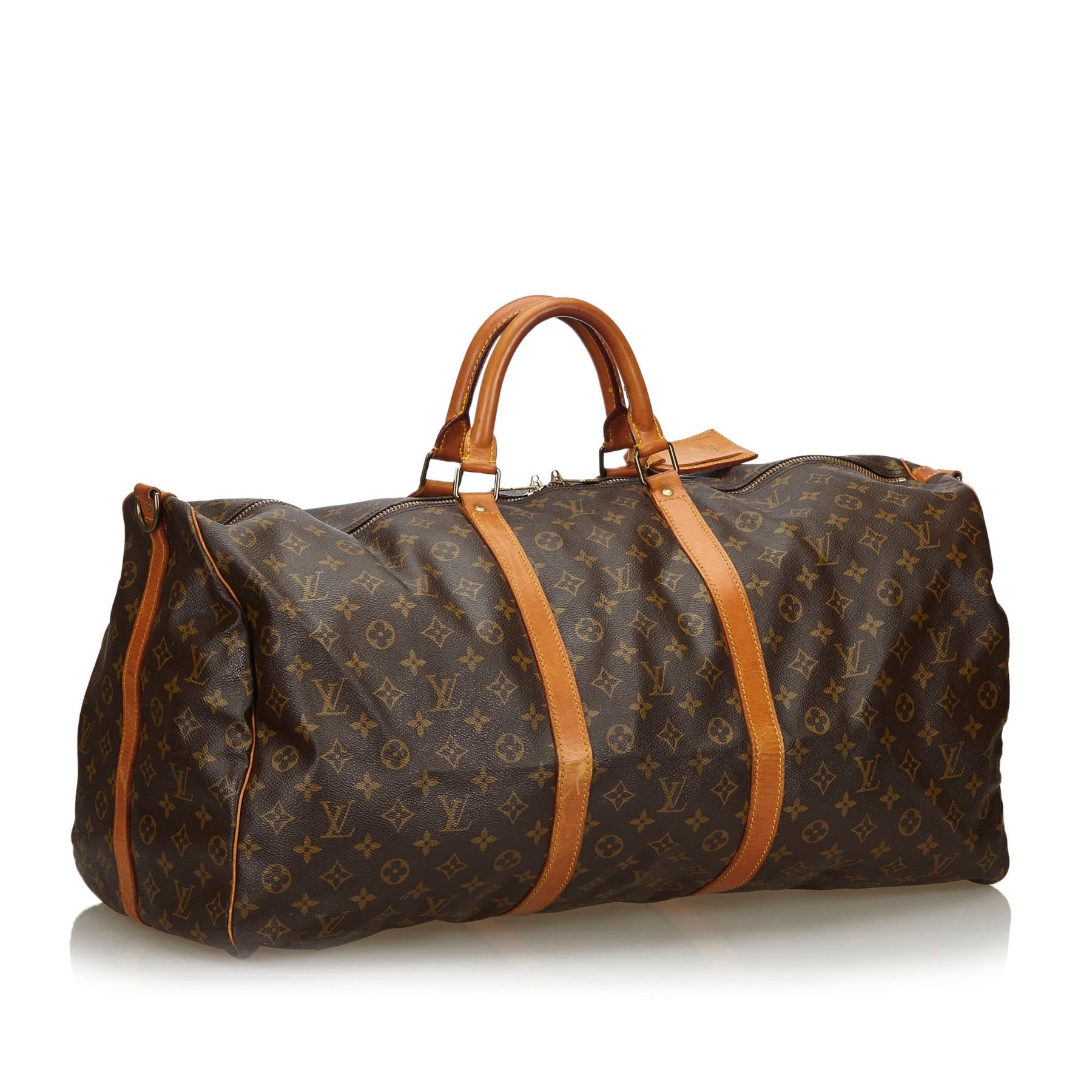 The Keepall Bandouliere 60 features a monogram canvas body, rolled leather handles, a detachable shoulder strap, and a top zip closure. Canvas x Monogram Canvas x Leather Brown Exterior front is loose stitching. Exterior back is loose stitching. Exterior bottom is stained with water mark. Exterior handle is discolored. Exterior side is stained with water mark and loose stitching. Size: 30 x 60 x 25 Card: NO. Louis Vuitton pieces do not come with an authenticity card—please refer to the production date code within the bag for its age and as an authenticity reference. Made in: FRANCE