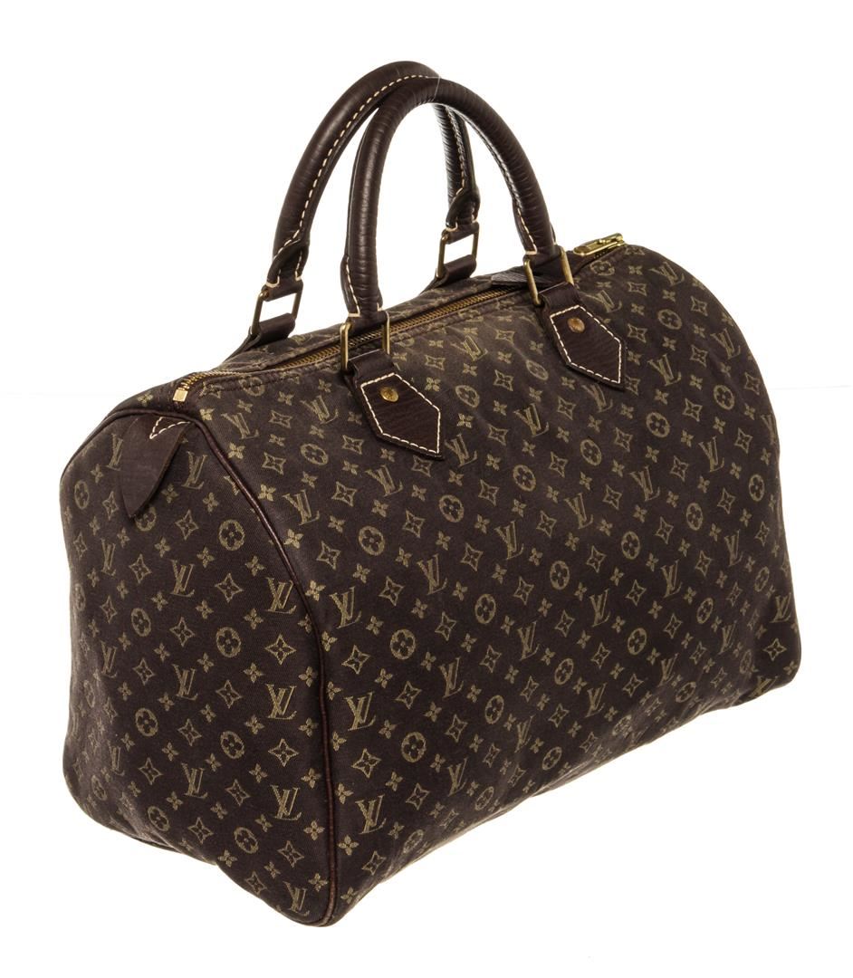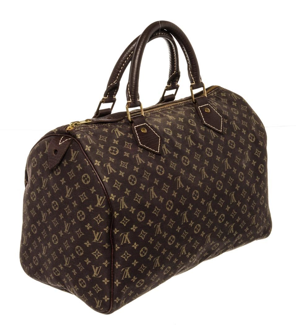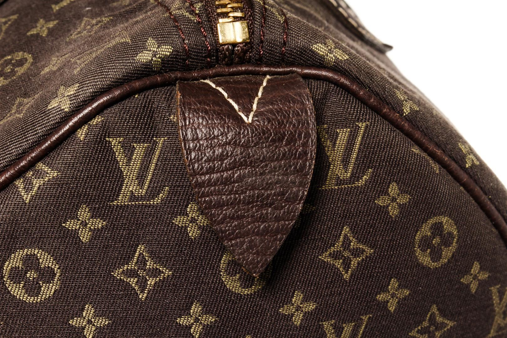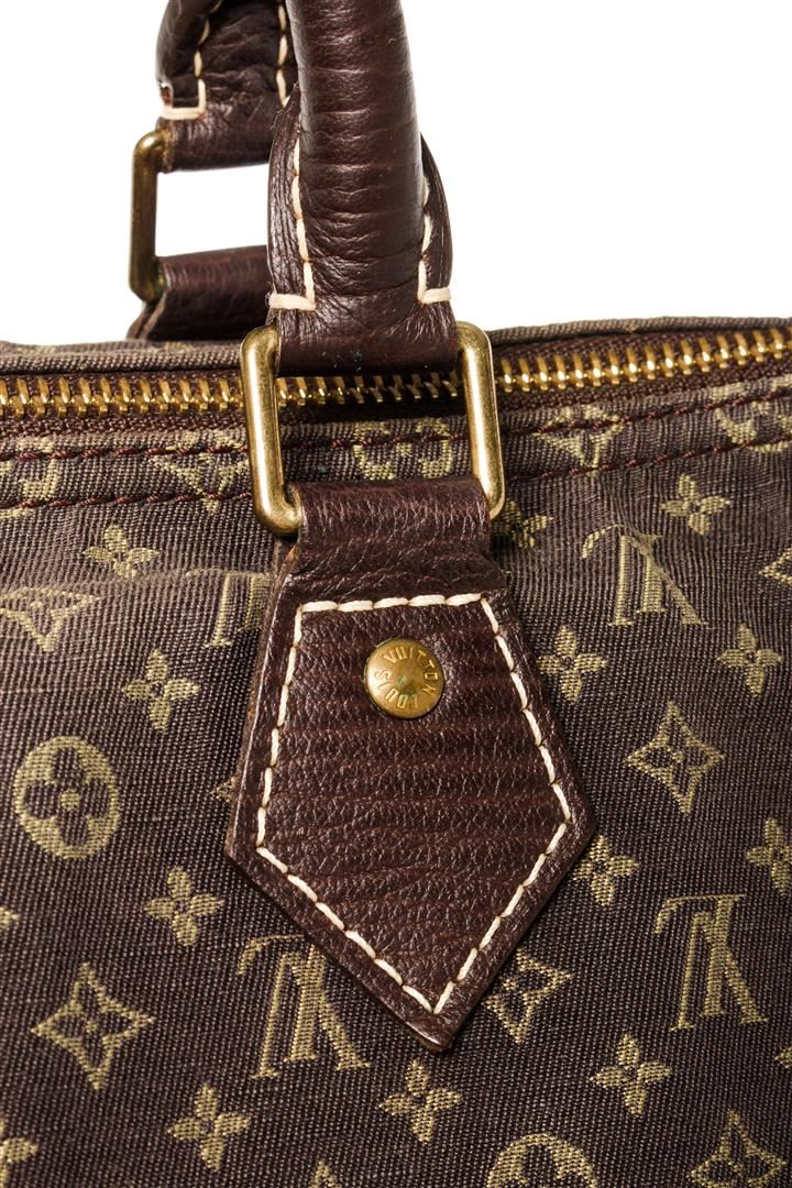 Louis Vuitton Monogram Lin Speedy 30 with gold-tone hardware, brown leather trim, brown fabric lining, dual top handles, interior slip pocket, and zipper closure.