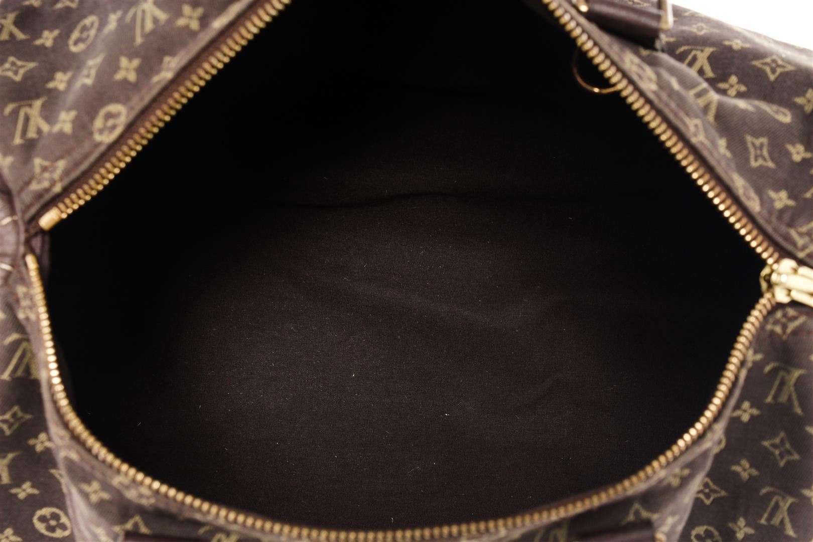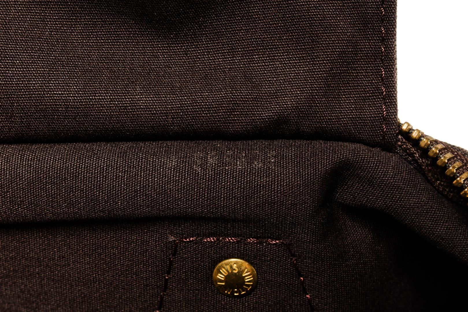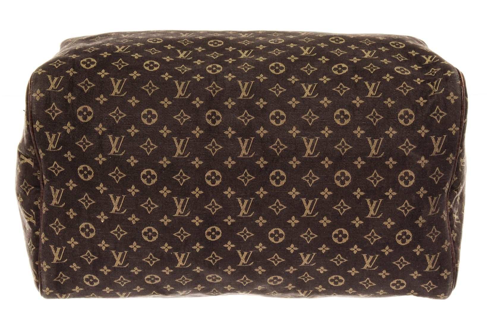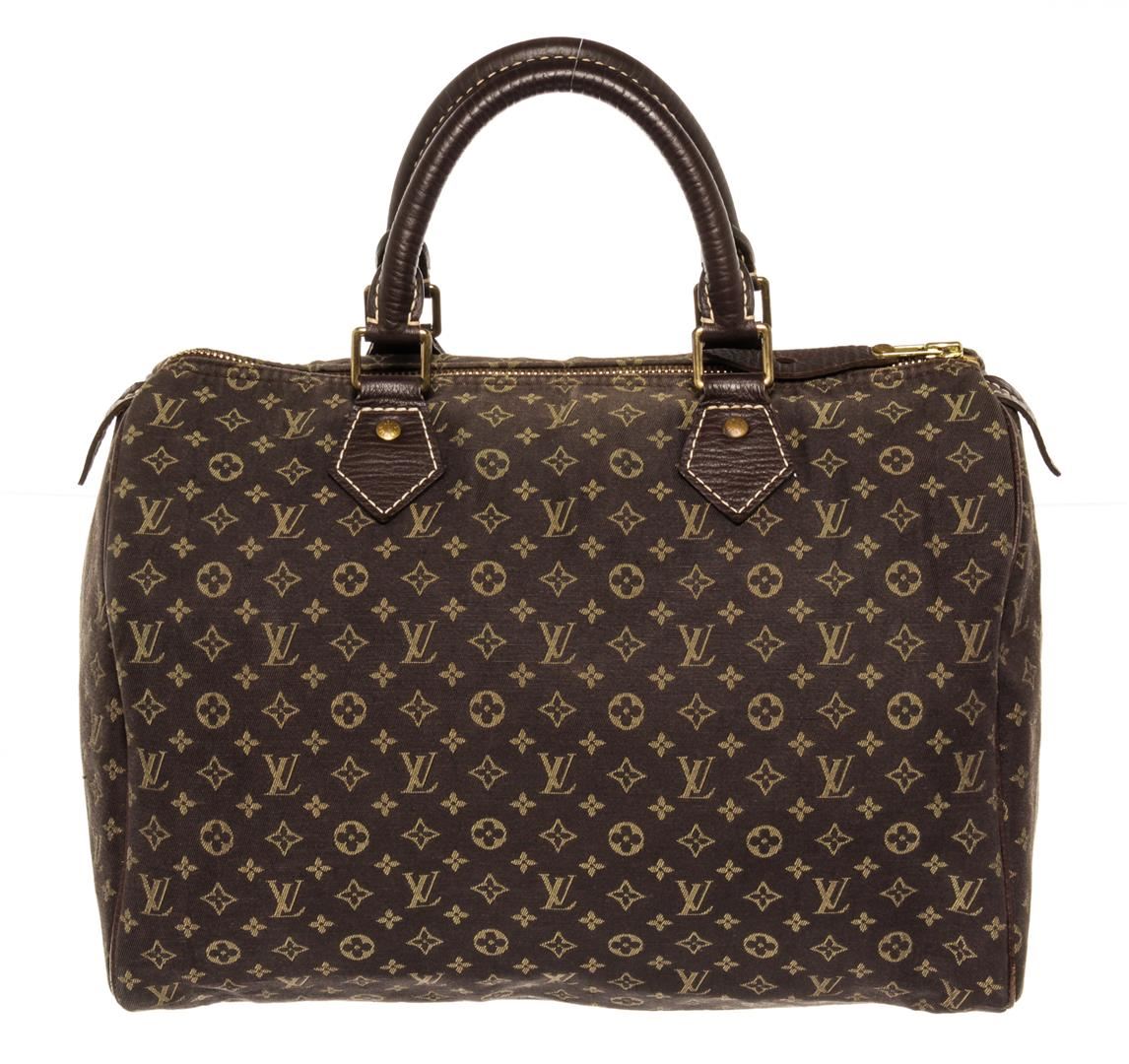 Louis Vuitton Monogram Lin Speedy 30 with gold-tone hardware, brown leather trim, brown fabric lining, dual top handles, interior slip pocket, and zipper closure.