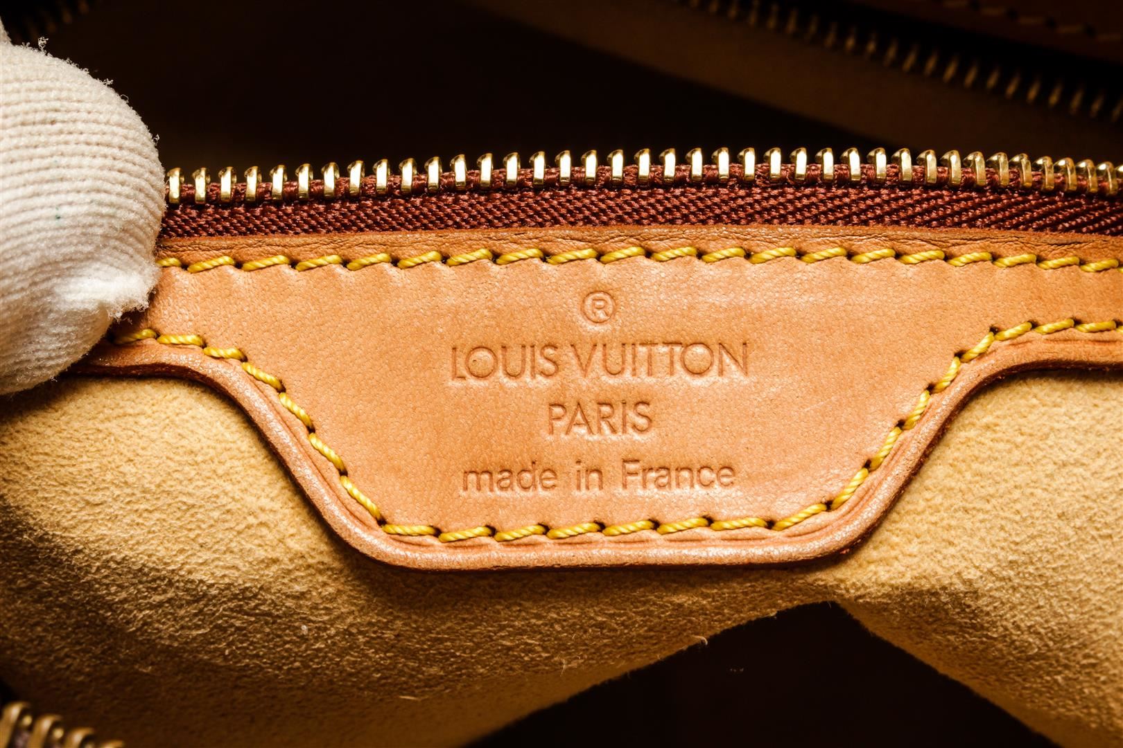 One Louis Vuitton Monogram Looping GM Handbag. Item is sold AS-IS. All available information is listed in the description and shown in the photo. Louis Vuitton Monogram Looping GM handbag with brown coated canvas exterior, beige suede lining, contrasting vachetta leather top handle, gold-tone hardware, zipper closure, and one main compartment with one zip pocket.