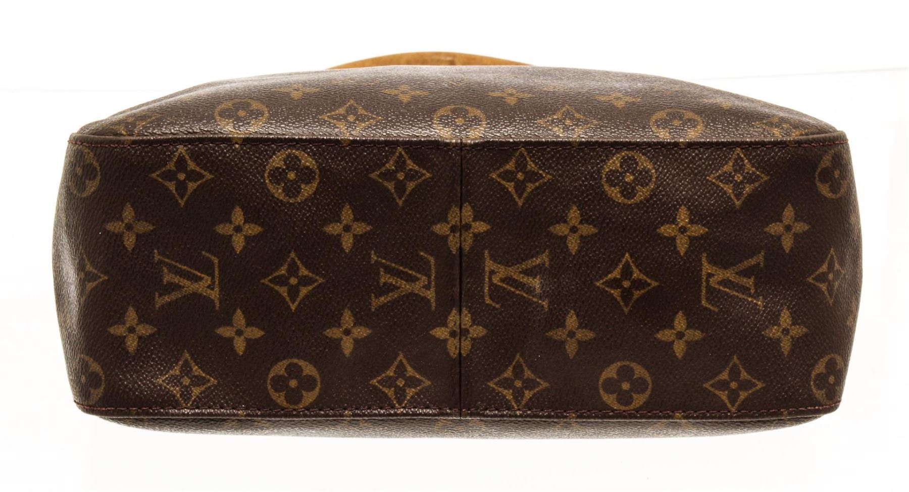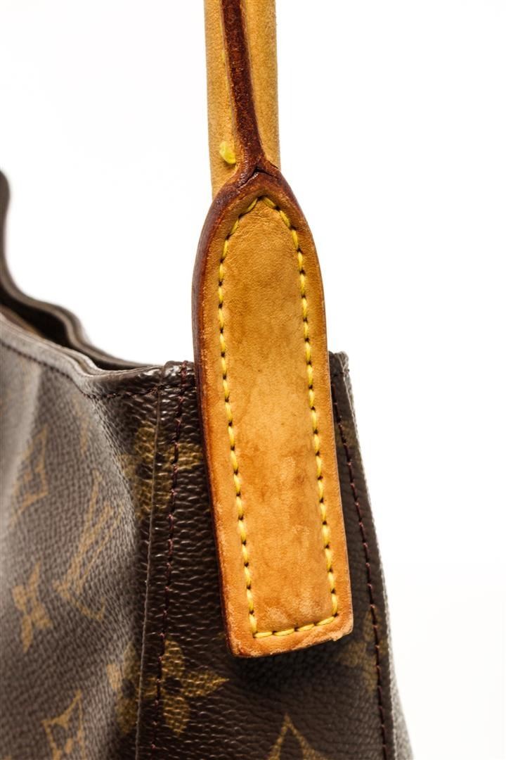One Louis Vuitton Monogram Looping GM Handbag. Item is sold AS-IS. All available information is listed in the description and shown in the photo. Louis Vuitton Monogram Looping GM handbag with brown coated canvas exterior, beige suede lining, contrasting vachetta leather top handle, gold-tone hardware, zipper closure, and one main compartment with one zip pocket.