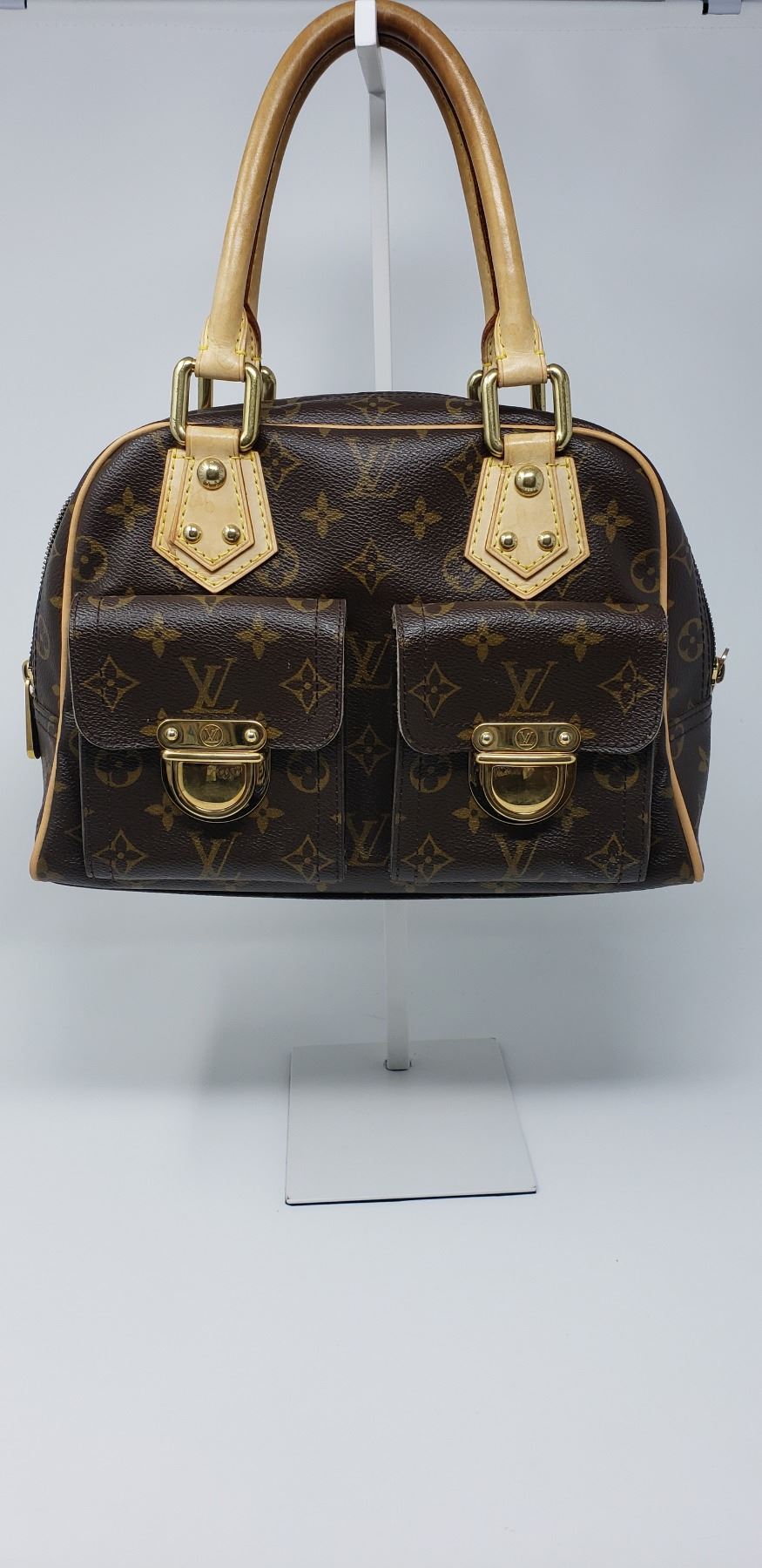 Crafted of classic Louis Vuitton monogram coated canvas in the smaller size. The handbag features tall vachetta cowhide rolled leather top handles and trim, two front external pockets, and polished brass hardware. The top zipper opens to a beige microfiber interior with a patch pocket.