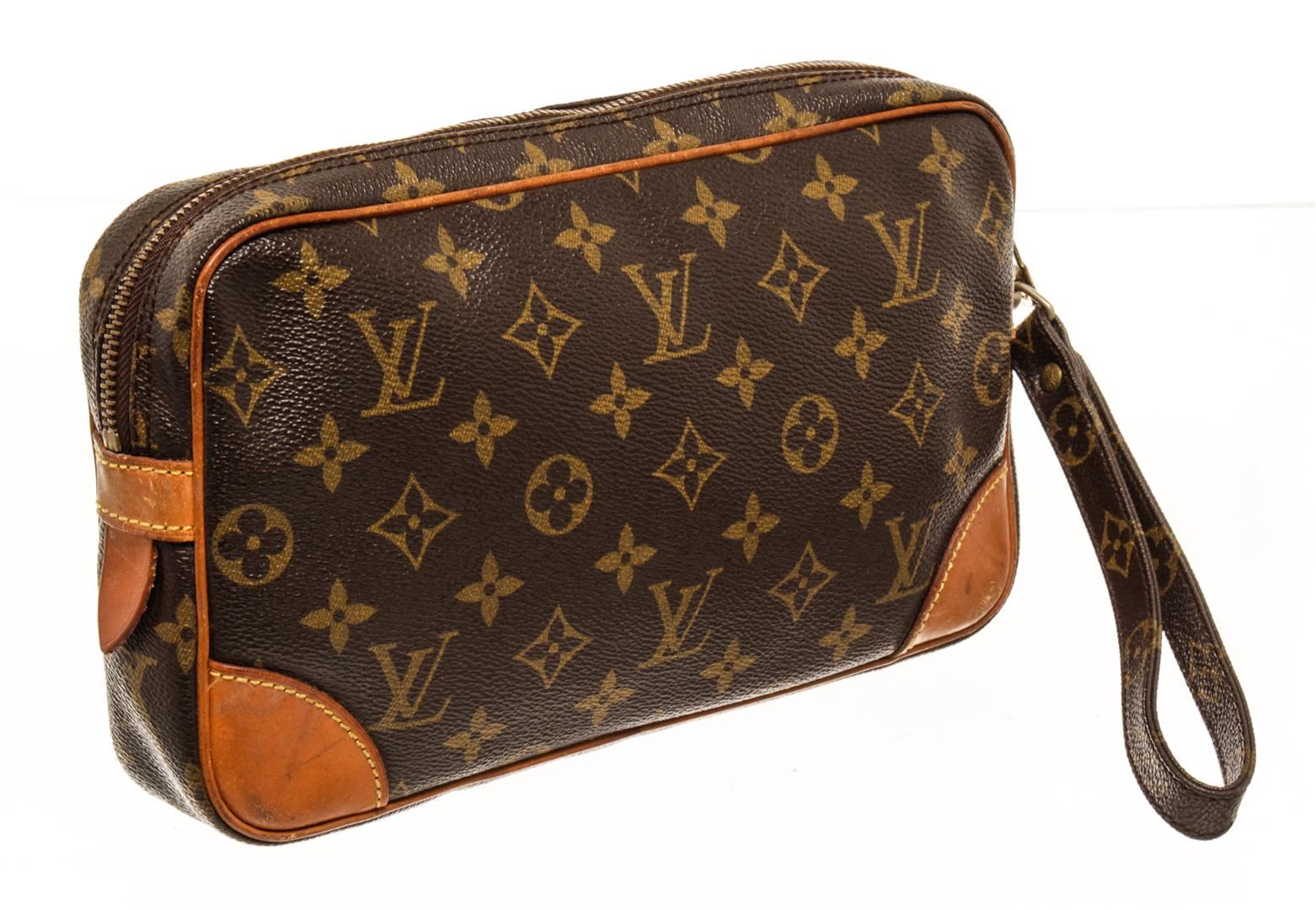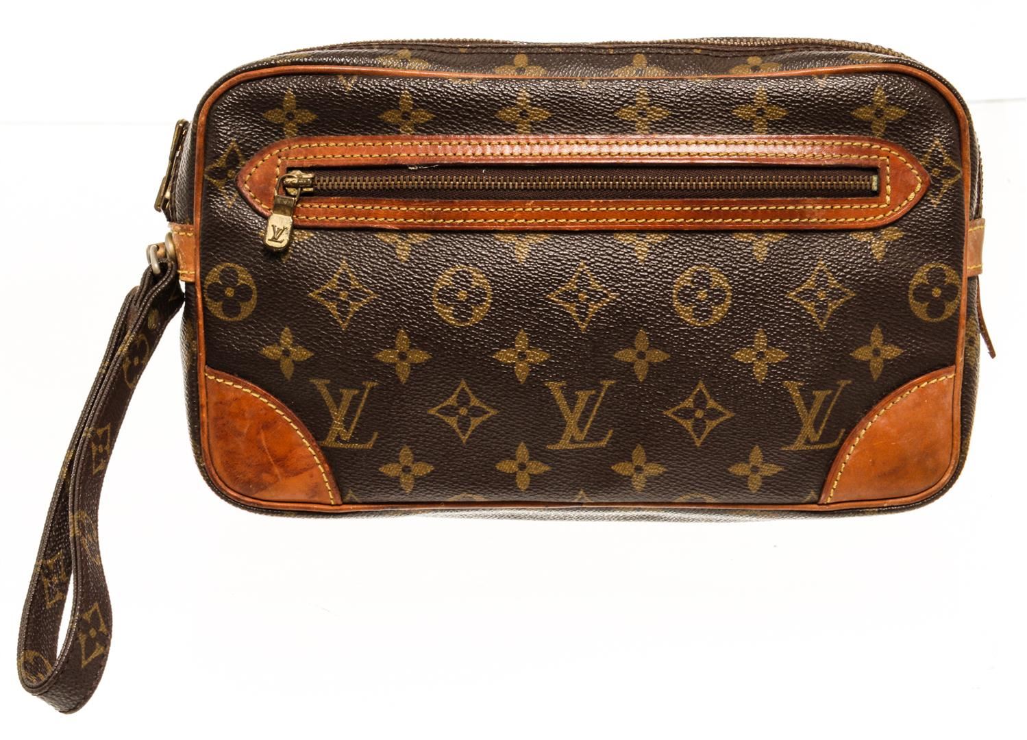 Louis Vuitton Monogram Marly Dragonne. All available information is listed in the description and shown in the photos. Louis Vuitton Monogram Marly Dragonne with coated canvas exterior, brown leather lining, wrist strap, gold-tone hardware, zipper closure, and one main compartment with one zip pocket.