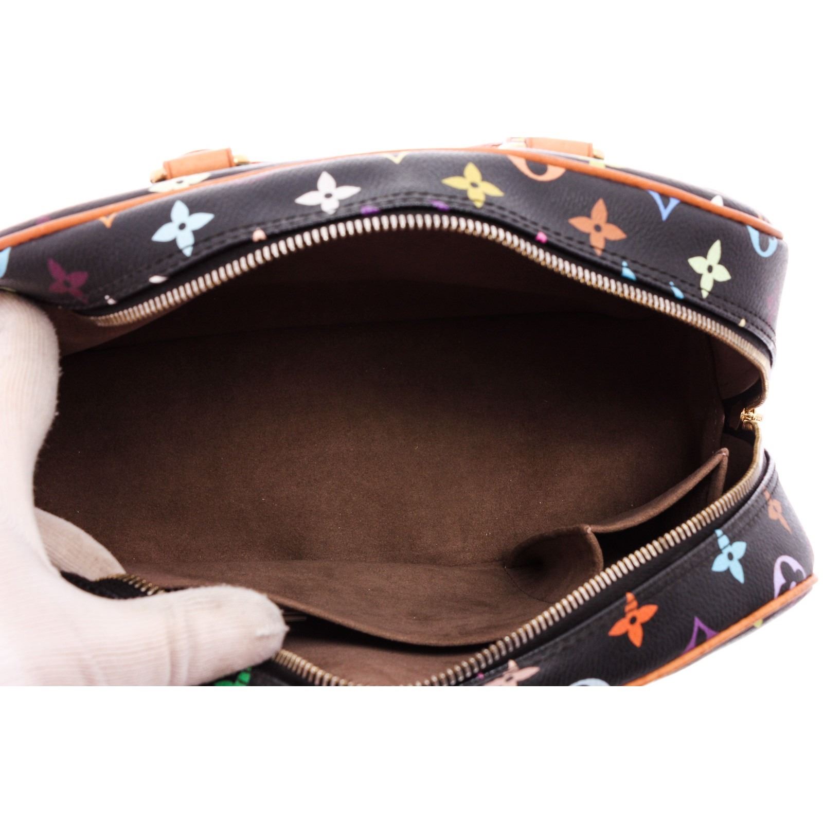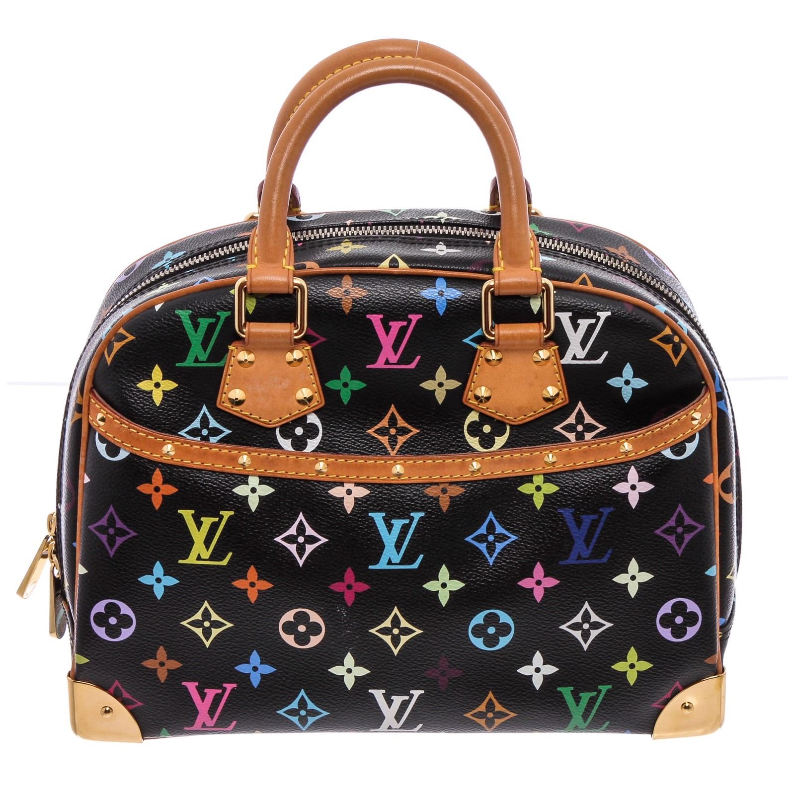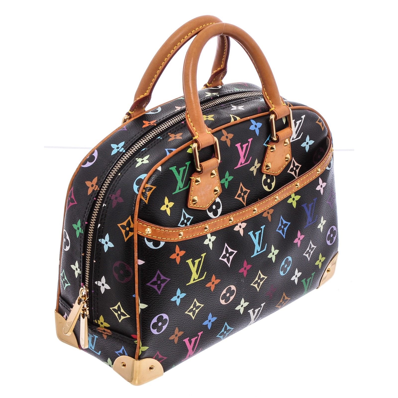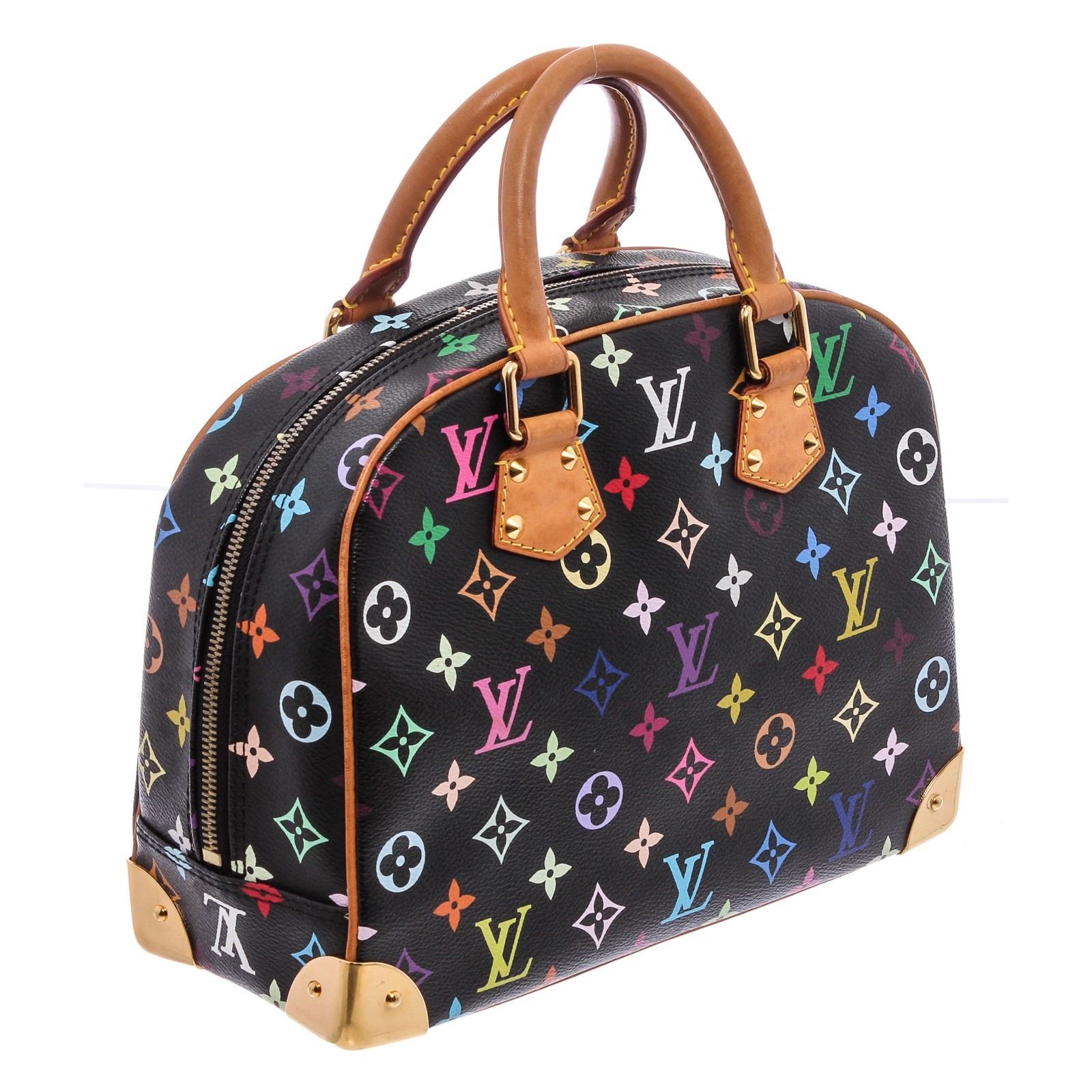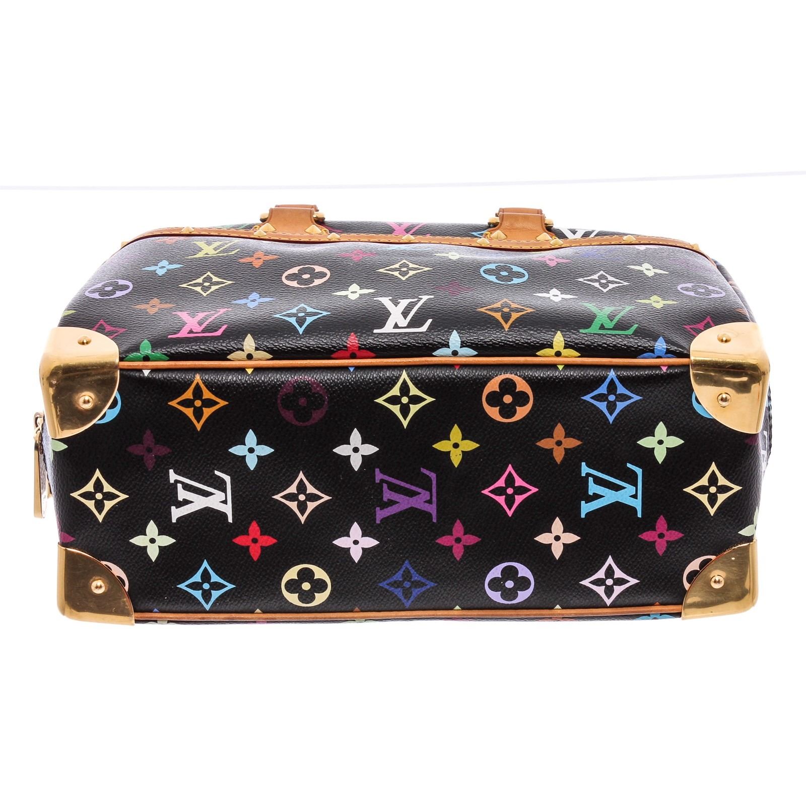 Black and multicolor monogram coated canvas Louis Vuitton Multicolore Trouville bag with gold-tone hardware, dual rolled top handles, tan vachetta leather trim, conical stud embellishments throughout, exterior slit pocket, taupe Alcantara lining, dual interior slit pockets and zip closure at top.