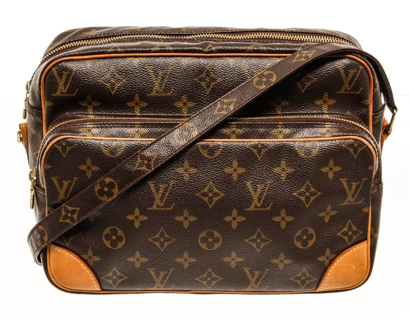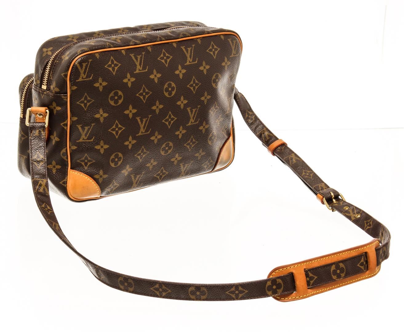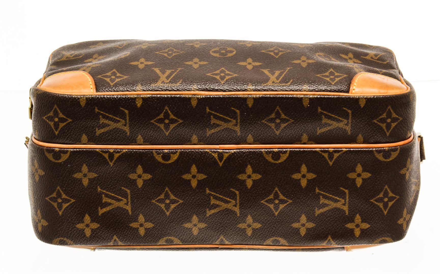 One Louis Vuitton Monogram Nil 28. Item is sold AS-IS. All available information is listed in the description and shown in the photo. Louis Vuitton Monogram Nil 28 with coated canvas exterior, brown leather lining, vachetta leather trims, adjustable strap, one main compartment with another smaller compartment on the front part, gold-tone hardware, and zip closure.