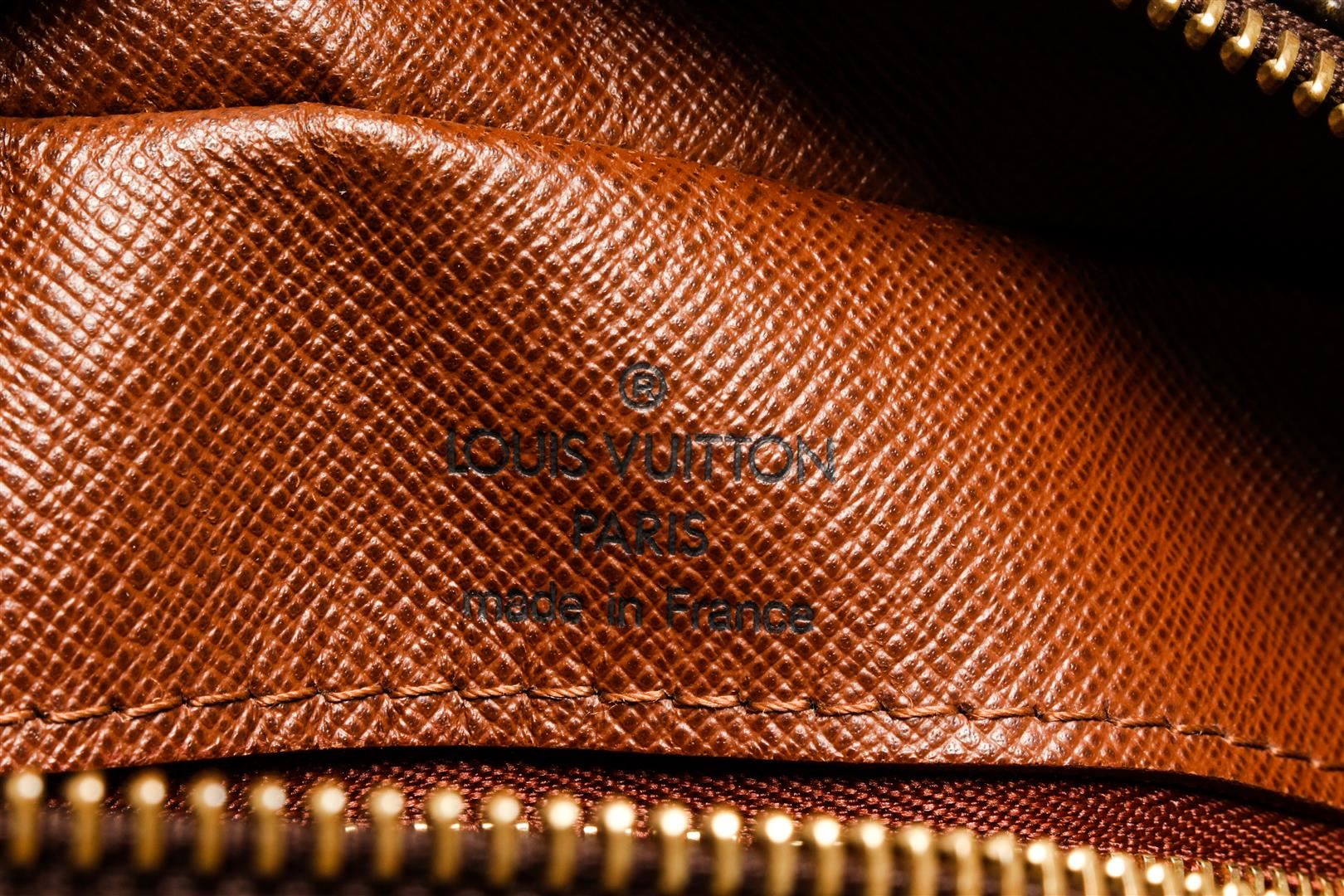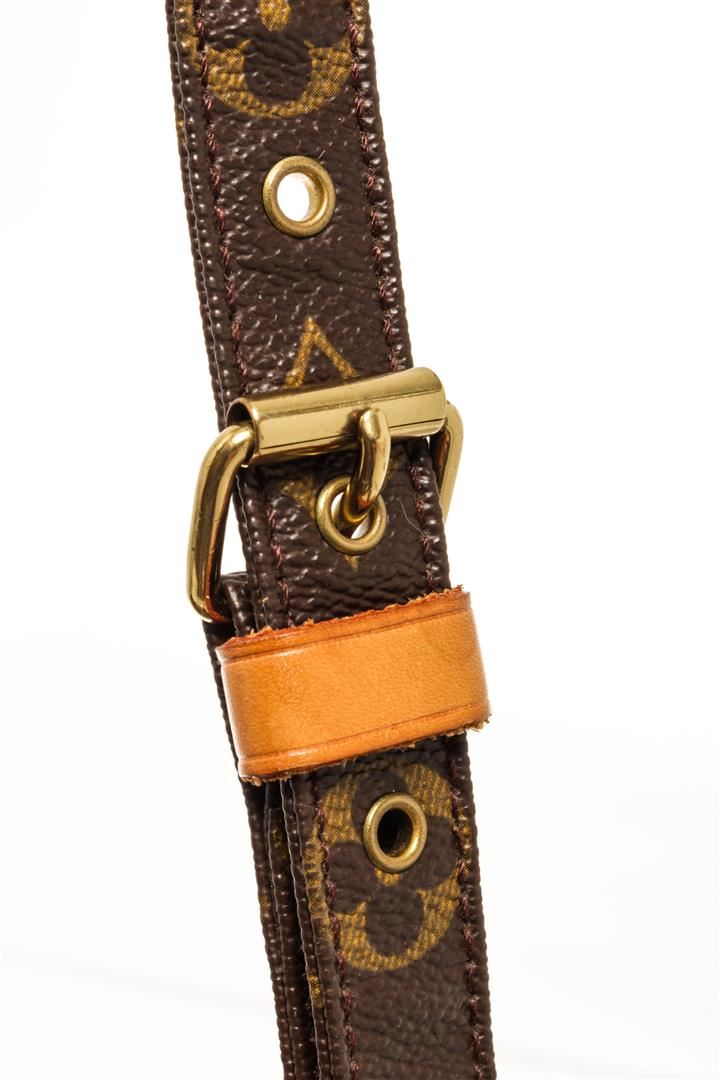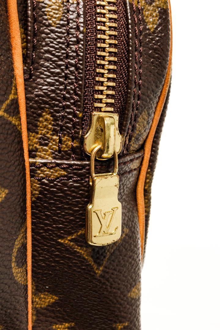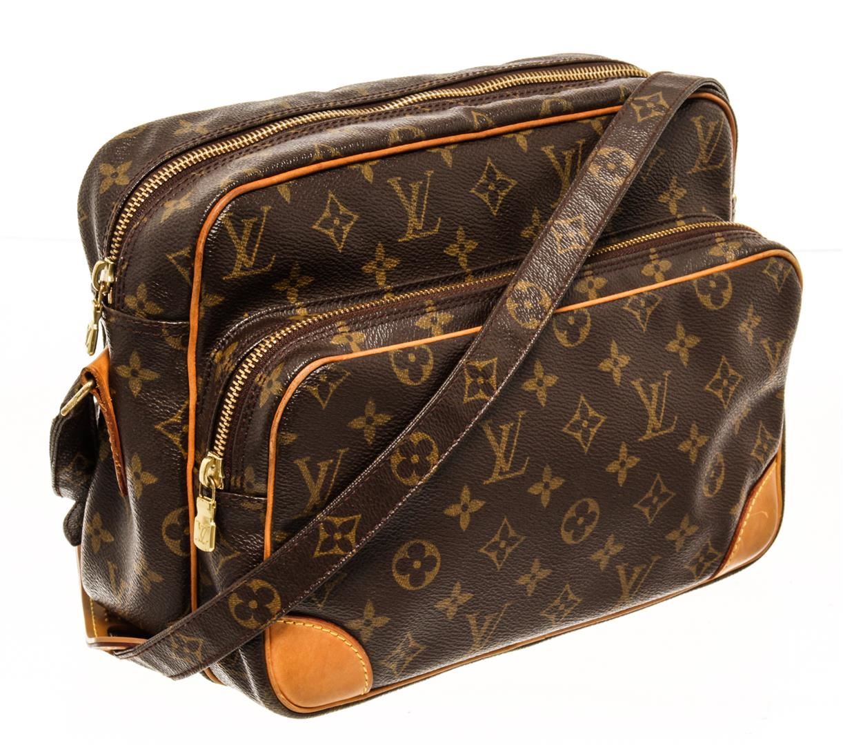 One Louis Vuitton Monogram Nil 28. Item is sold AS-IS. All available information is listed in the description and shown in the photo. Louis Vuitton Monogram Nil 28 with coated canvas exterior, brown leather lining, vachetta leather trims, adjustable strap, one main compartment with another smaller compartment on the front part, gold-tone hardware, and zip closure.