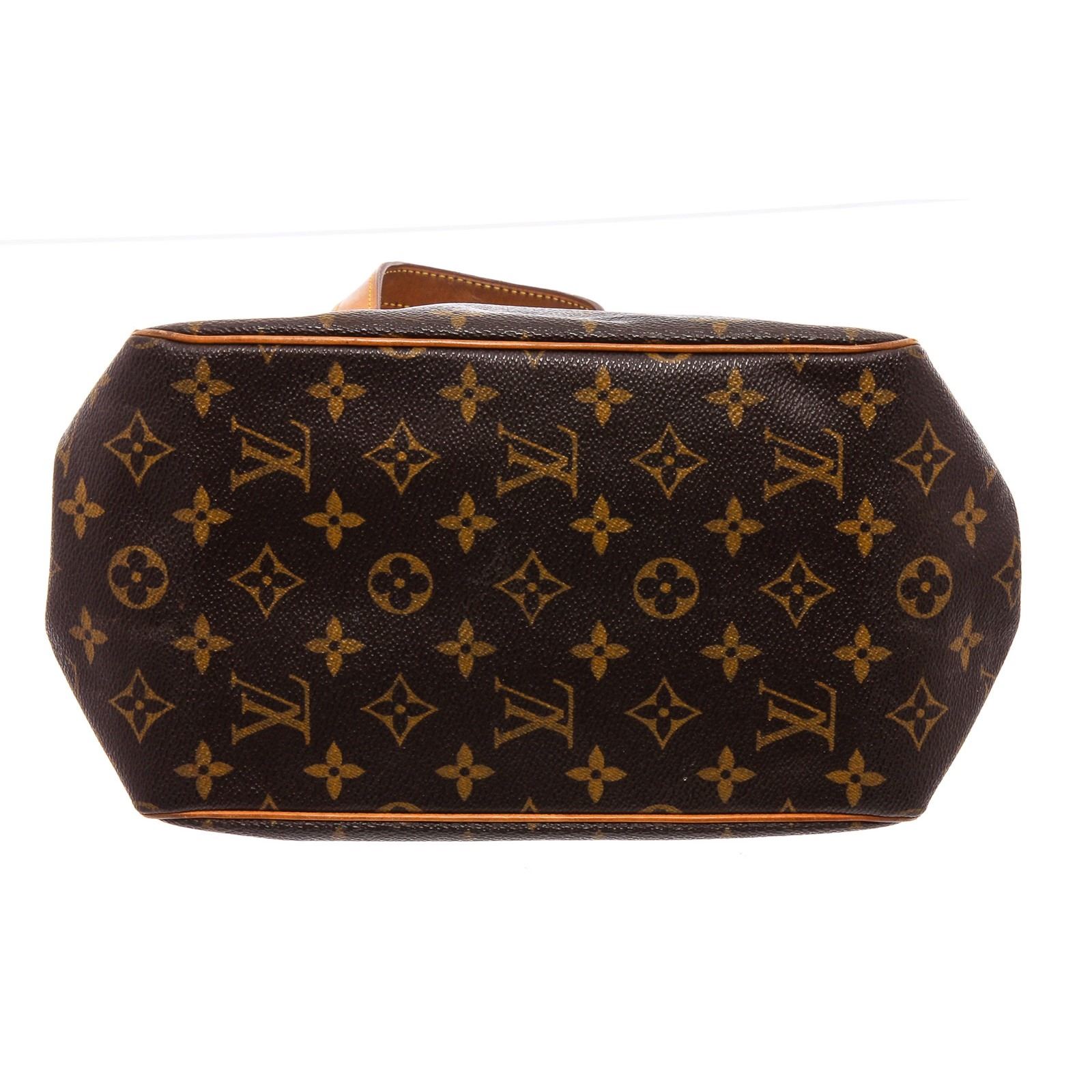 Brown and tan monogram coated canvas Louis Vuitton Batignolles Vertical PM with brass hardware, tan vachetta leather accents, dual flat top handles, buckle accents at sides, brown canvas lining, dual interior slit pockets and open top.