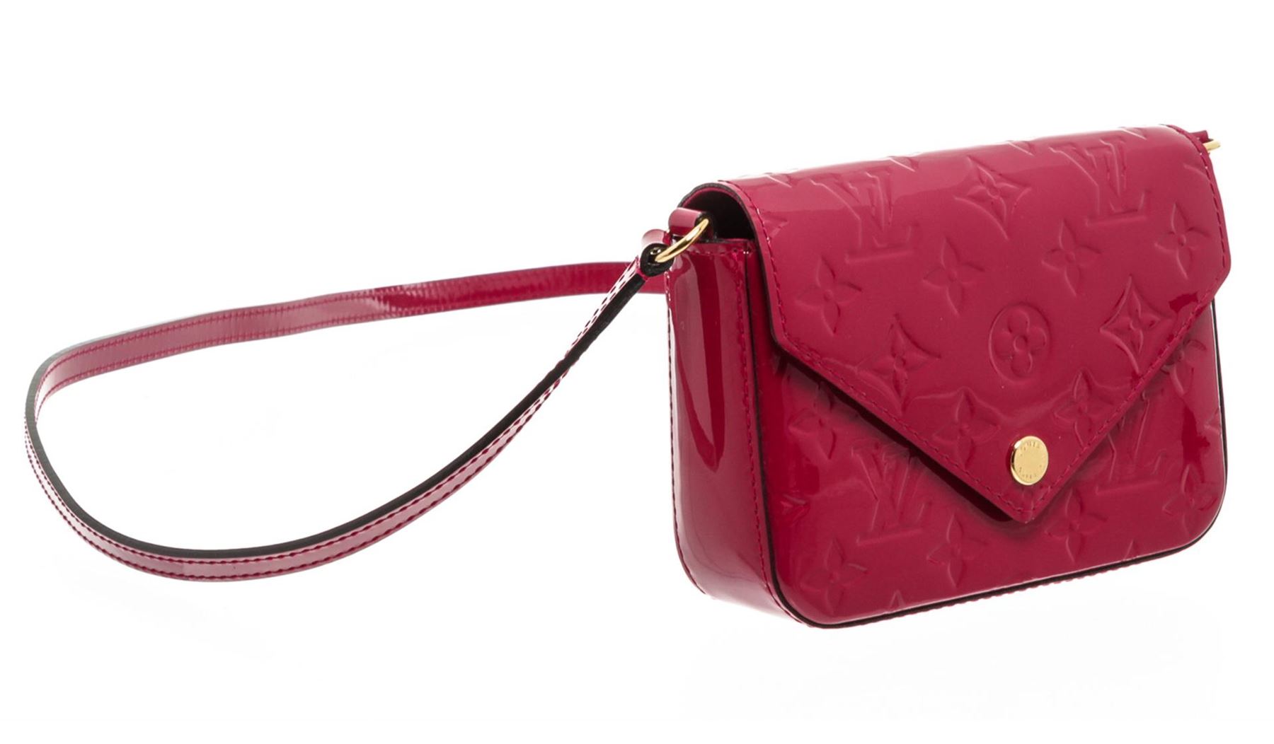 One Louis Vuitton Monogram Pink Vernis Leather Mini Sac Lucie Bag. Pink monogram Vernis leather Louis Vuitton Mini Sac Lucie with brass hardware, single flat shoulder strap, tonal woven lining, single interior wall pocket, four card slots at interior wall and snap closure at front flap. MKR