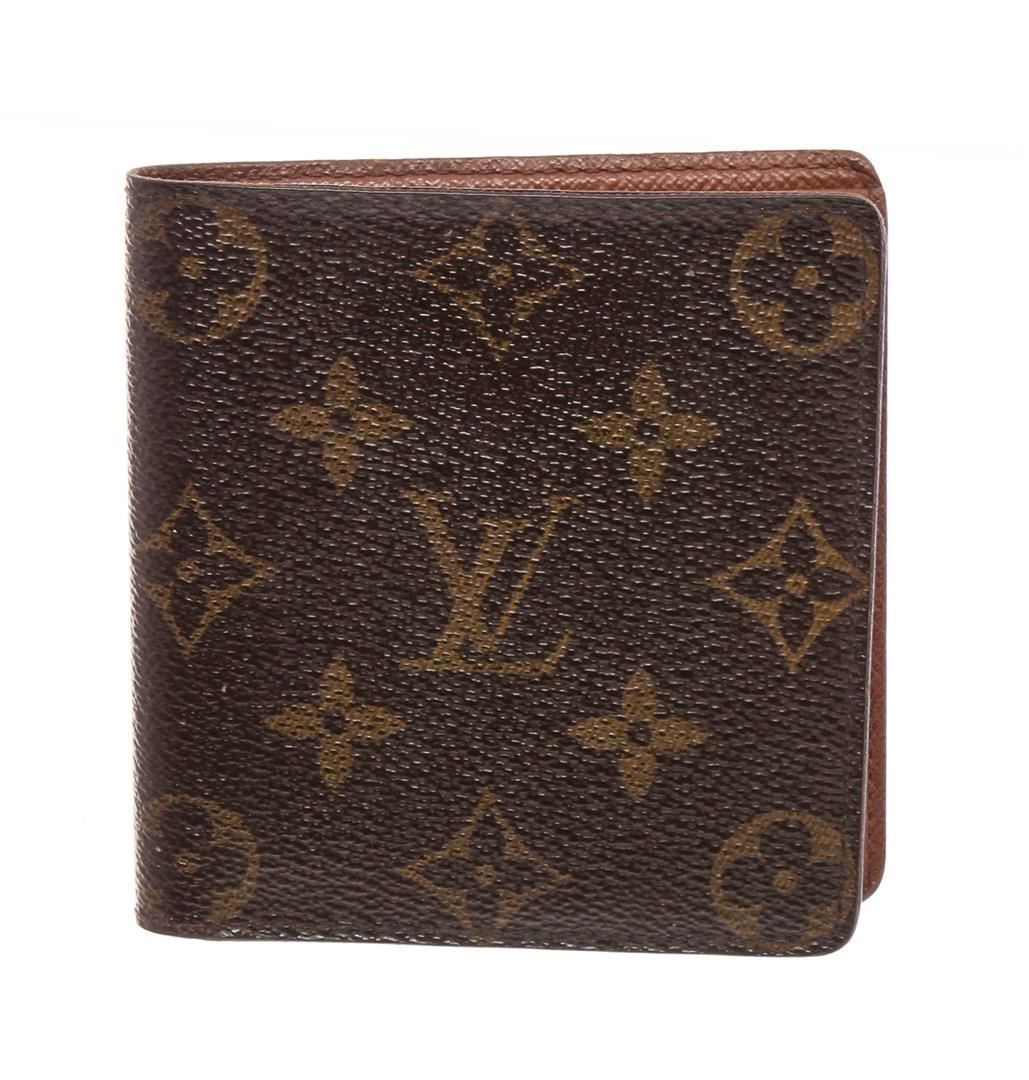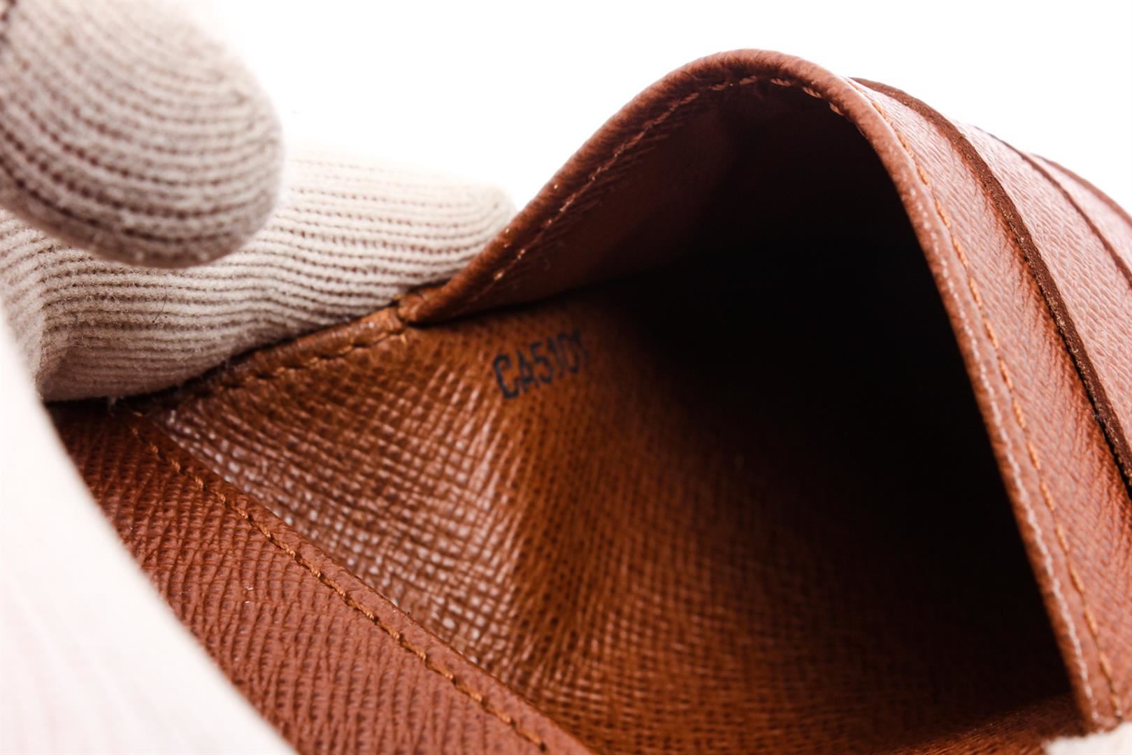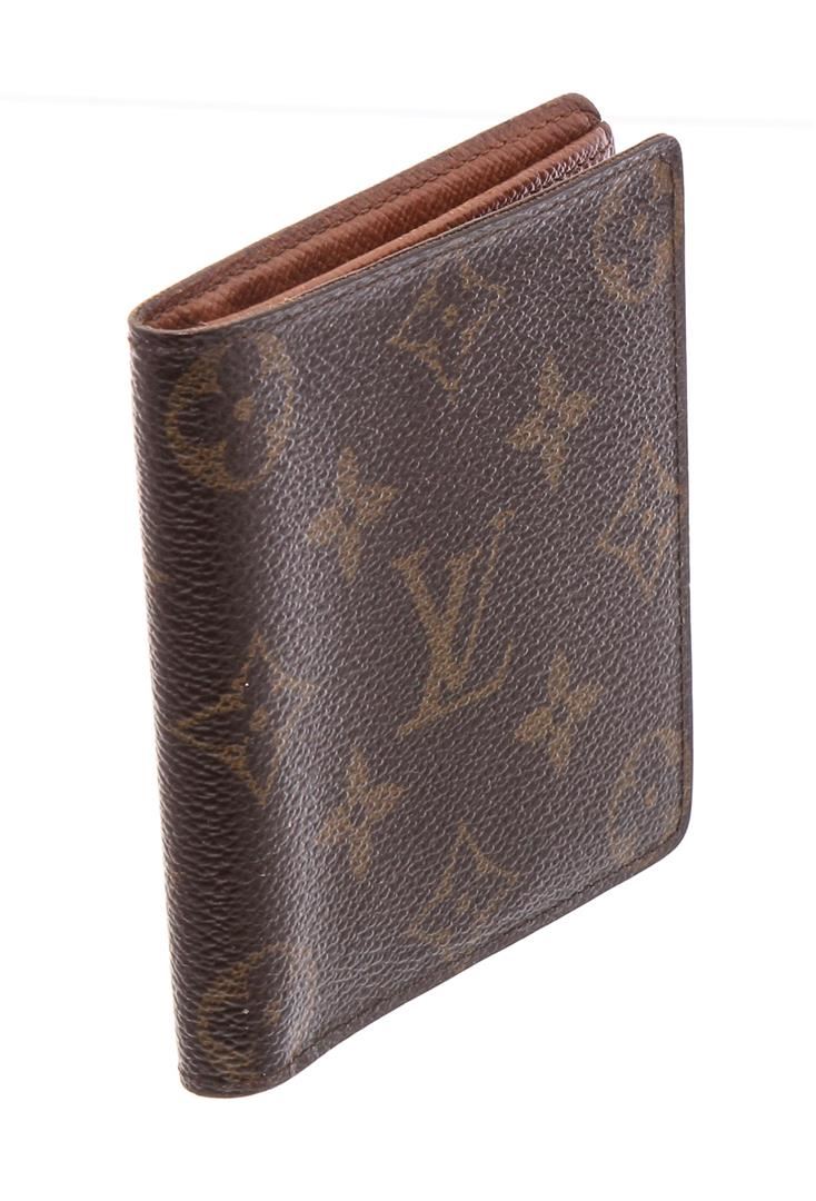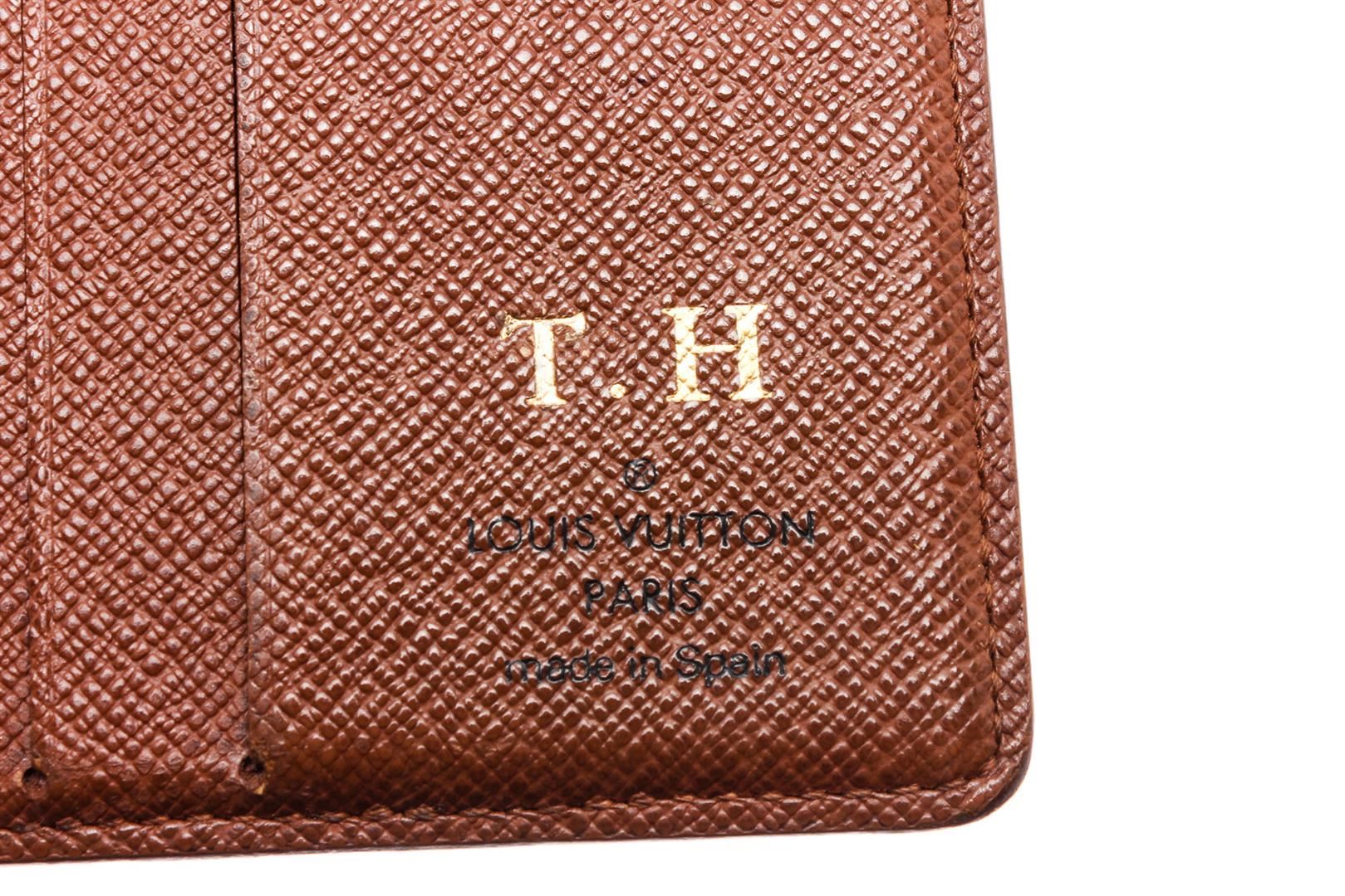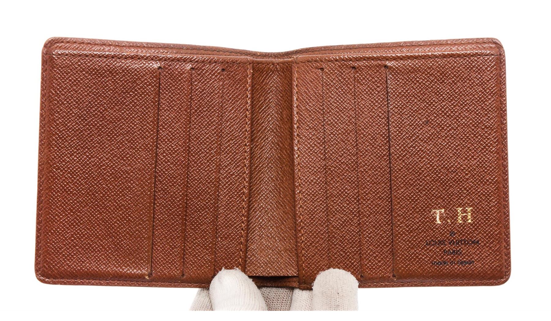 Brown and tan monogram coated canvas Louis Vuitton Porte-Billets 6 Cartes Credit wallet with brown cross grain leather lining, dual interior wall pockets, six card slots, single bill compartment and fold-over closure. PLEASE NOTE: INITIALS T.H. STAMPED ON INTERIOR. 21624MSC
