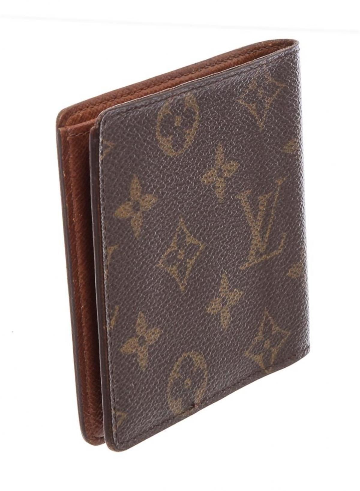 Brown and tan monogram coated canvas Louis Vuitton Porte-Billets 6 Cartes Credit wallet with brown cross grain leather lining, dual interior wall pockets, six card slots, single bill compartment and fold-over closure. PLEASE NOTE: INITIALS T.H. STAMPED ON INTERIOR. 21624MSC