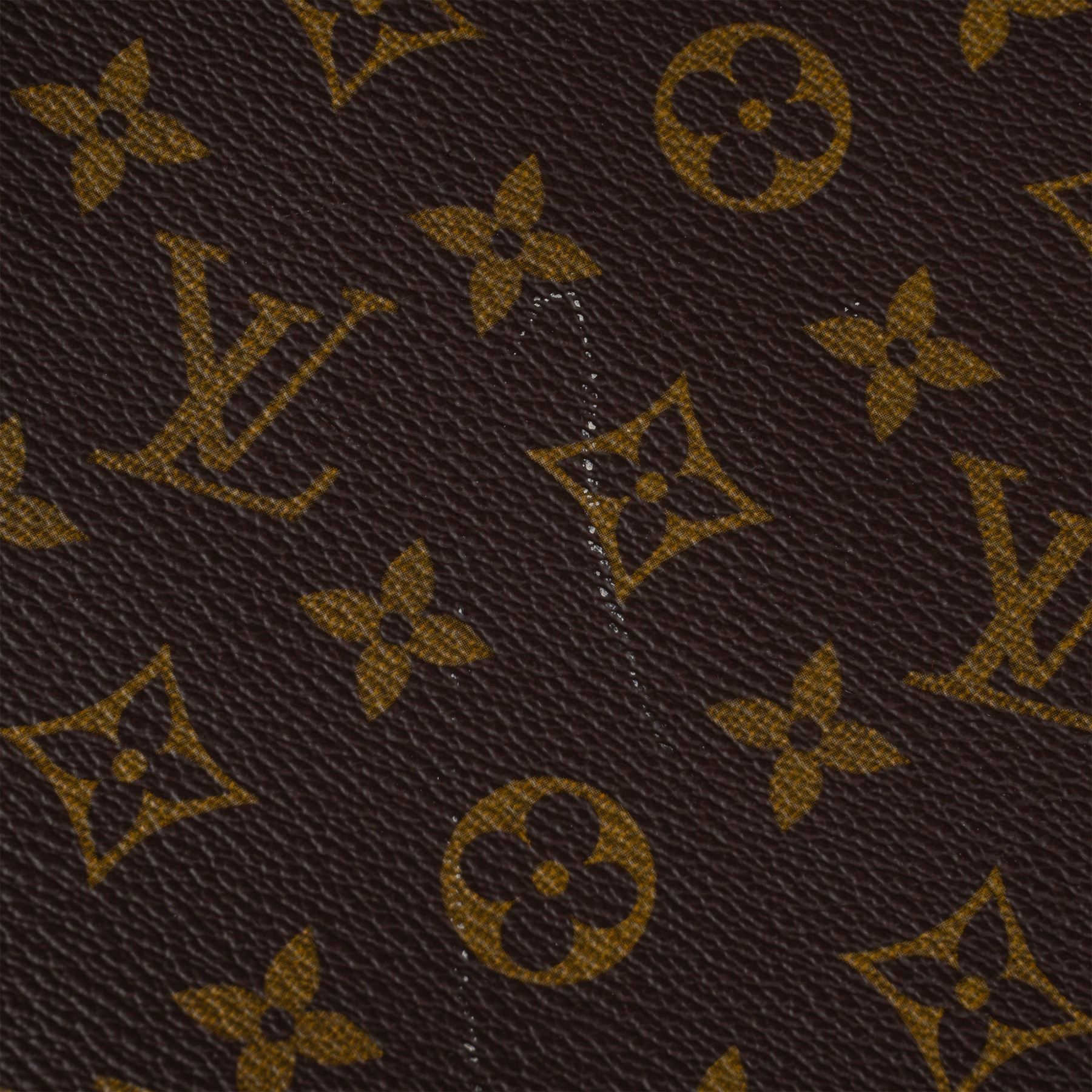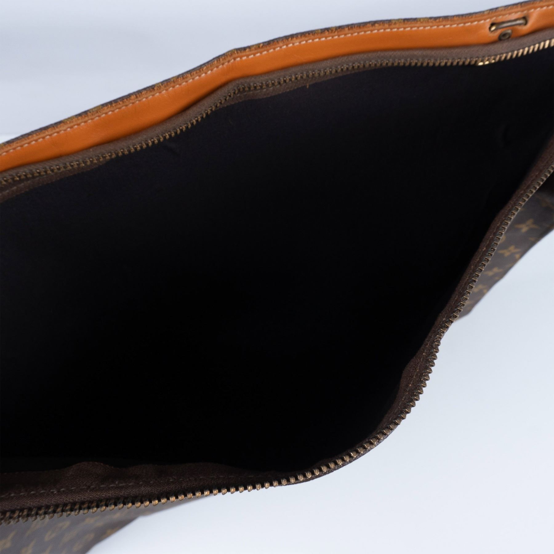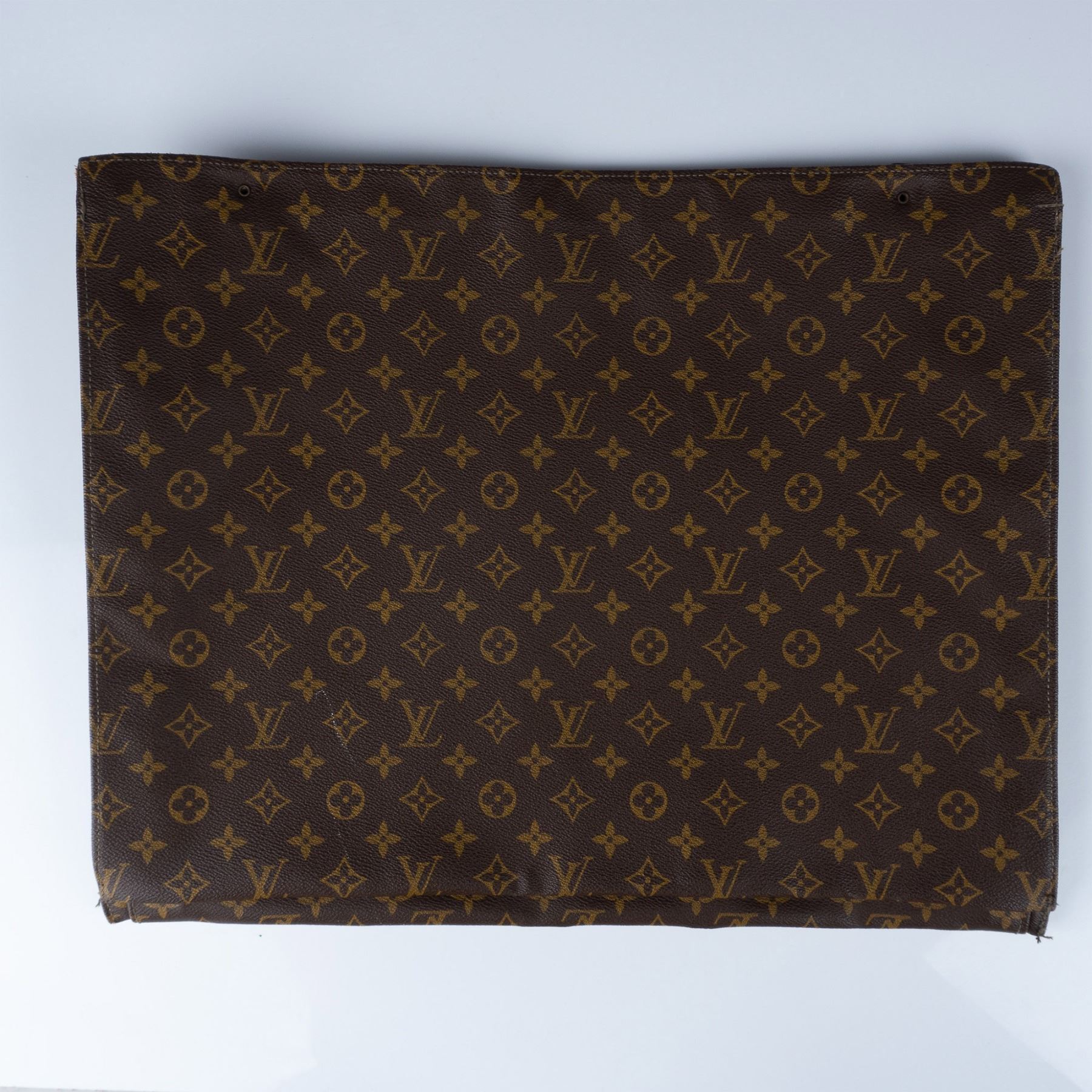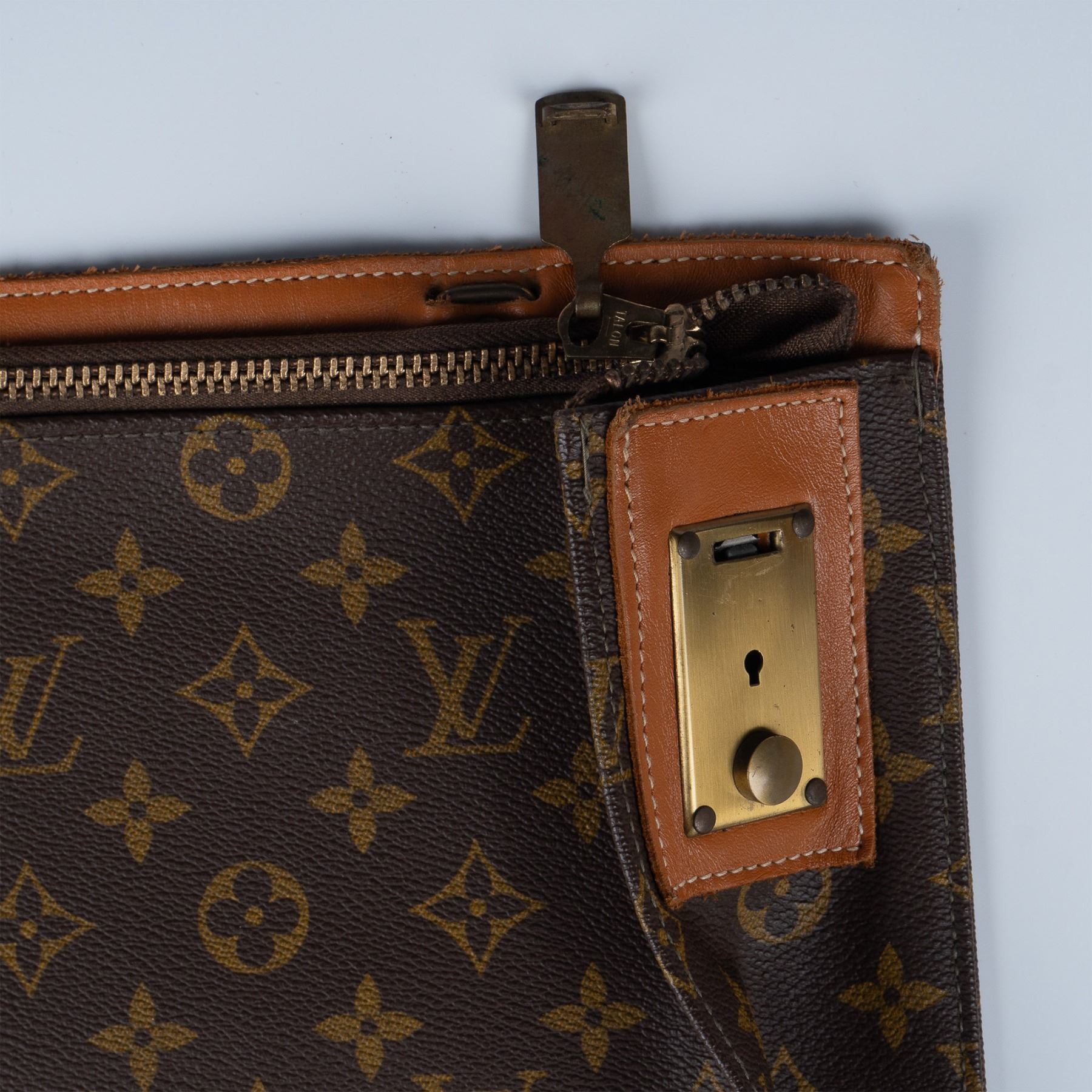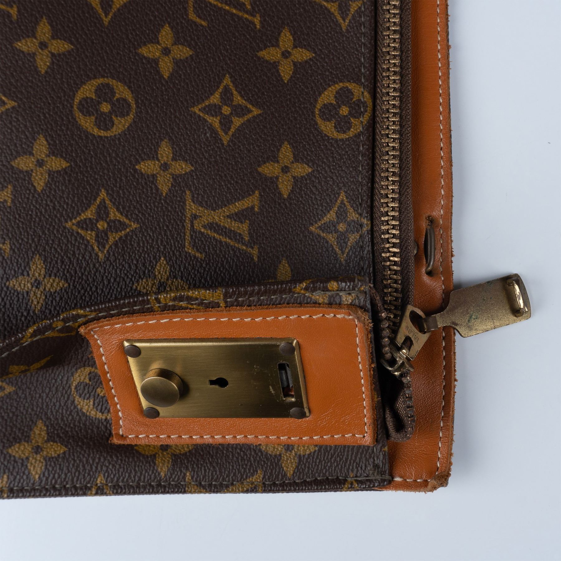 A vintage Louis Vuitton Monogram portfolio pouch featuring the iconic LV monogram canvas. The piece includes a brass locking mechanism (key not included) and a zippered closure. The monogram pattern is synonymous with Louis Vuitton's timeless design and unparalleled craftsmanship.