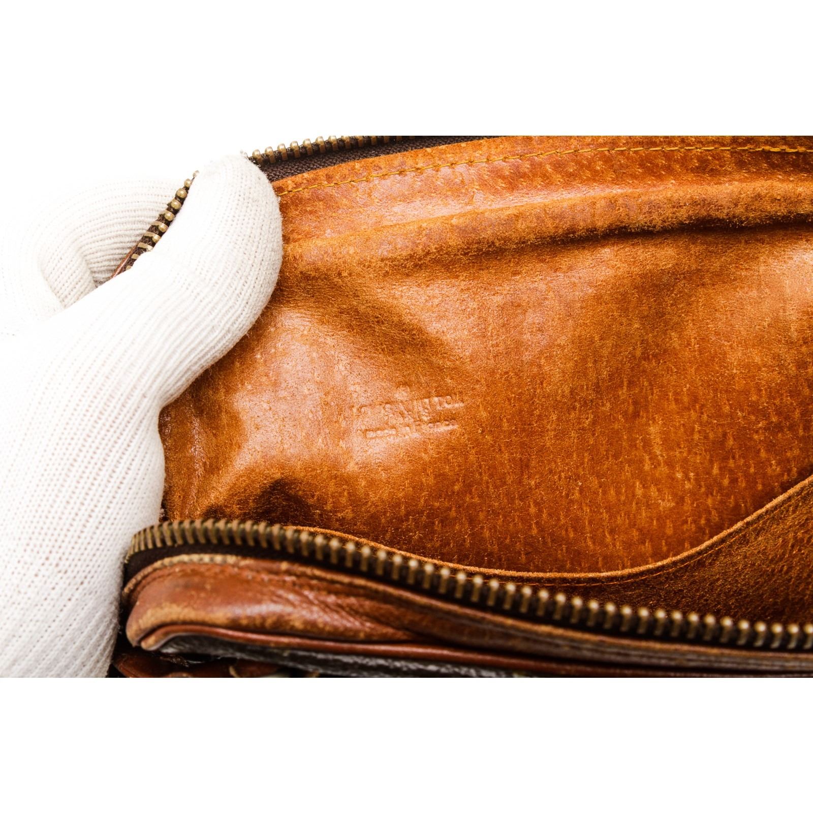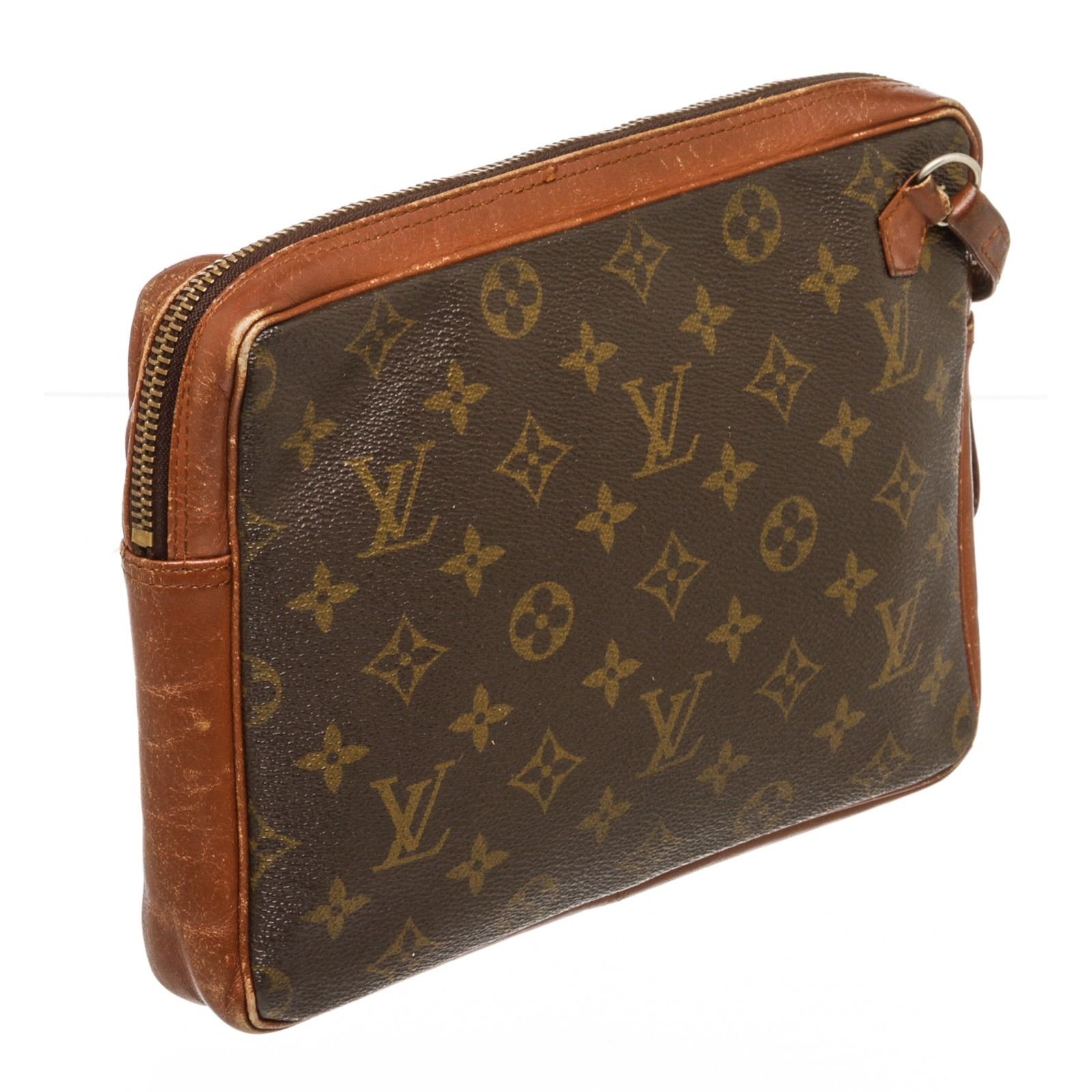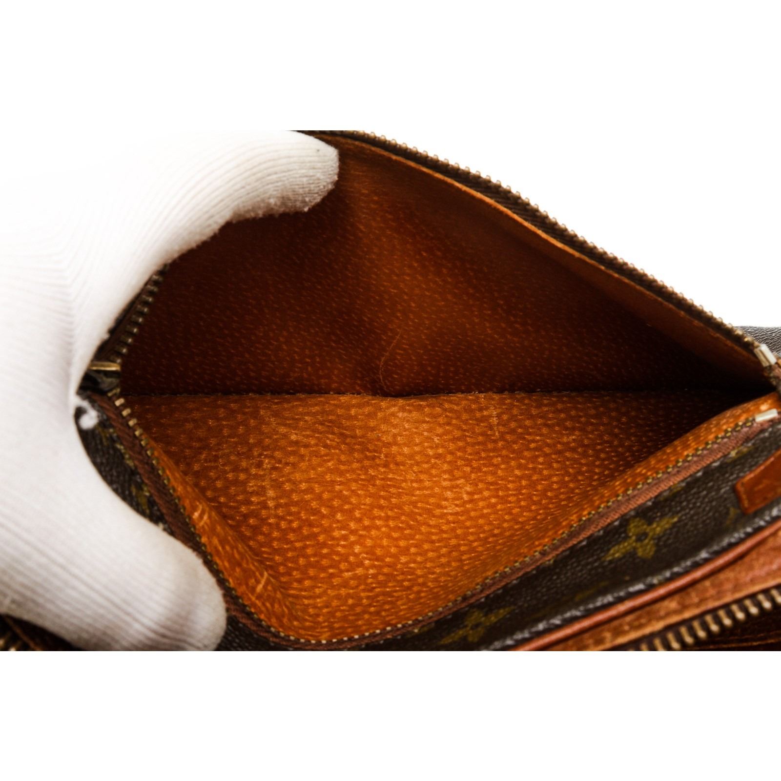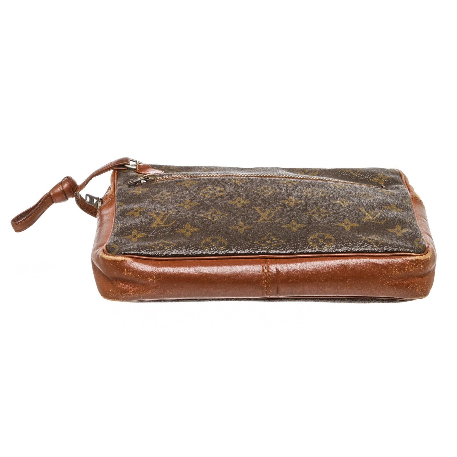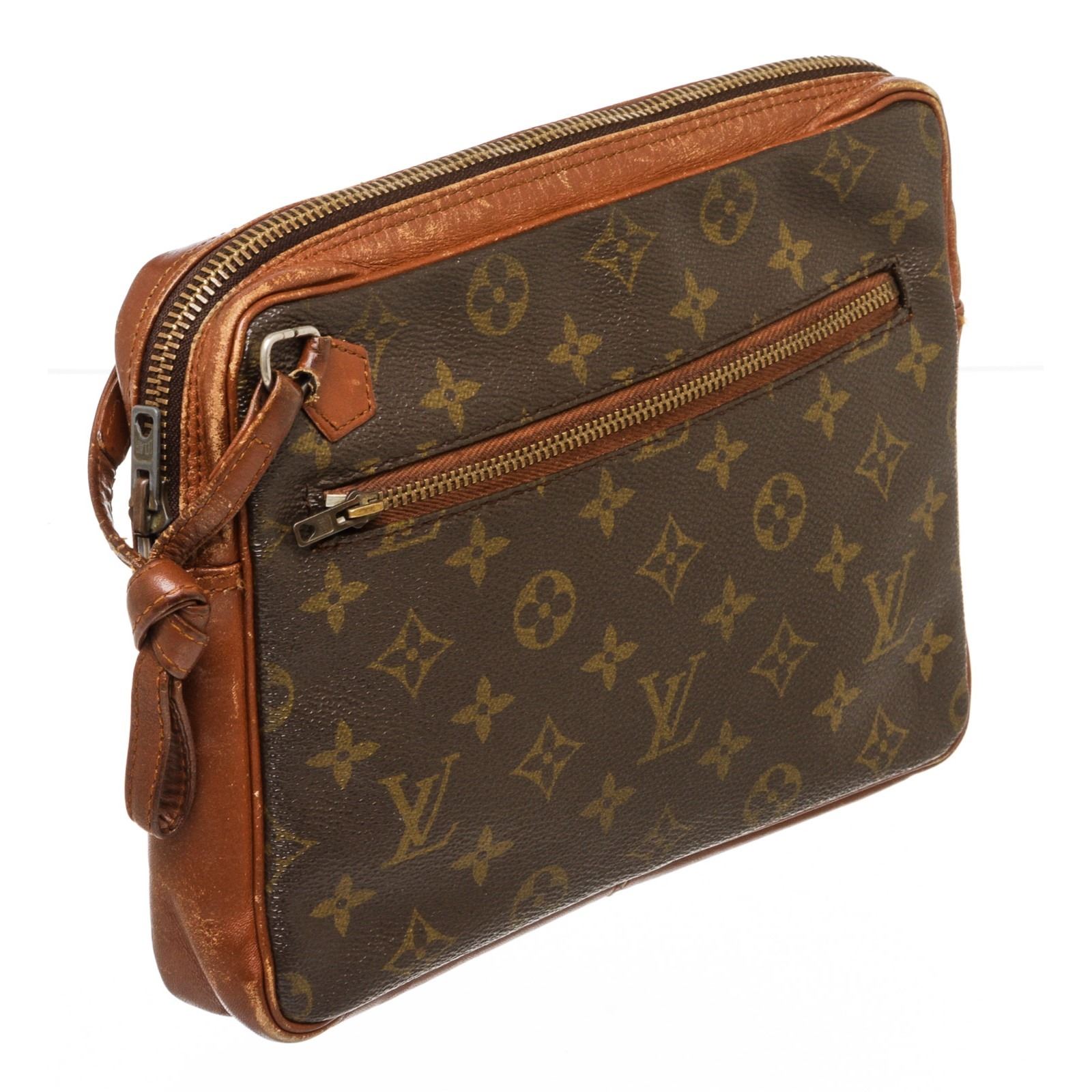 Vintage Monogram canvas leather Louis Vuitton Marly pouch bag with brass tone hardware, exterior zip pocket, brown leather lining, one slip pocket at interior wall and overall zip closure at top.