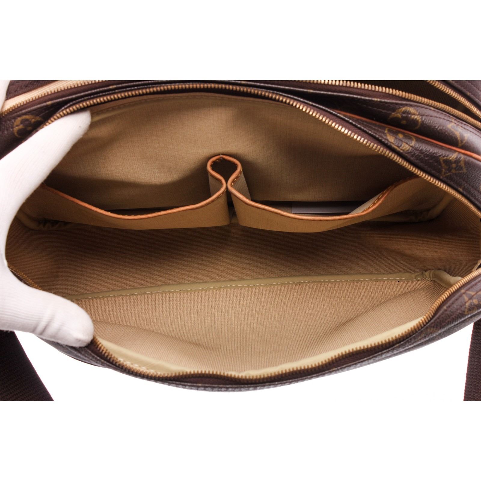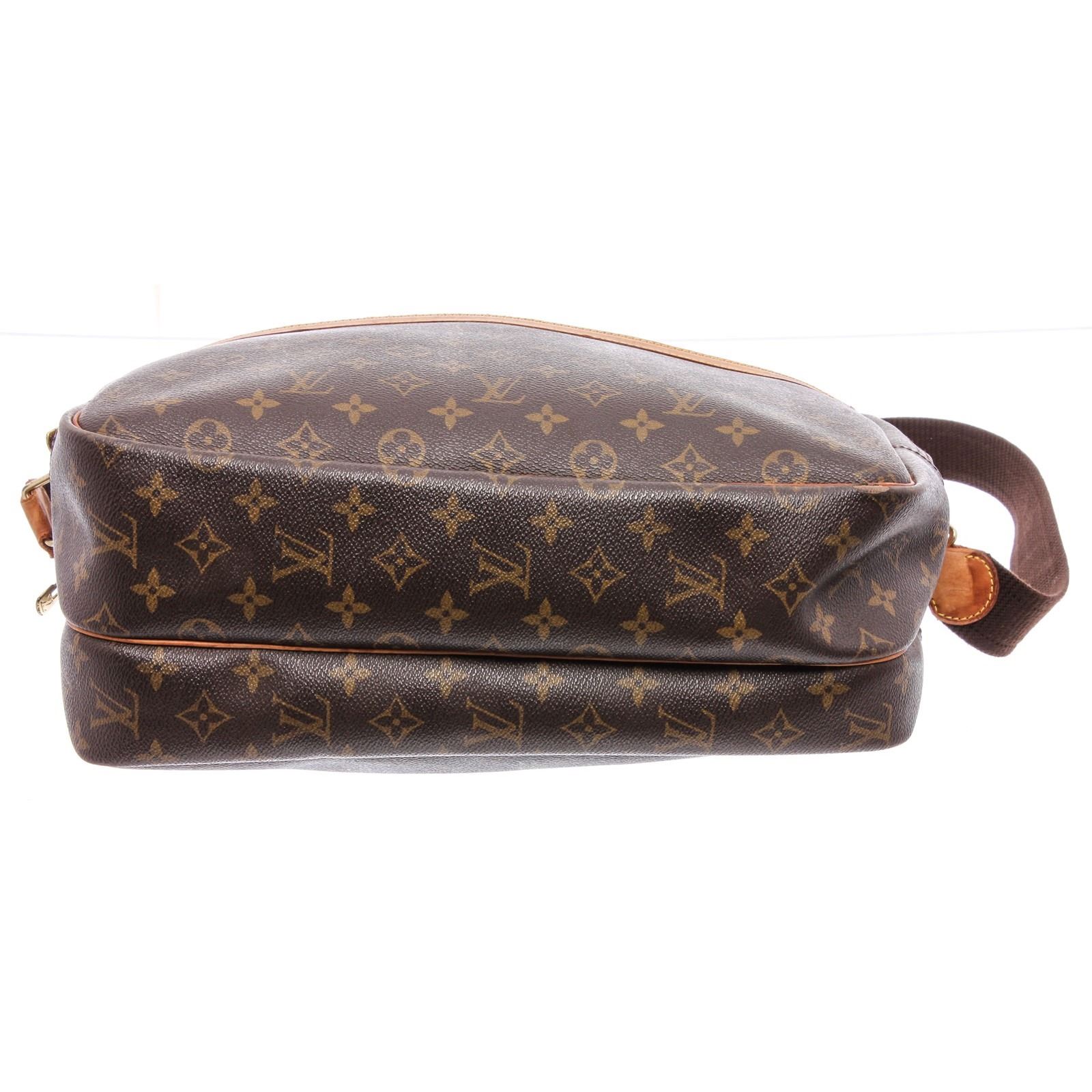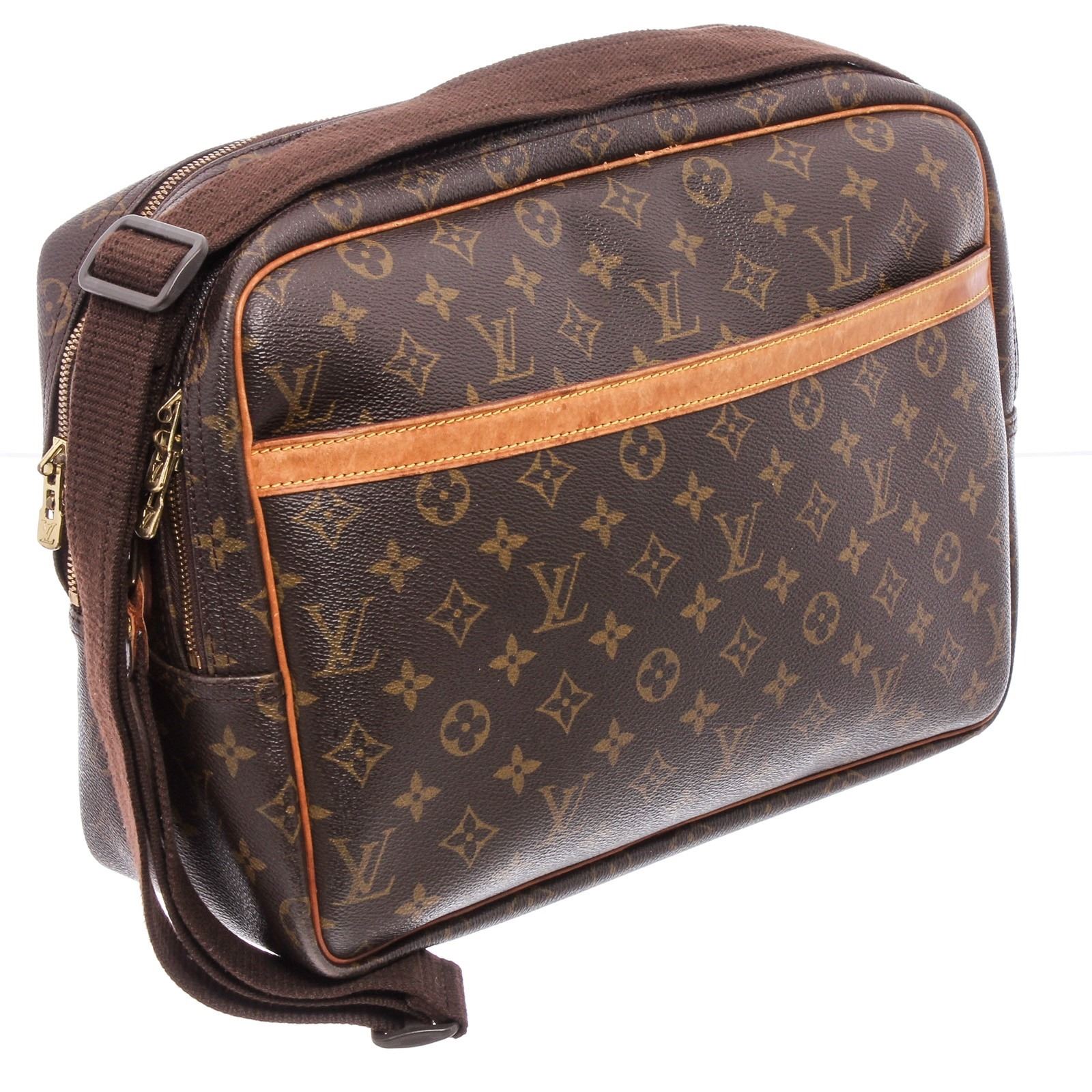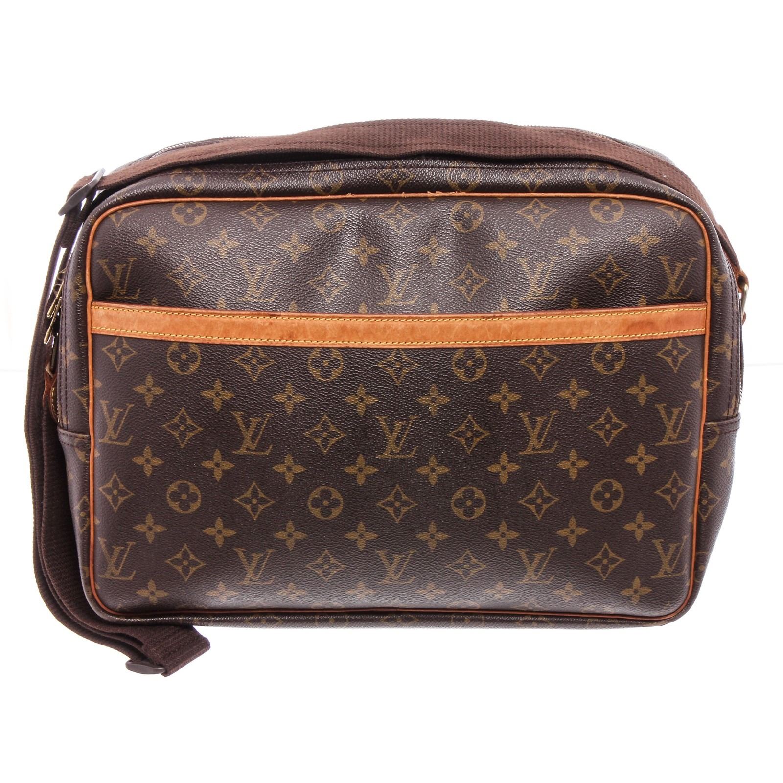 Brown and tan Monogram coated canvas Louis Vuitton Reporter GM with brass hardware, tan vachetta leather trim, adjustable flat shoulder strap, single exterior pocket, beige coated canvas interior, dual interior compartments, dual pockets at interior wall and dual zip closures at top.