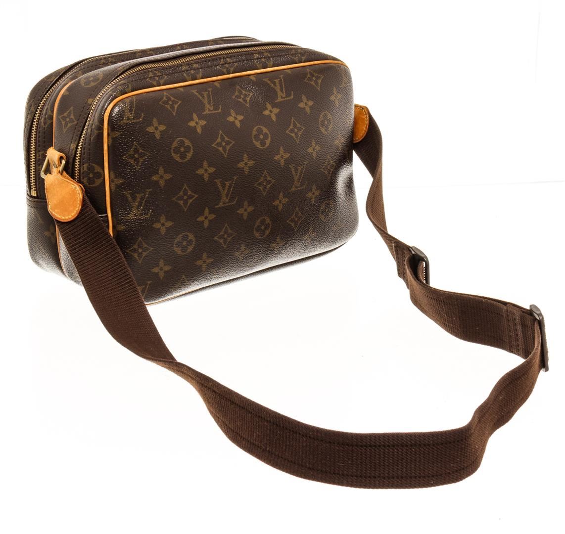 One Louis Vuitton Monogram Reporter PM Shoulder Bag. Item is sold AS-IS. All available information is listed in the description and shown in the photo. Louis Vuitton Monogram Reporter PM shoulder bag with coated canvas exterior, beige fabric lining, adjustable fabric strap, contrasting vachetta leather trims, gold-tone hardware, zipper closure, and one main compartment.