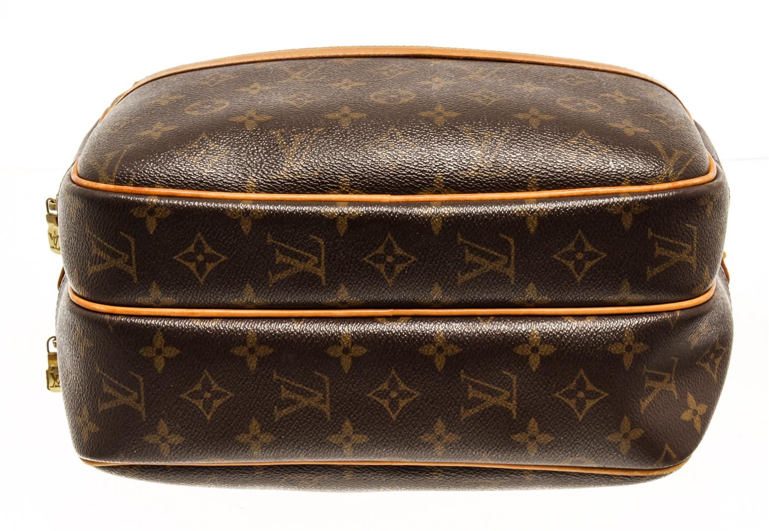 One Louis Vuitton Monogram Reporter PM Shoulder Bag. Item is sold AS-IS. All available information is listed in the description and shown in the photo. Louis Vuitton Monogram Reporter PM shoulder bag with coated canvas exterior, beige fabric lining, adjustable fabric strap, contrasting vachetta leather trims, gold-tone hardware, zipper closure, and one main compartment.
