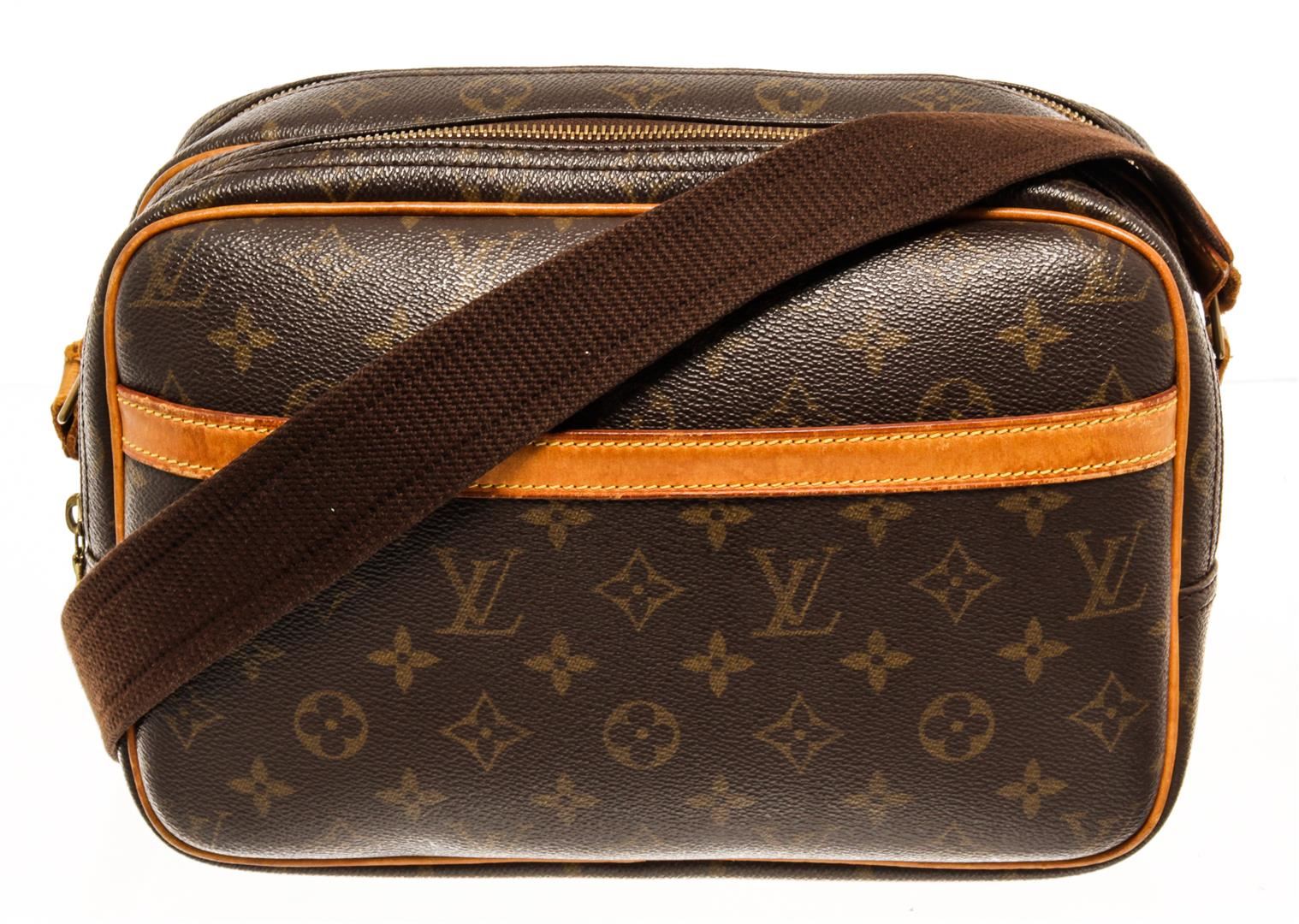 One Louis Vuitton Monogram Reporter PM Shoulder Bag. Item is sold AS-IS. All available information is listed in the description and shown in the photo. Louis Vuitton Monogram Reporter PM shoulder bag with coated canvas exterior, beige fabric lining, adjustable fabric strap, contrasting vachetta leather trims, gold-tone hardware, zipper closure, and one main compartment.
