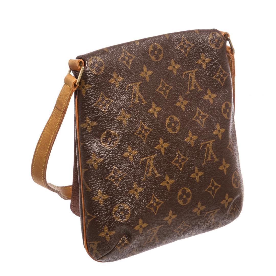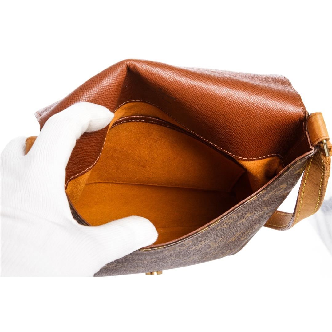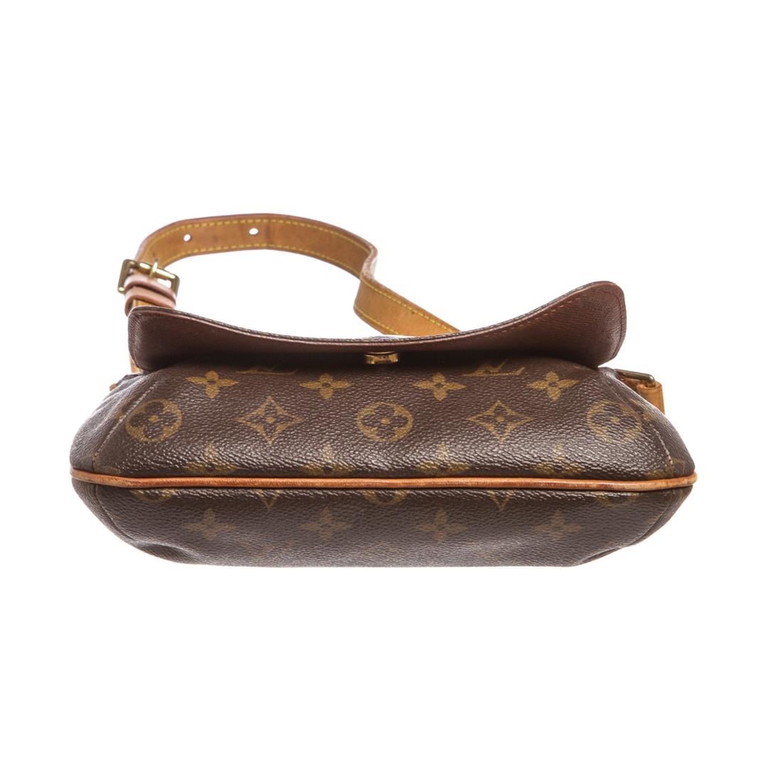 Brown and tan monogram coated canvas Louis Vuitton Musette Salsa bag with brass hardware, tan vachetta leather accents, single flat shoulder strap, cinnamon Alcantara lining, single slit pocket at interior wall and snap closure at front flap. Item is pre-