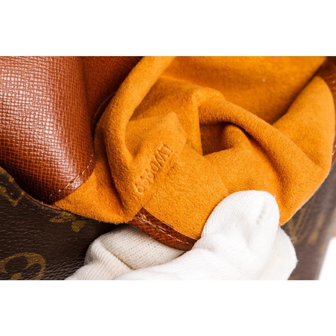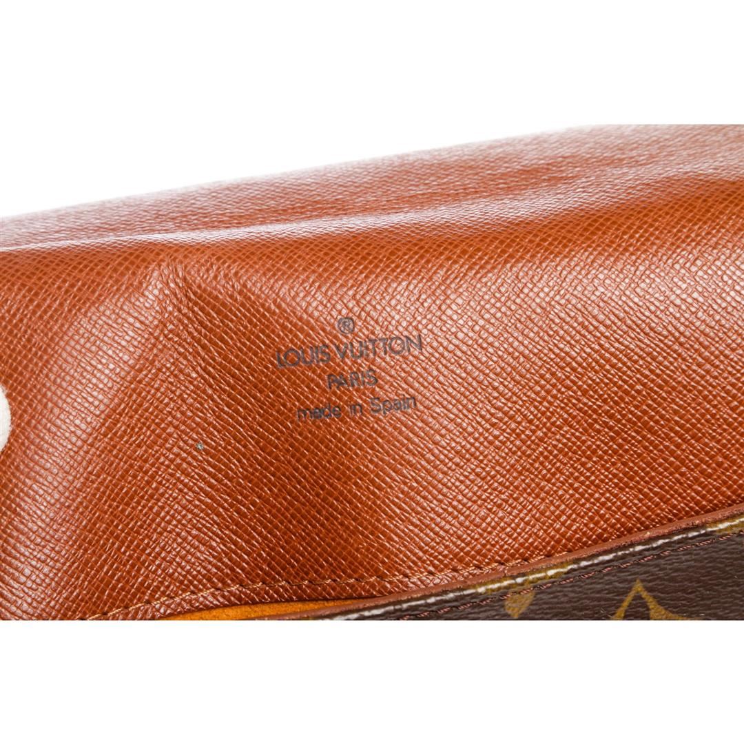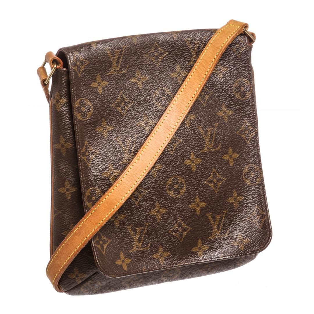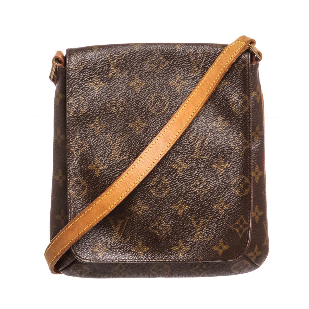 Brown and tan monogram coated canvas Louis Vuitton Musette Salsa bag with brass hardware, tan vachetta leather accents, single flat shoulder strap, cinnamon Alcantara lining, single slit pocket at interior wall and snap closure at front flap. Item is pre-