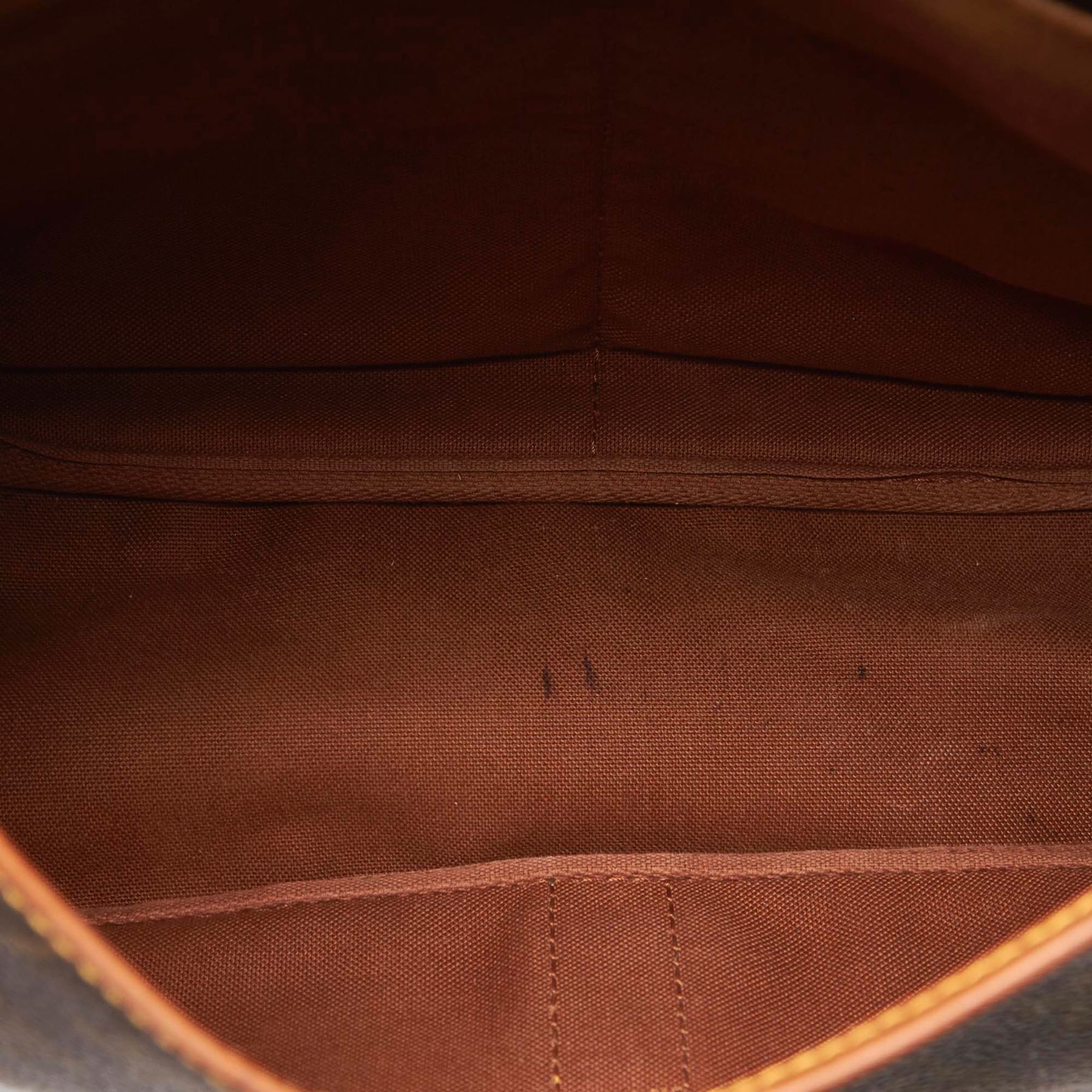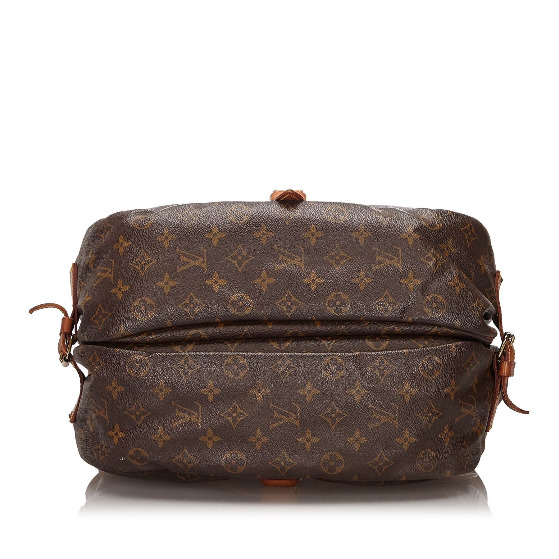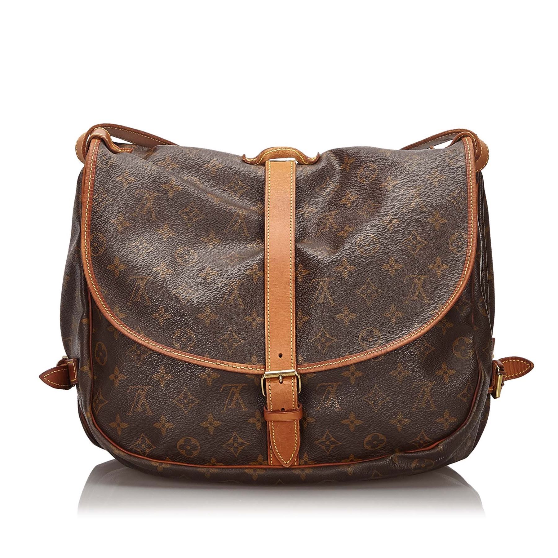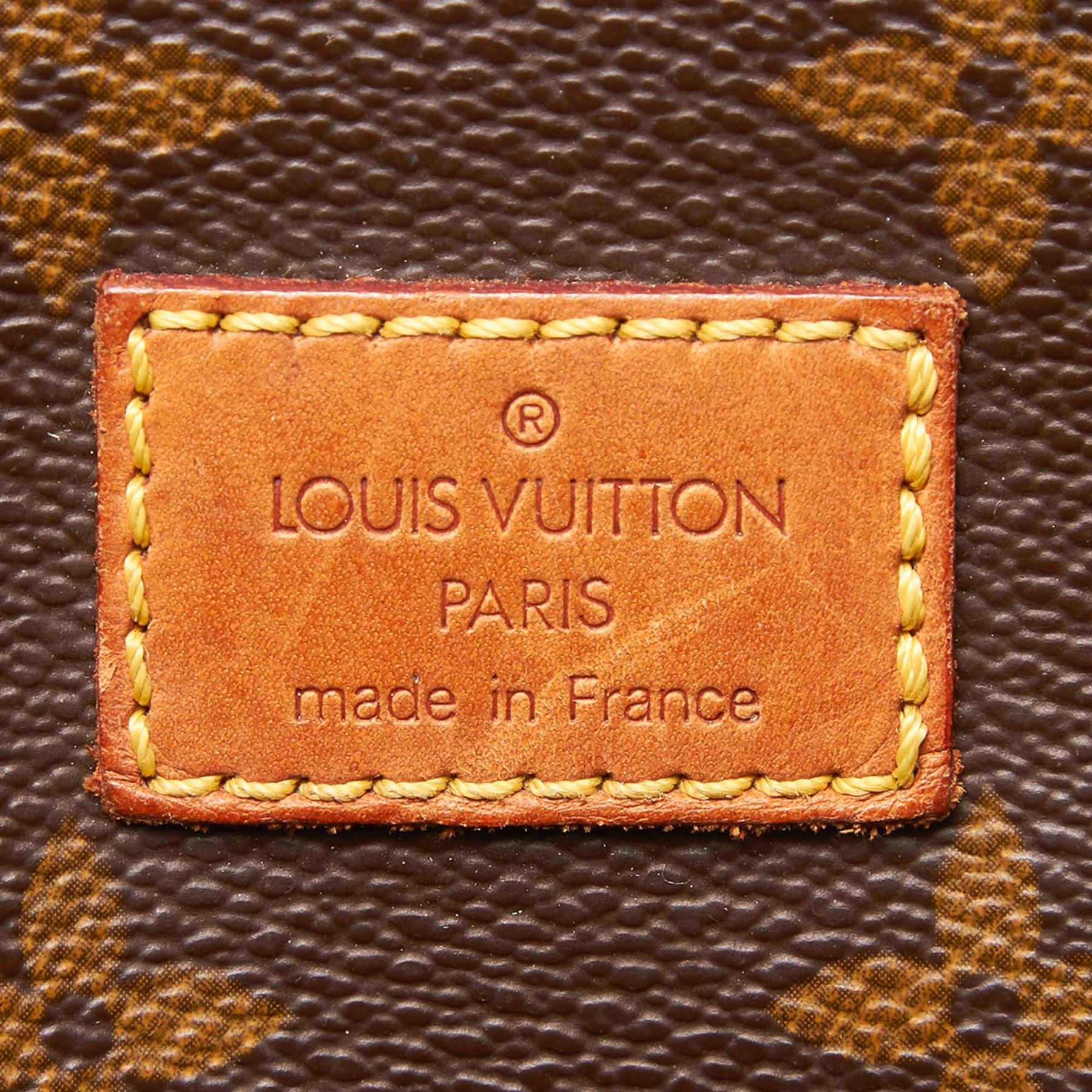 The Saumur 35 features a monogram canvas body, flat leather straps, front flaps with belt buckle closures, dual interior compartments, and interior slip pockets. Canvas x Monogram Canvas x Leather x Vachetta Leather Brown Exterior front is stained and ripped. Exterior back is stained and ripped. Exterior bottom is stained. Exterior handle is stained, discolored and cracked. Exterior side is stained. Interior lining is stained. Zipper is scratched. Studs is tarnished and scratched. Buckle is scratched. Size: 27 x 32 x 23 Card: NO. Louis Vuitton pieces do not come with an authenticity card—please refer to the production date code within the bag for its age and as an authenticity reference. Made in: France