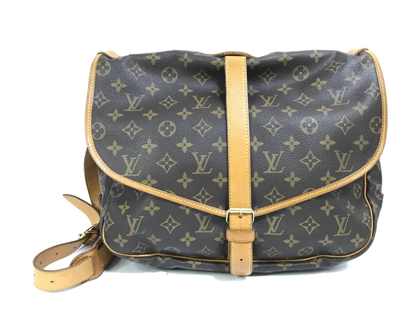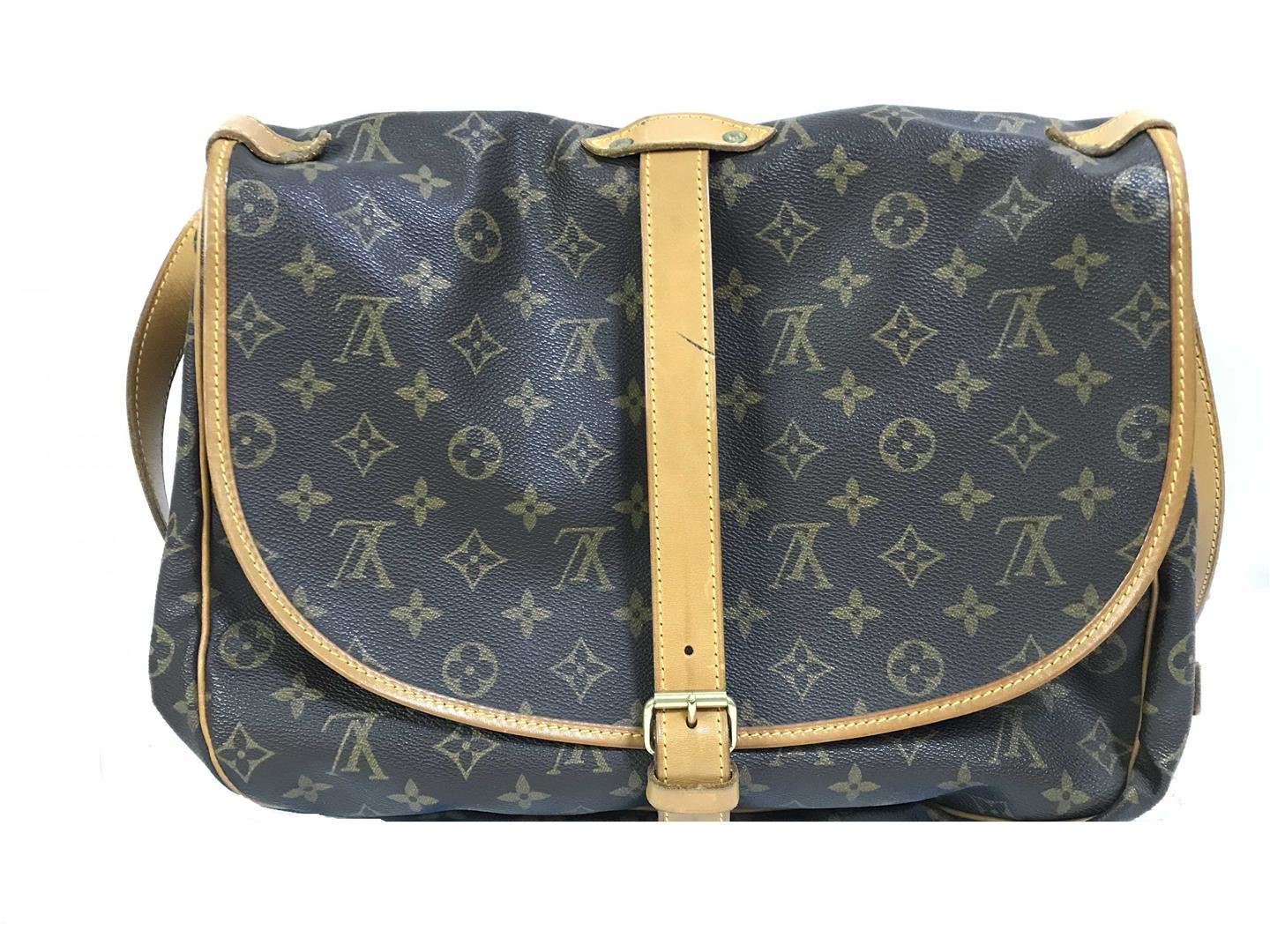 One Louis Vuitton Monogram Saumur 35. Item is sold AS-IS. All available information is listed in the description and shown in the photo. Louis Vuitton Monogram Saumur 35 with adjustable shoulder strap, gold tone hardware, fabric lining, interior pockets, buckle closre.