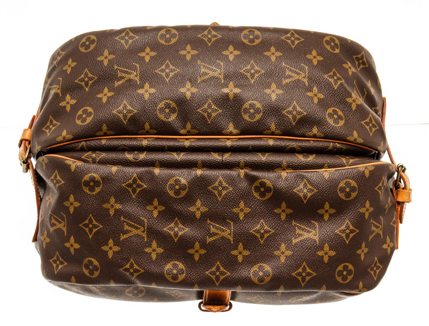 One Louis Vuitton Monogram Saumur 35. Item is sold AS-IS. All available information is listed in the description and shown in the photo. Louis Vuitton Monogram Saumur 35 handbag with coated canvas exterior, brown fabric lining, gold-hardware, contrasting vachetta leather trims and adjustable straps, flap and buckle closure, and two main compartments on each side.