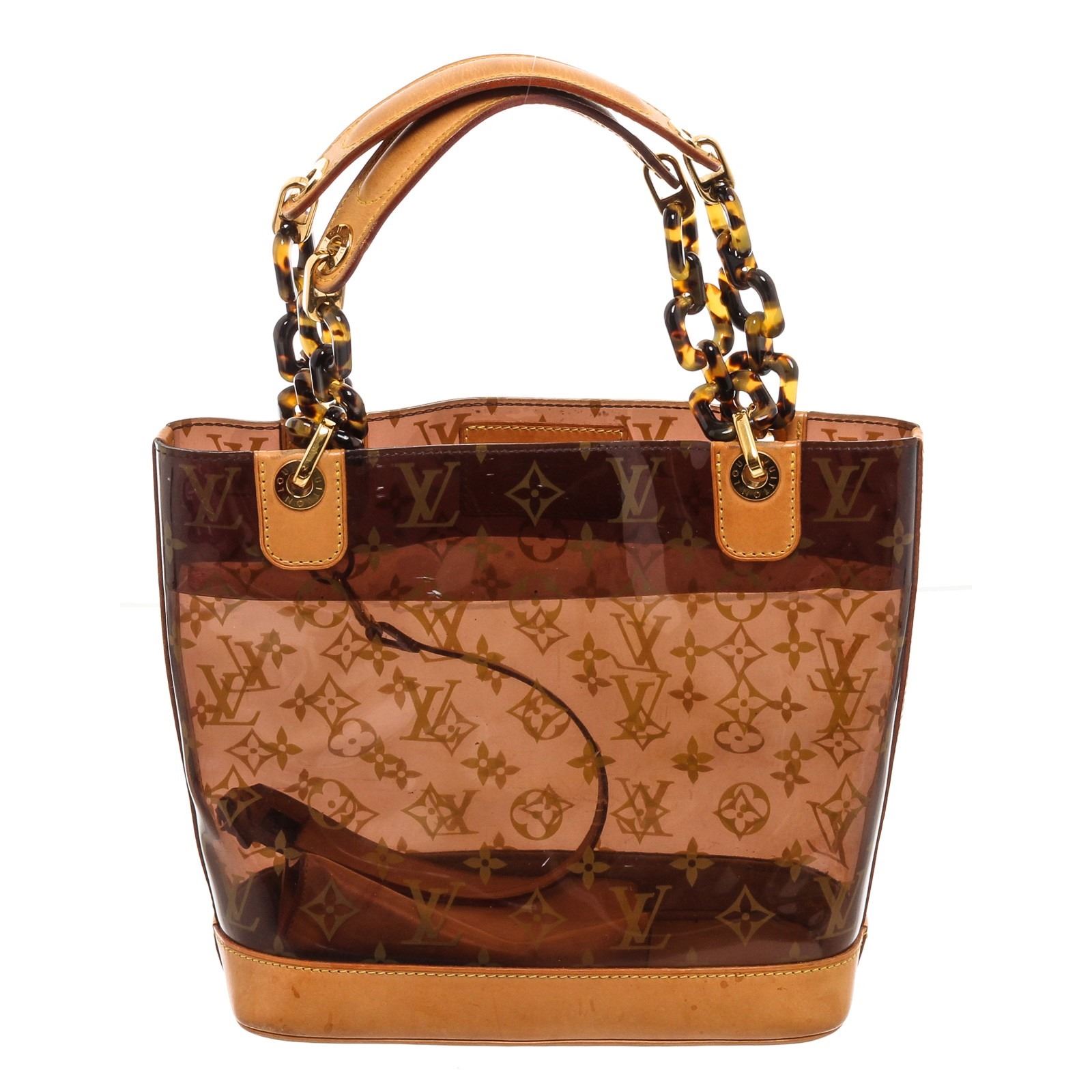 Brown and tan monogram PVC Louis Vuitton Cabas Sac Ambre PM with brass hardware, tan Vachetta leather trim, dual tortoiseshell resin chain-link shoulder straps with shoulder guards, protective feet at base, tonal PVC interior and open top. Includes accompanying zip pouch.
