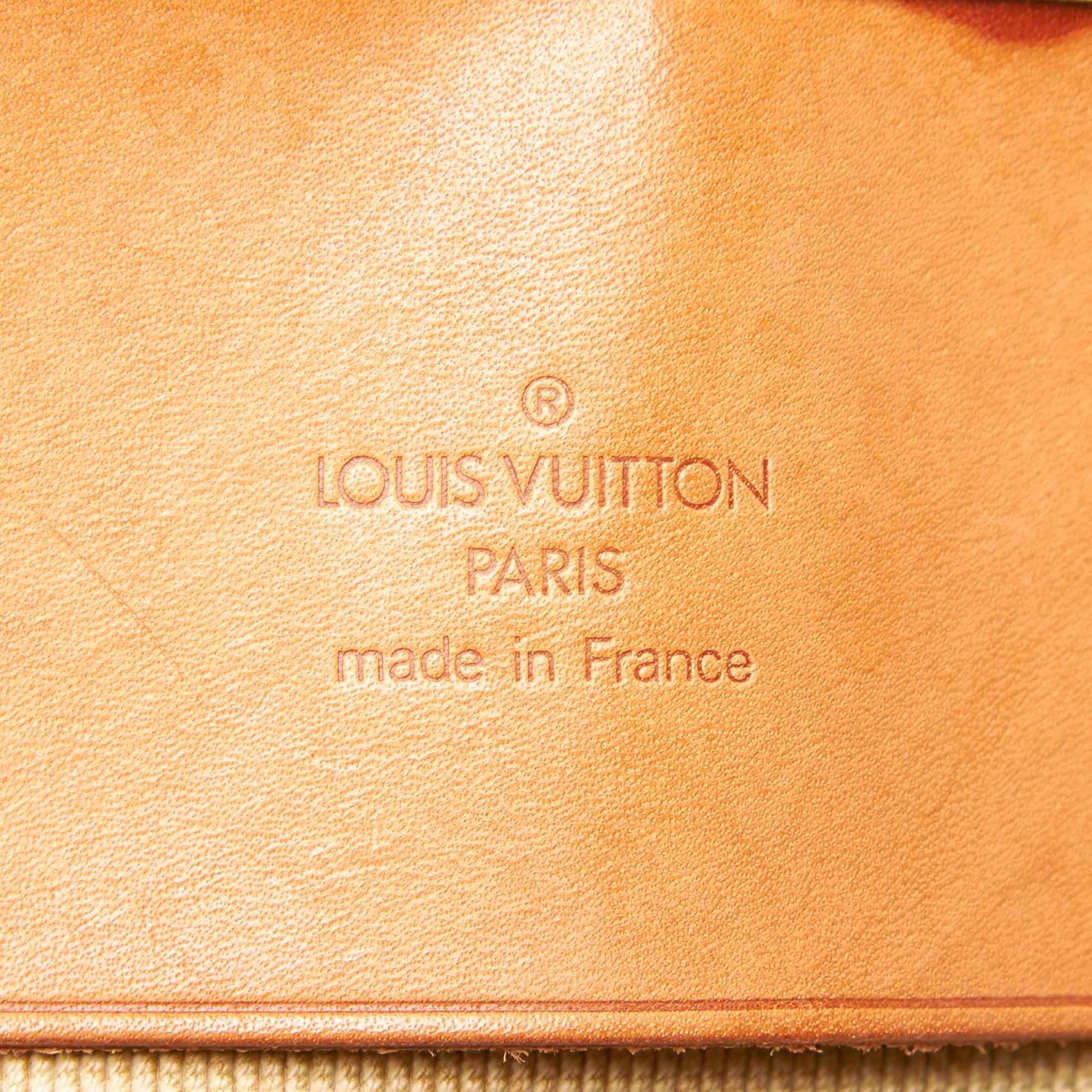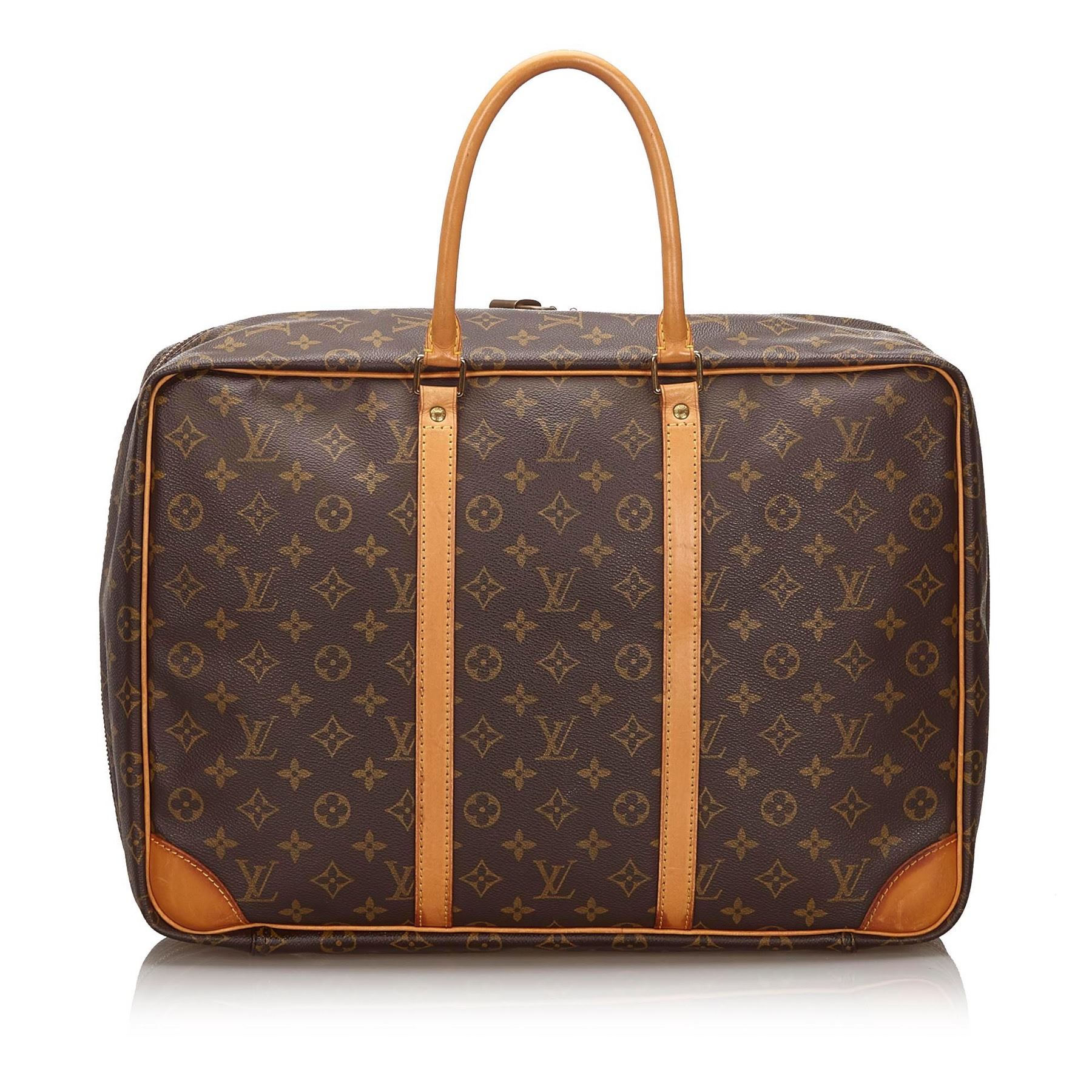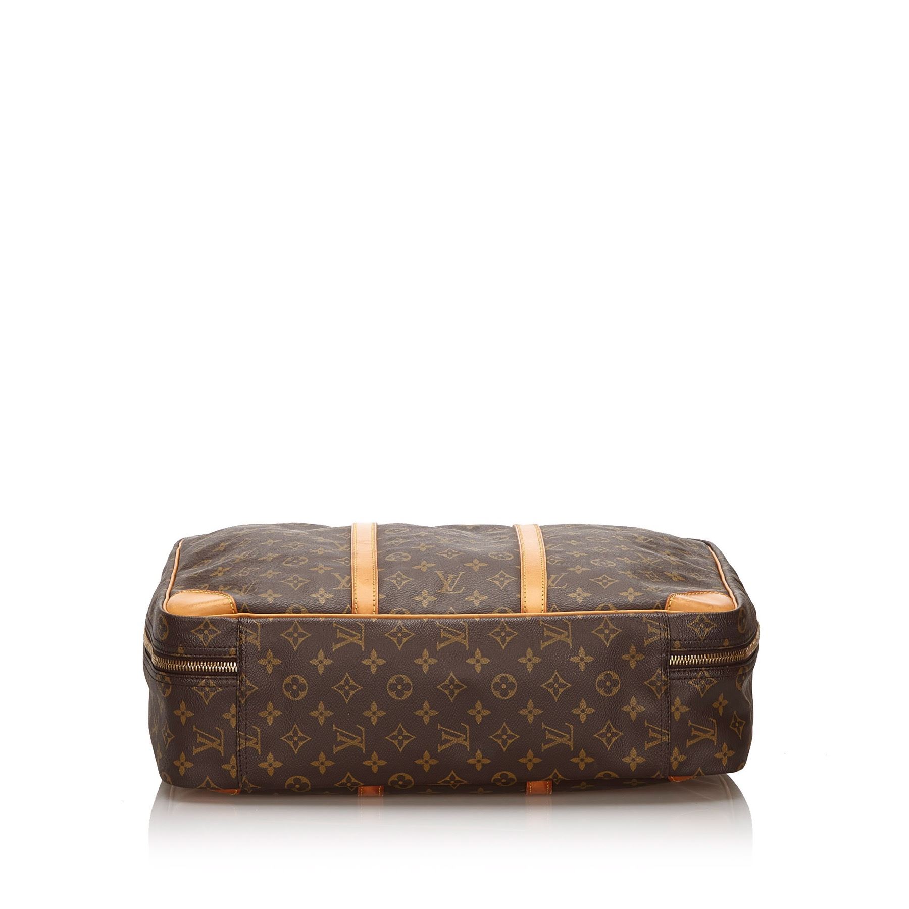 The Sirius 45 features a monogram canvas body with leather trim, rolled leather handles, a zip around closure, and an interior slip compartment. Canvas x Monogram Canvas x Leather x Vachetta Leather Brown Exterior front is stained and scratched. Exterior back is stained with water mark and scratched. Exterior handle is stained with water mark. Interior lining is stained. Interior pocket is stained and out of shape. Studs is rusty and scratched. Padlock is tarnished. Size: 34 x 43 x 16 Card: NO. Louis Vuitton pieces do not come with an authenticity card—please refer to the production date code within the bag for its age and as an authenticity reference. Made in: France