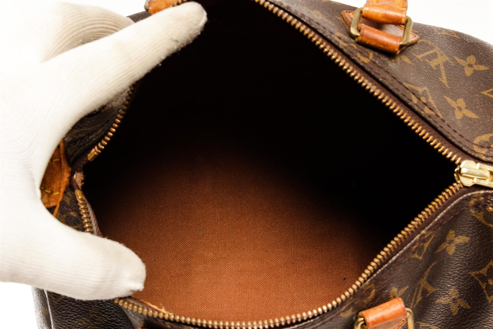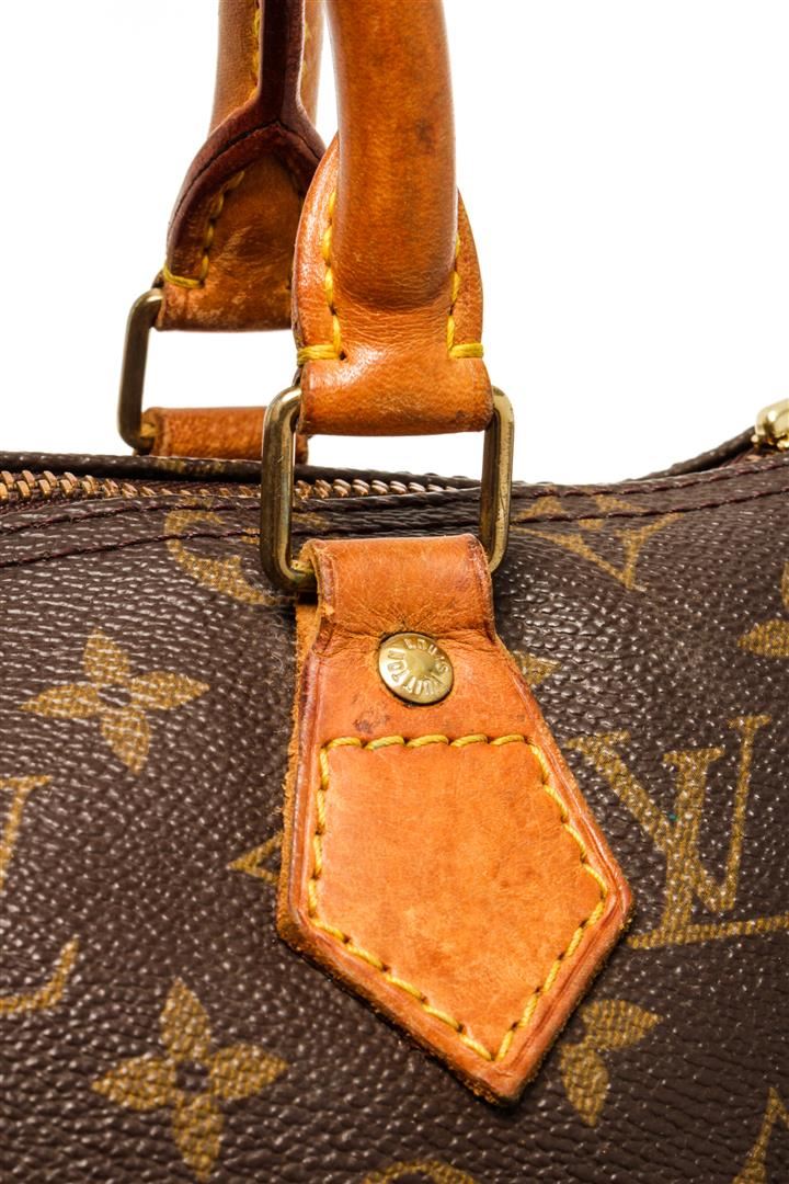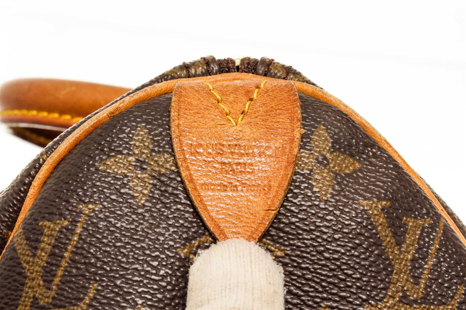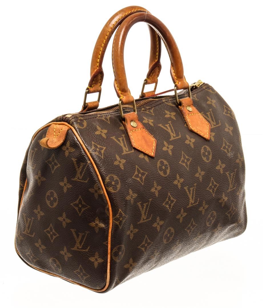 One Louis Vuitton Monogram Speedy 25 Handbag. Item is sold AS-IS. All available information is listed in the description and shown in the photo. Louis Vuitton Monogram Speedy 25 handbag with coated canvas exterior, brown fabric lining, contrasting vachetta leather top handles and trims, gold-tone hardware, zipper closure, and one main compartment with one slip pocket. There is some where on the item please refer to the photos!