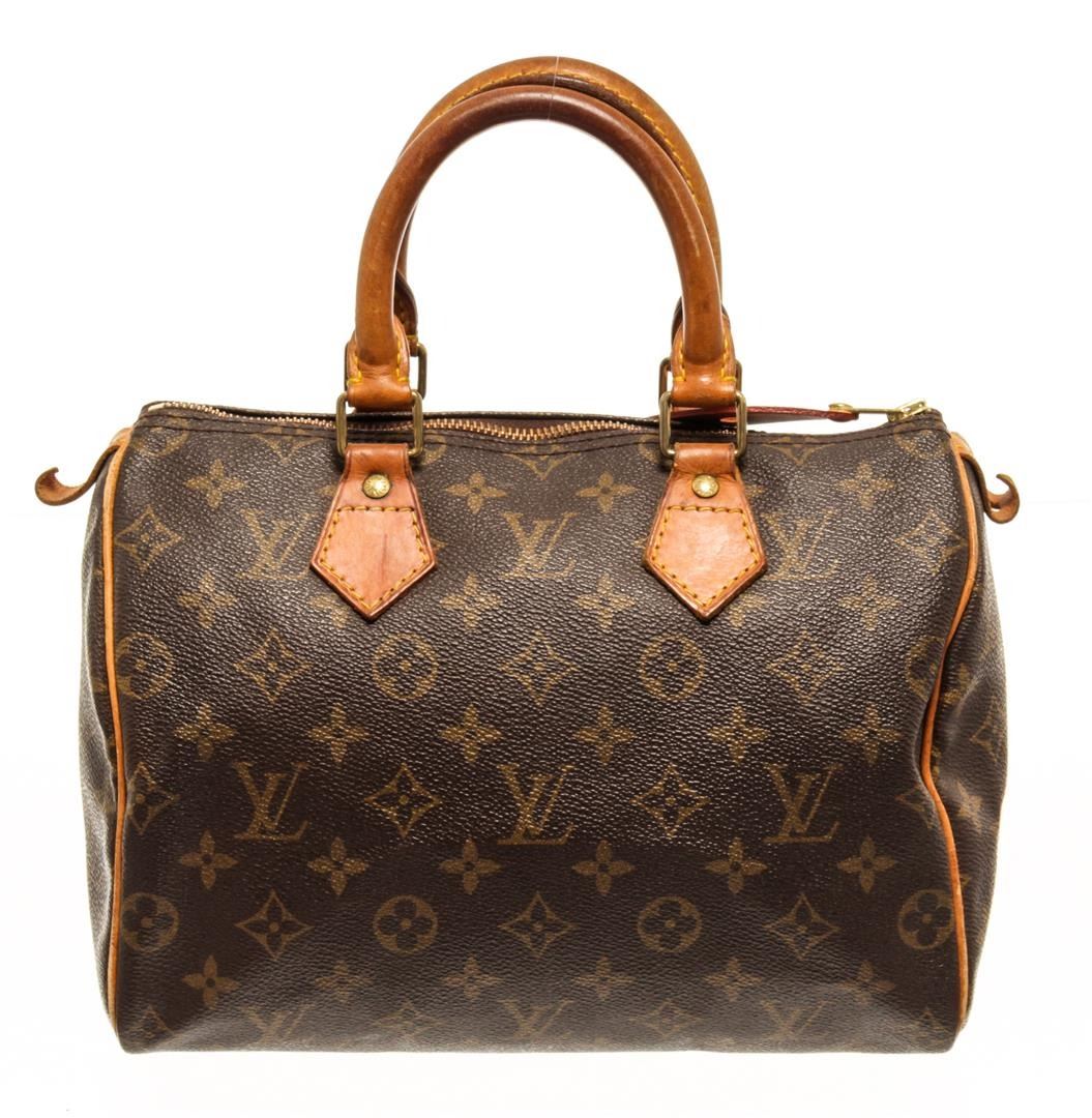 One Louis Vuitton Monogram Speedy 25 Handbag. Item is sold AS-IS. All available information is listed in the description and shown in the photo. Louis Vuitton Monogram Speedy 25 handbag with coated canvas exterior, brown fabric lining, contrasting vachetta leather top handles and trims, gold-tone hardware, zipper closure, and one main compartment with one slip pocket. There is some where on the item please refer to the photos!