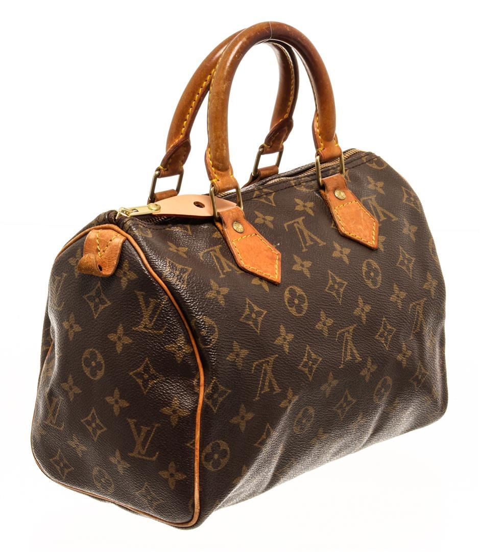 One Louis Vuitton Monogram Speedy 25 Handbag. Item is sold AS-IS. All available information is listed in the description and shown in the photo. Louis Vuitton Monogram Speedy 25 handbag with coated canvas exterior, brown fabric lining, contrasting vachetta leather top handles and trims, gold-tone hardware, zipper closure, and one main compartment with one slip pocket. There is some where on the item please refer to the photos!