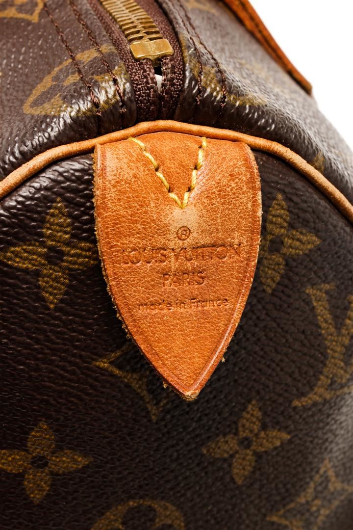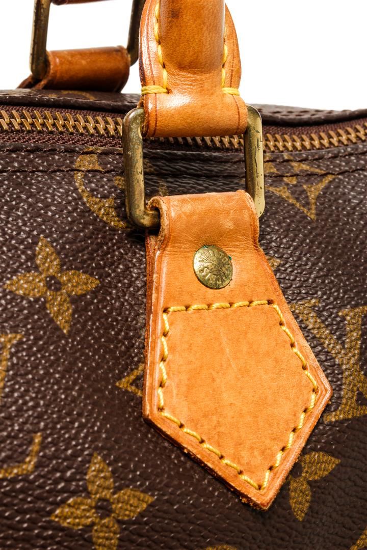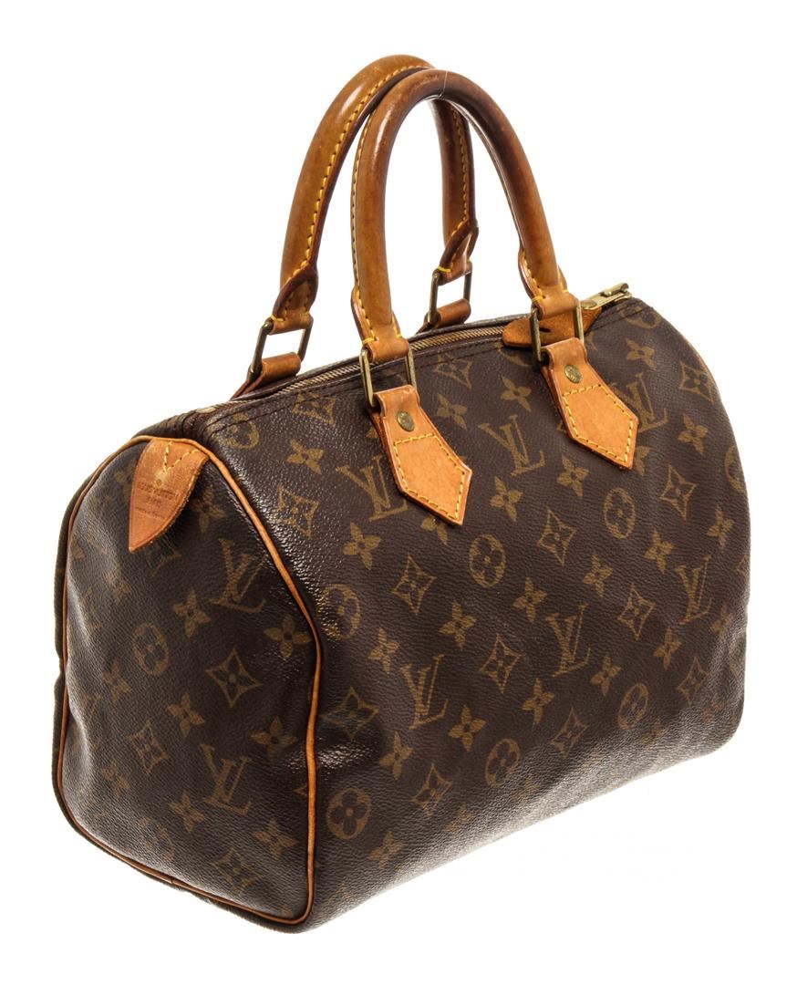 One Louis Vuitton Monogram Speedy 25 Handbag. Item is sold AS-IS. All available information is listed in the description and shown in the photo. Louis Vuitton Monogram Speedy 25 handbag with coated canvas exterior, brown fabric lining, contrasting vachetta leather top handle, gold-tone hardware, zipper closure, one main compartment with one slip pocket.