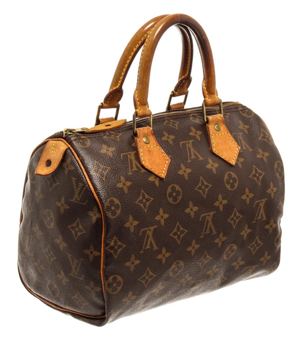 One Louis Vuitton Monogram Speedy 25 Handbag. Item is sold AS-IS. All available information is listed in the description and shown in the photo. Louis Vuitton Monogram Speedy 25 handbag with coated canvas exterior, brown fabric lining, contrasting vachetta leather top handle, gold-tone hardware, zipper closure, one main compartment with one slip pocket.