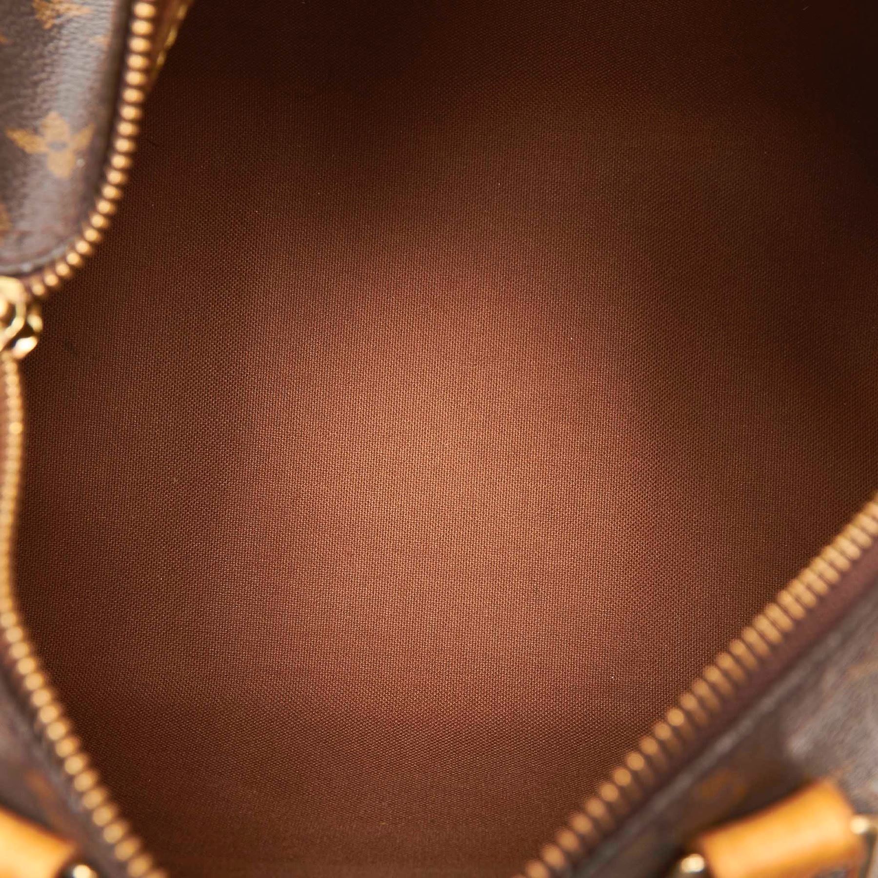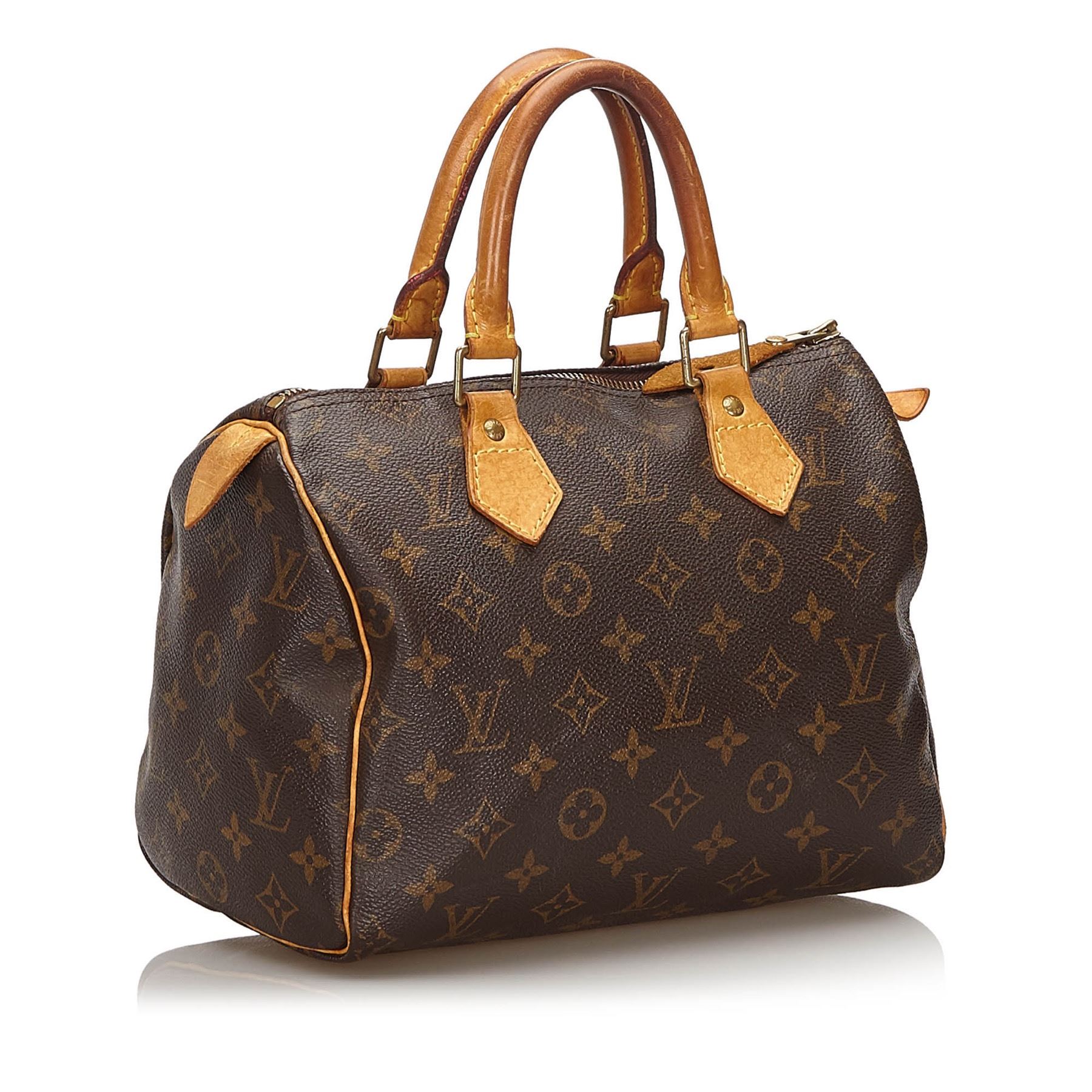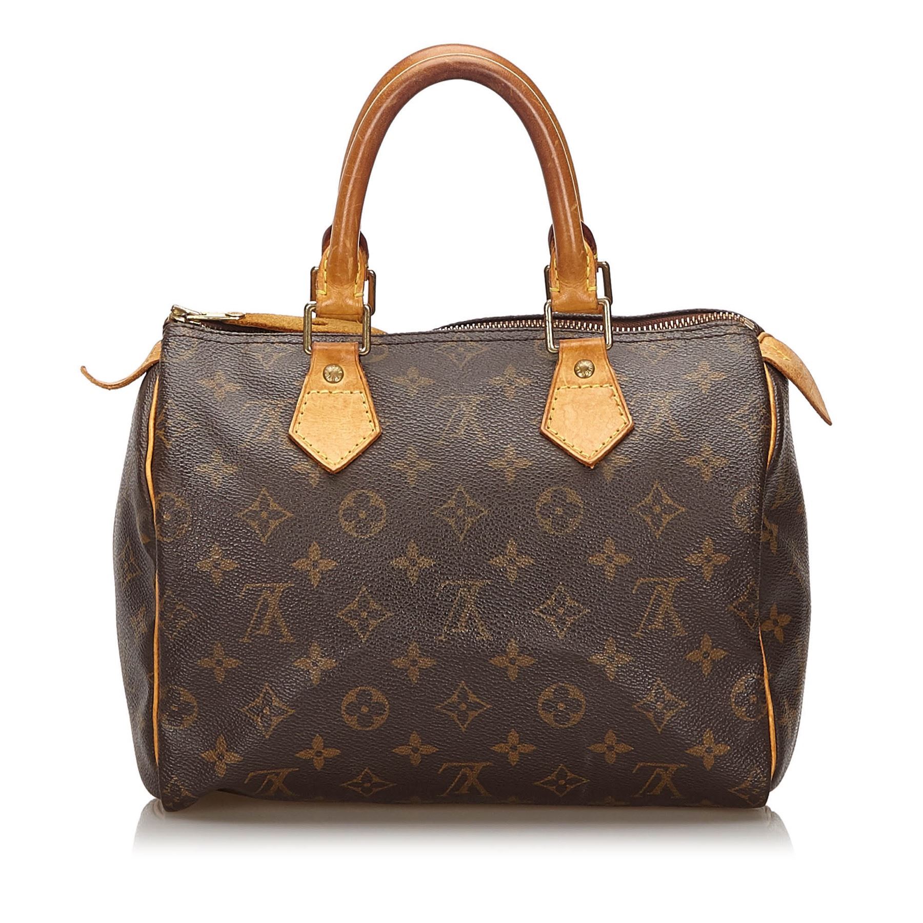 The Speedy 25 features a monogram canvas body, rolled leather handles, a top zip closure, and an interior slip pocket. Canvas x Monogram Canvas x Leather x Vachetta Leather Brown Exterior front is stained with water mark. Exterior back is stained with water mark. Exterior handle is stained, discolored and scratched. Exterior corners is scratched. Exterior side is scratched. Zipper is scratched. Studs is scratched. Size: 19 x 25 x 15 Card: NO. Louis Vuitton pieces do not come with an authenticity card—please refer to the production date code within the bag for its age and as an authenticity reference. Made in: France