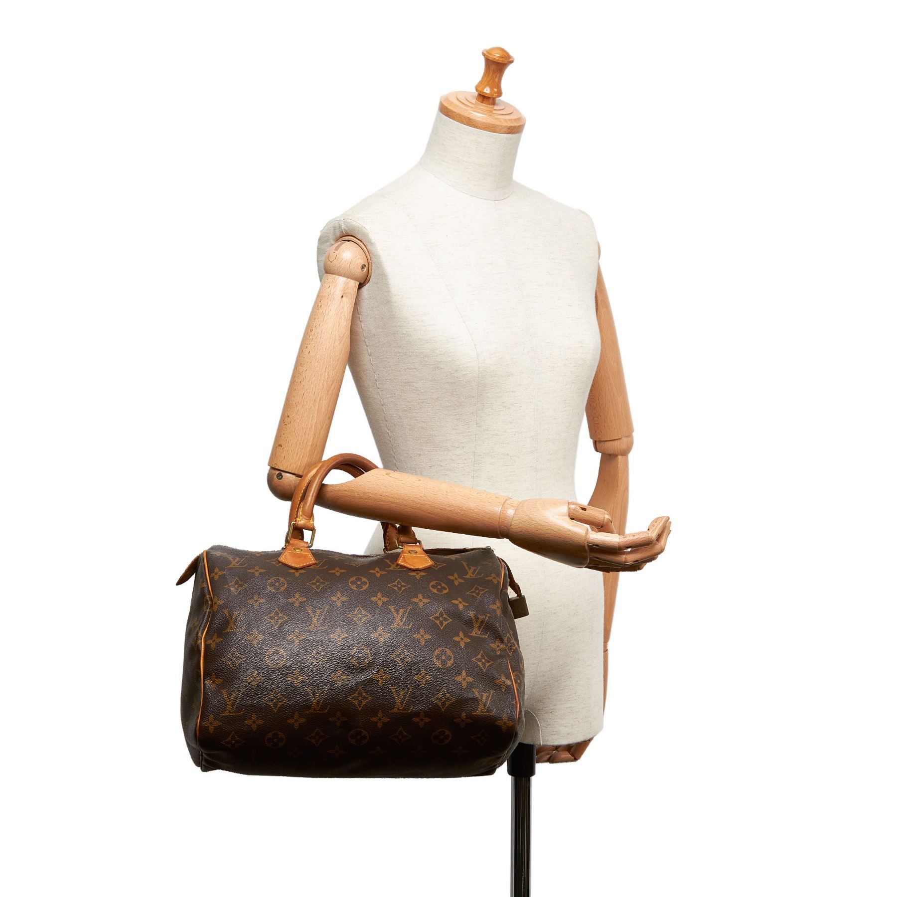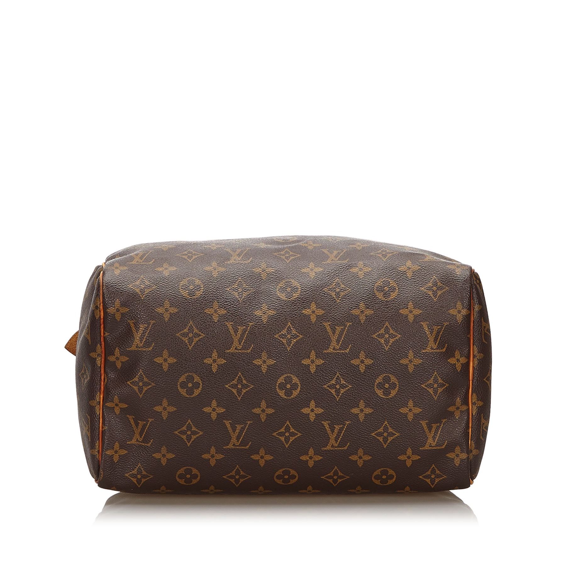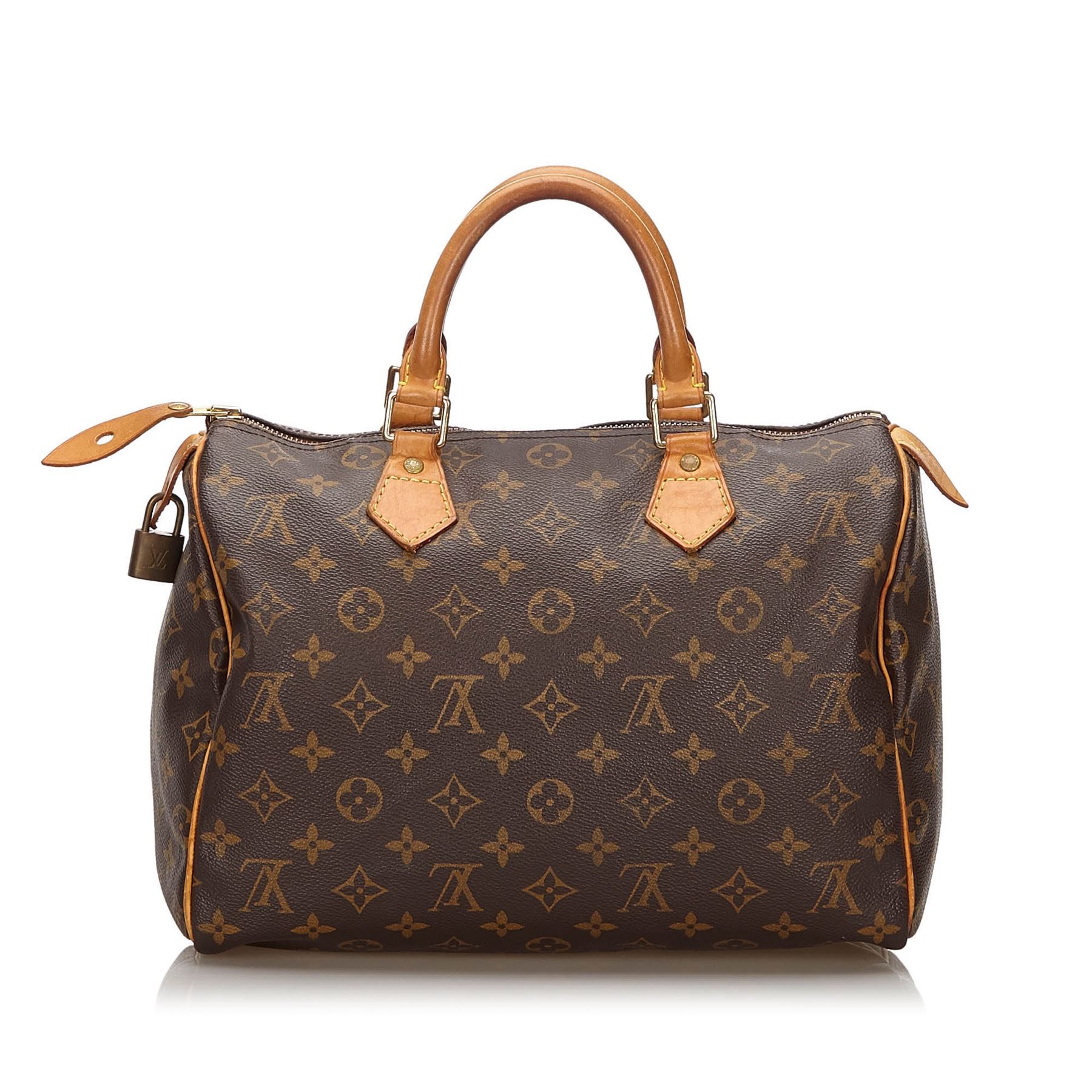 The Speedy 30 features the Monogram canvas, vachetta handles and trim, a top zip closure, and an interior pocket. Canvas x Monogram Canvas x Leather x Vachetta Leather Brown Exterior front is stained with water mark. Exterior back is stained with water mark. Exterior bottom is stained with water mark. Exterior handle is stained, discolored and scratched. Exterior corners is scratched. Exterior side is stained and scratched. Interior lining is stained with water mark. Interior pocket is stained. Zipper is scratched. Studs is rusty and scratched. Key is tarnished. Size: 20 x 30 x 10.5 Card: NO. Louis Vuitton pieces do not come with an authenticity card—please refer to the production date code within the bag for its age and as an authenticity reference. Made in: France