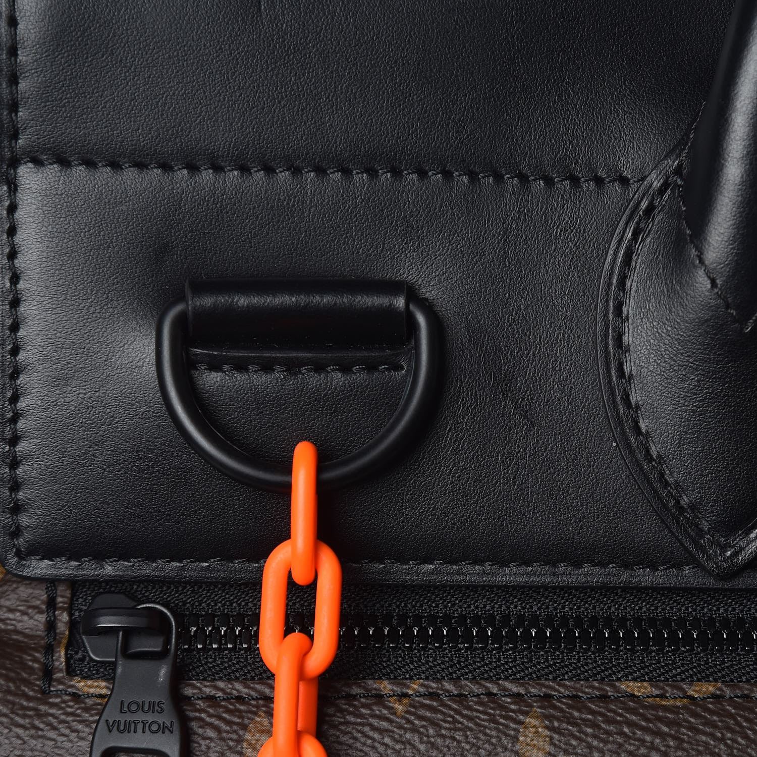 Shoulder bag from Virgil Abloh's collection is featured in classic Louis Vuitton monogram canvas in brown. The bag features an optional black shoulder strap and black and bright orange hardware. This opens to a black fabric interior with patch pockets.