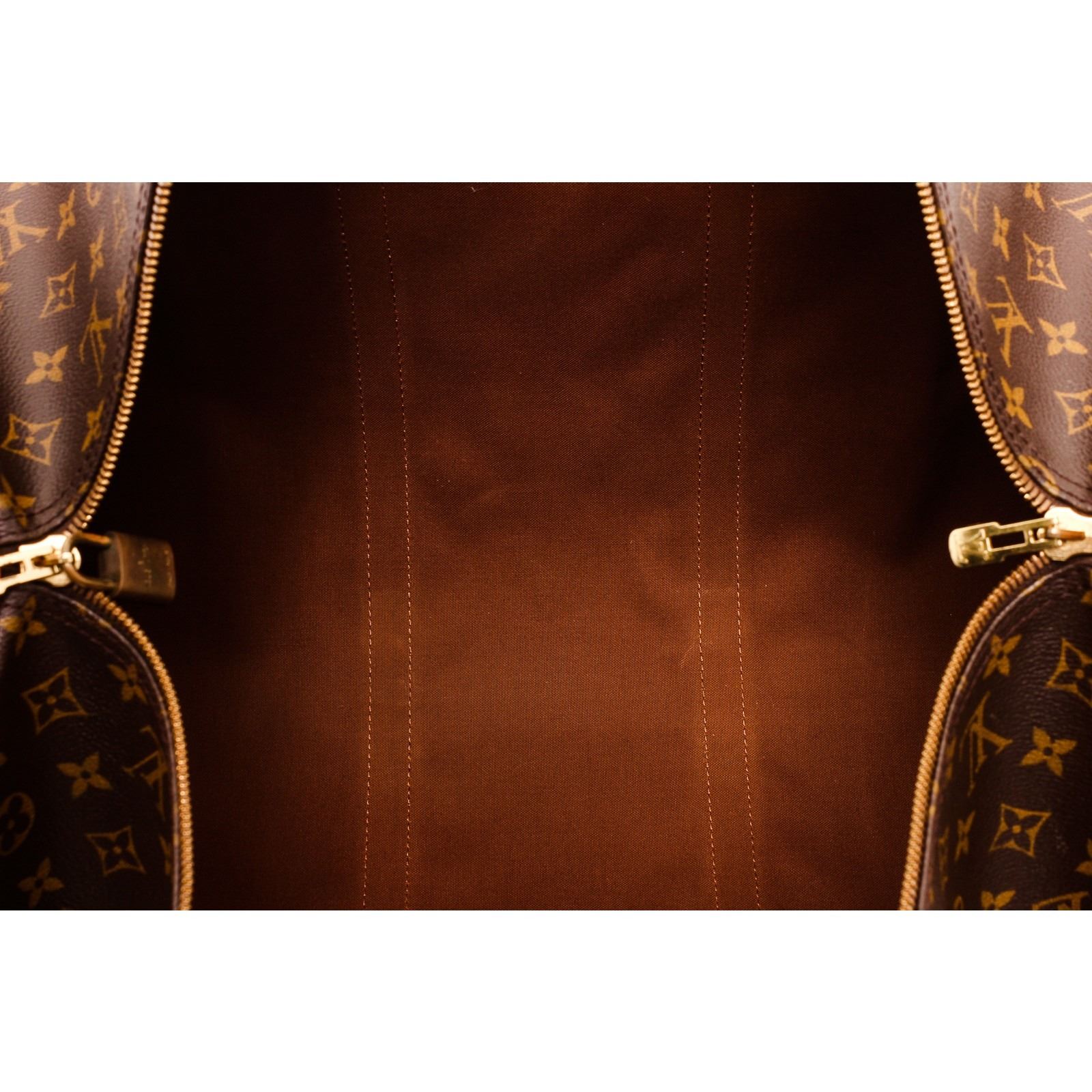 Brown and tan monogram coated canvas Louis Vuitton Keepall 60 Bandouliere with brass hardware, tan vachetta leather trim, dual rolled handles, brown canvas lining and zip closure at top. Detachable Strap.