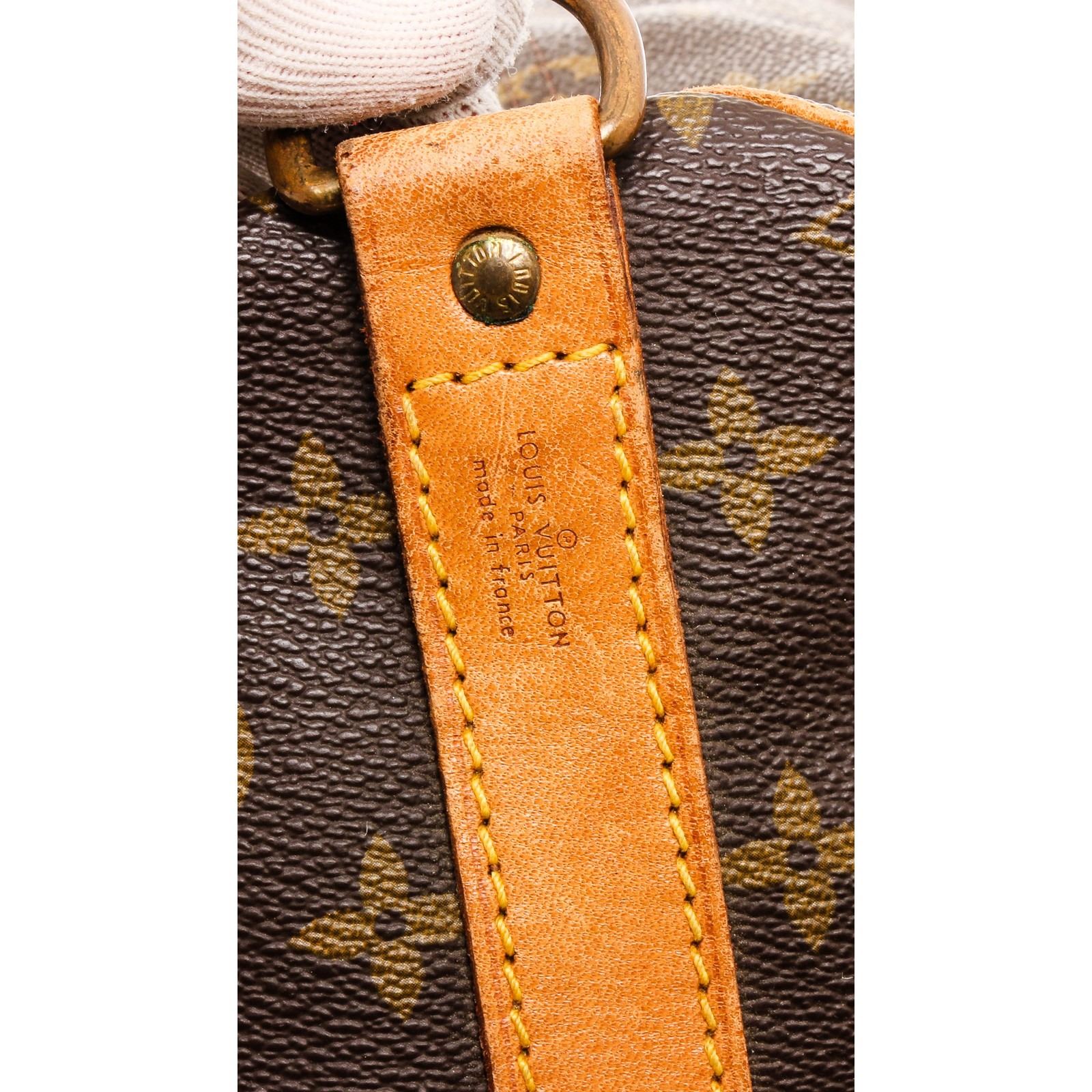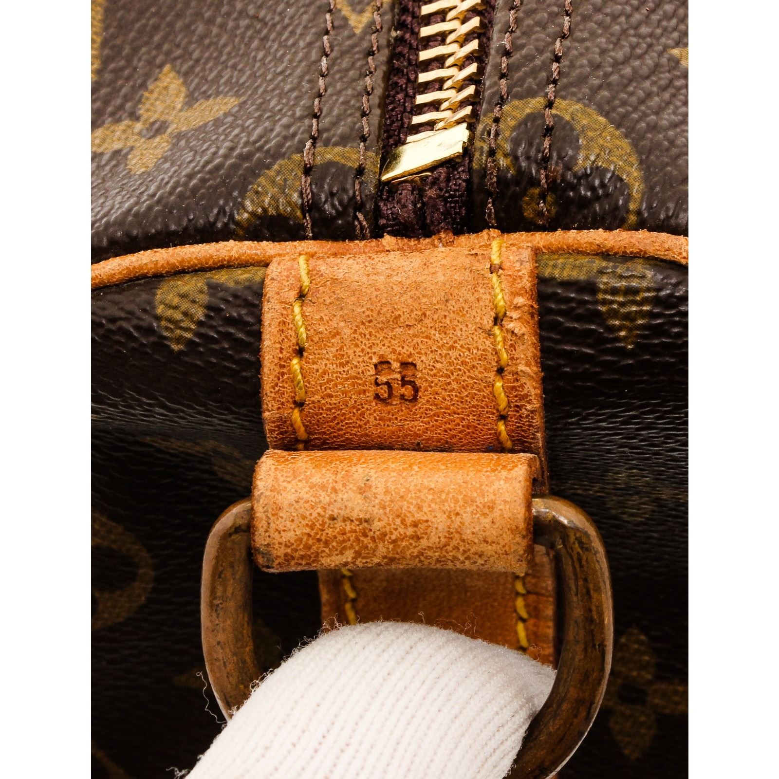 Brown and tan monogram coated canvas Louis Vuitton Keepall 55 with brass hardware, tan vachetta leather trim featuring yellow contrast stitching, dual rolled top handles, luggage tag, brown canvas lining and zip closure at top. PLEASE NOTE: Handle leather professionally repaired/enforced.