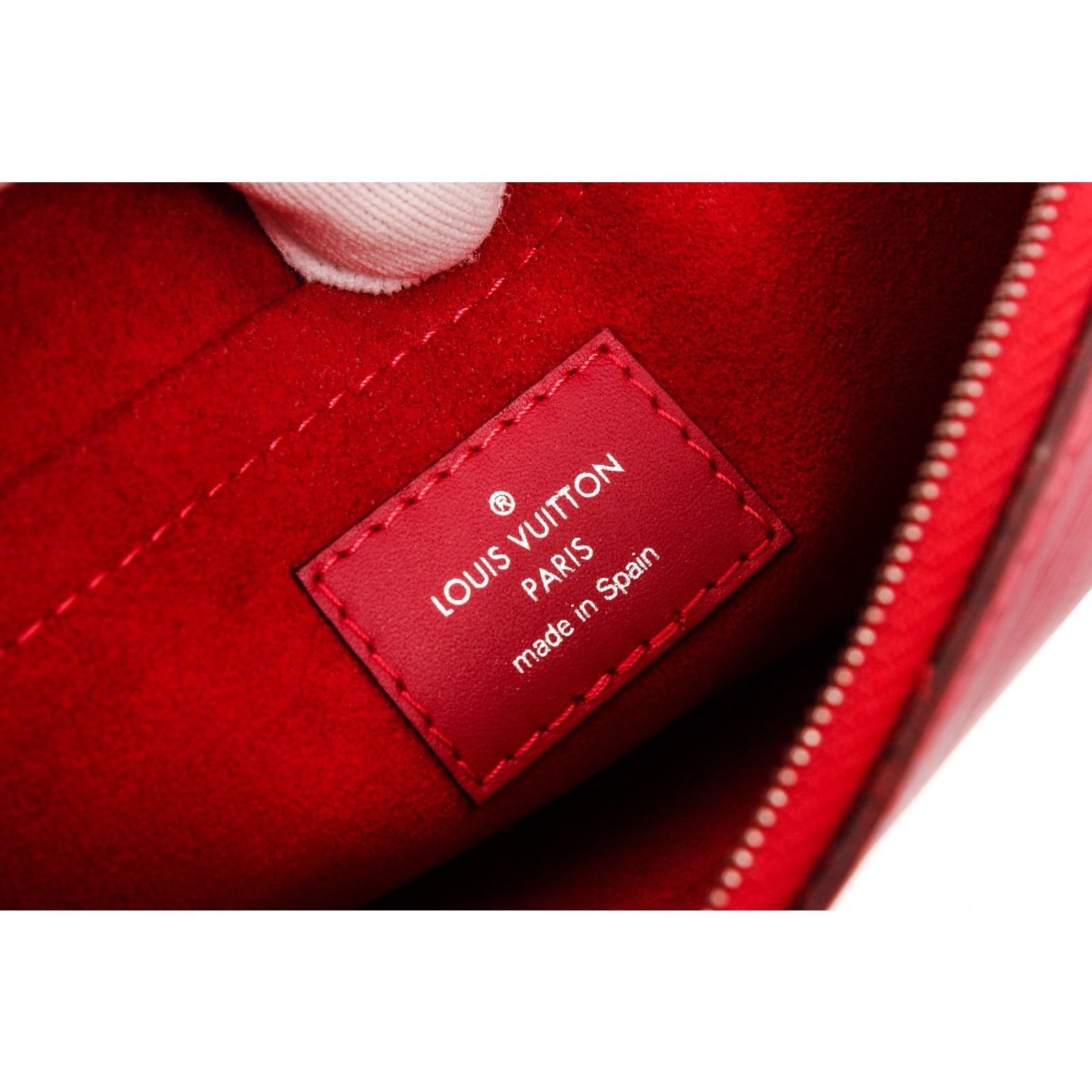Fuschia Epi leather Louis Vuitton Neverfull MM with silver-tone hardware, dual flat shoulder straps, drawstring adornments at sides, tonal Alcantara lining, detachable zip pouch at interior and clasp closure at top.